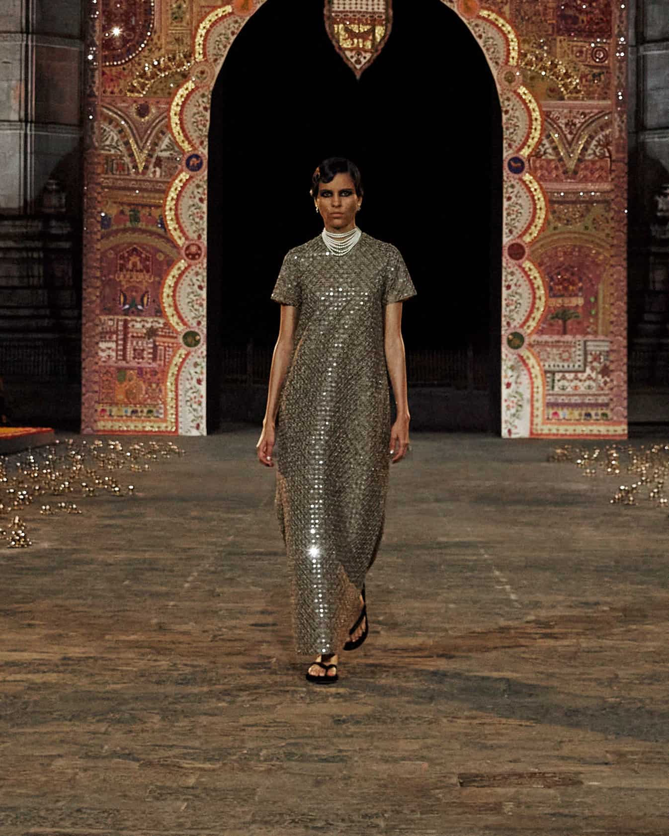Mere weeks after her Paris Fashion Week outing, Dior’s Maria Grazia Chiuri took us on another journey—this time to Mumbai. With a staggering 99-look collection, it’s safe to say no time, energy, or expense was spared as the artistic director presented a love letter to the country’s incredible artisans and traditions. The synergy between Dior and Indian embroidery houses goes way back, and the maison’s top designers over the last several decades have often shown against the vivid and colorful backdrop of the country. Since she took the helm, Chiuri has collaborated with the non-profit Chanakya School of Craft countless times, but in this instance, it was an all-out celebration of that relationship with a well-attended show in the city itself. At the Gateway of India ceremonial arch-monument, models took to the marigold-lined catwalk to showcase the awe-inspiring work of the 700 women currently enrolled at Chanakya School of Craft. As always, Chiuri paid homage to her predecessors at the luxury label (in this case, Marc Bohan, who had shown collections in India in the early 1960s, who was referenced in the color blocking). Tipping her hat to her adopted home for the evening, Chiuri also showed sophisticated evening coats and straight skirts inspired by the sari and traditional Indian cuts, peacock and floral prints that evoked Bollywood visuals, a take on the celebrated Indian rani pink, and a new Dior Toile de Jouy fabric reimagined through a tropical Indian landscape.