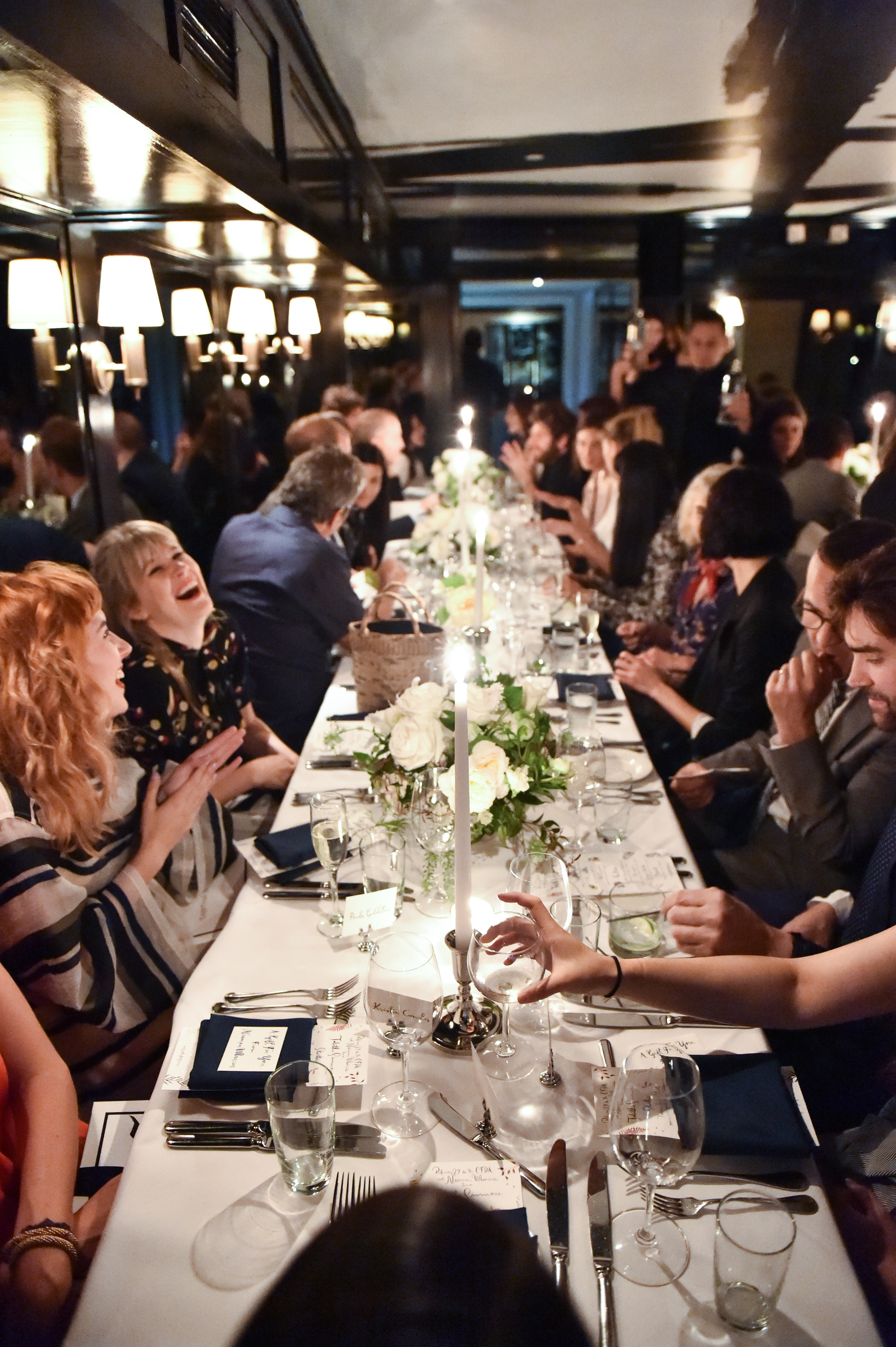 Post-drinks, guests sat down for dinner. Two long tables were decked with tall lit candles and white flower arrangements, plus some great party favors: Tabitha Simmons clutches in a range of colors and patterns, and gift cards to Neiman Marcus. Who made the cut for the dinner of 50 industry peeps? Alexa Chung, Jessica Hart, and Tali Lennox, plus designers including Andrew Rosen, Eddie Borgo, Marchesa’s Georgina Chapman, Lulu Frost’s Lisa Salzer, and more.