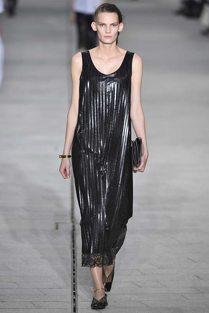 Lucie and Luke Meier made their debut at Jil Sander this season. The duo had previously worked at brands like Dior and Supreme making for an interesting combined design perspective. The collection played true to Jil Sander’s minimalist aesthetic with long white gowns made from men’s shirting and overcoats made from suiting. But the vibe was romantic, not stern. Even a leather pleated shift dress was adorned with lace at the hem and a select burst of color was inserted into the collection for a breath of fresh air including a stunning sky blue checked, sheer turtleneck gown. It was a bright and somewhat cautious debut by the Meiers, with signs that they may be willing to spread their wings in the future.