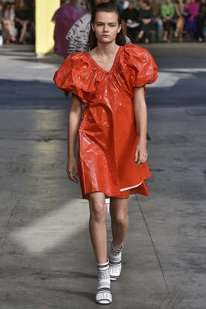 Massimo Giorgetti is able to focus entirely on his own collection now that he no longer has Pucci as a responsibility, and the collection this season reflected the weight off his shoulders. There was a sense of fun and optimism in his tie-dyed knits or in his exuberant baby doll dresses in white ruffles, one worn with an ’80s windbreaker, or in a red crumpled vinyl. A grapefruit pink plaid denim ensemble or a watercolor print pajama look rounded out this entirely Instagramworthy collection.