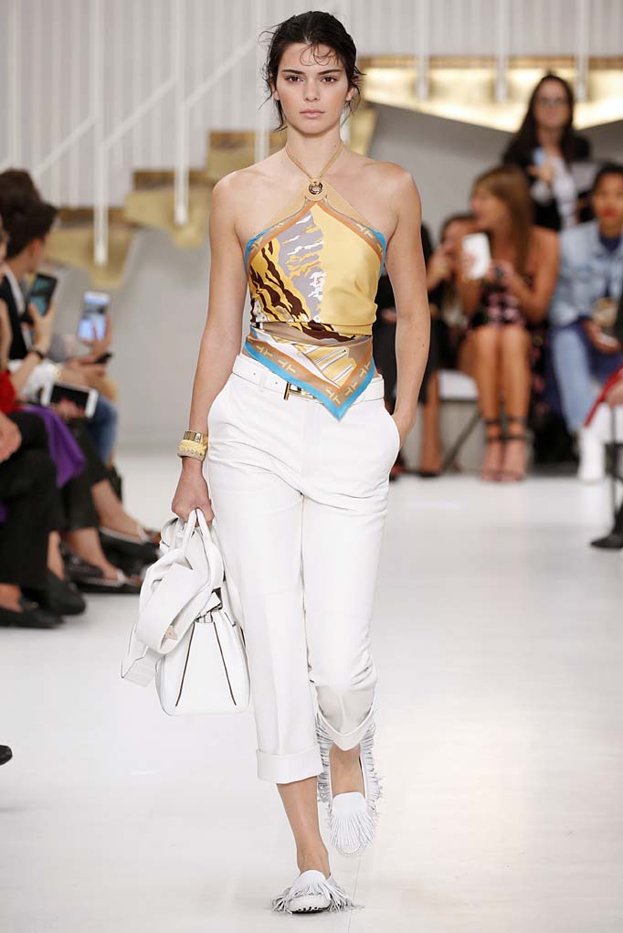 On the other side of the spectrum, Tod’s did “casual” with all of the utterly rich subtleties for which it is known. Take a white windbreaker style shirt tucked into a matching wrap around skirt with a high-slit and a pair of Tod’s loafers, which exuded the kind of elegance expected of blue-blooded women. Sporty pieces, like an anorak (in full leather) on Caroline Trentini, have never looked quite so luxe while looking so relaxed. But for those wanting to flaunt their wealth a little more visibly? A Dijon mustard colored shiny leather ensemble on Chiara Leone should do the trick. But surely a ‘90s moment must exist! Indeed, Kendall Jenner opened the show in a kerchief halter.