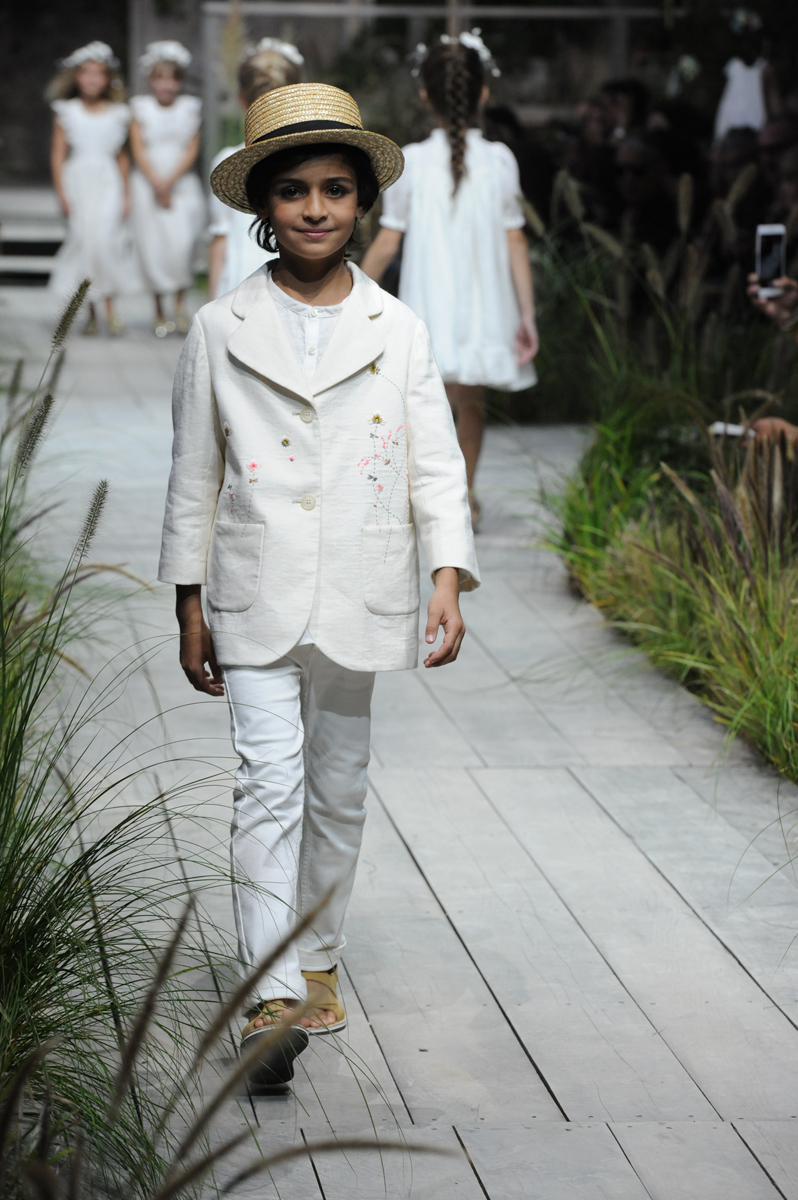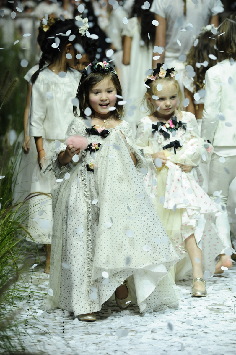 The Bonpoint show at the Jardin du Luxembourg was perhaps one of the most enjoyable shows in Paris all week. What could be more fun than seeing a bunch of absolutely adorable smiling children sweetly parading down a runway made to look like a country cottage? Children trotted out in Bonpoint’s chic clothing to celebrate the brand’s 40th anniversary. Moments like two little girls holding hands and licking lollipops or a hyper little boy showing off down the runway were a nice reprieve from the usual fashion fare. For the finale, the children walked as petals fell from above, and Marie-Agnès Gillot put on a surprise dance performance.