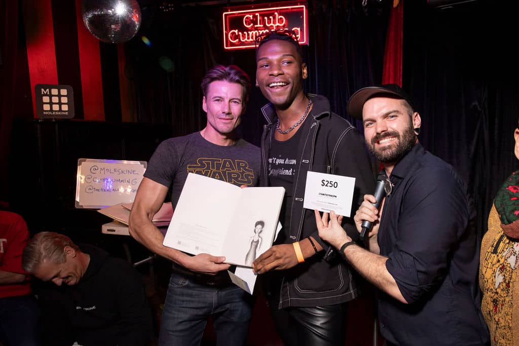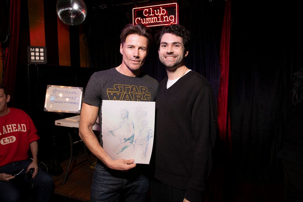 On Sunday, The Daily and MOLESKINE got together to host the first-ever The Daily Draw event at Club Cumming in the East Village. The fun-filled drink and draw evening was hosted by artist A.E Kiernan and invited attendees to try their hand at drawing a live model while having a sip of their favorite adult beverages. To kick off the inaugural event, we asked our friend, legendary male model Alex Lundqvist, to come to the stage and surprise the room with a few poses while the artists (and umm, wannabe artists) sketched in their MOLESKINE notebooks.