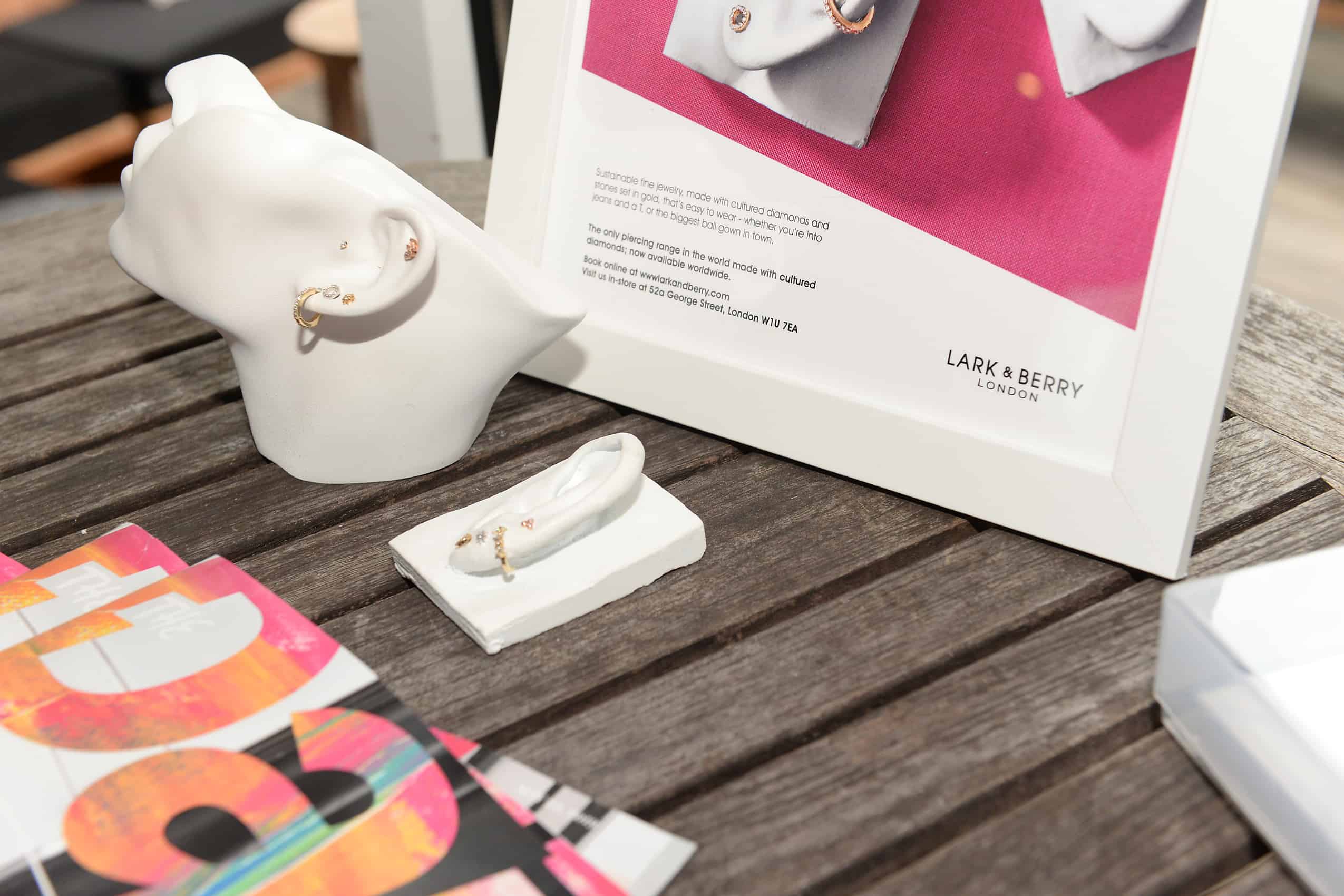 British jewelry brand Lark & Berry displayed a selection of their cutest ear studs and hoops on Gitano’s second floor alongside a free (and extremely popular) piercing station.