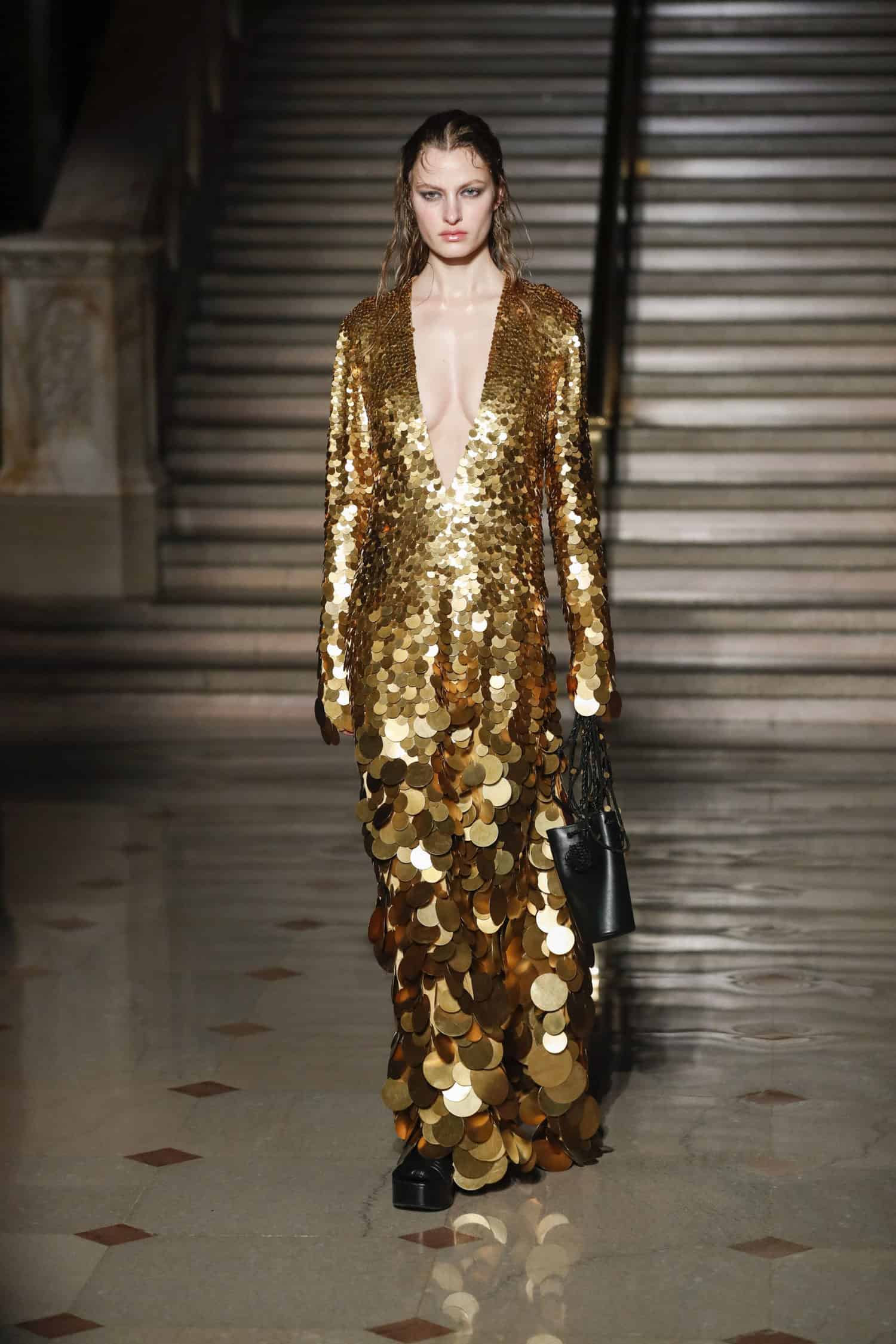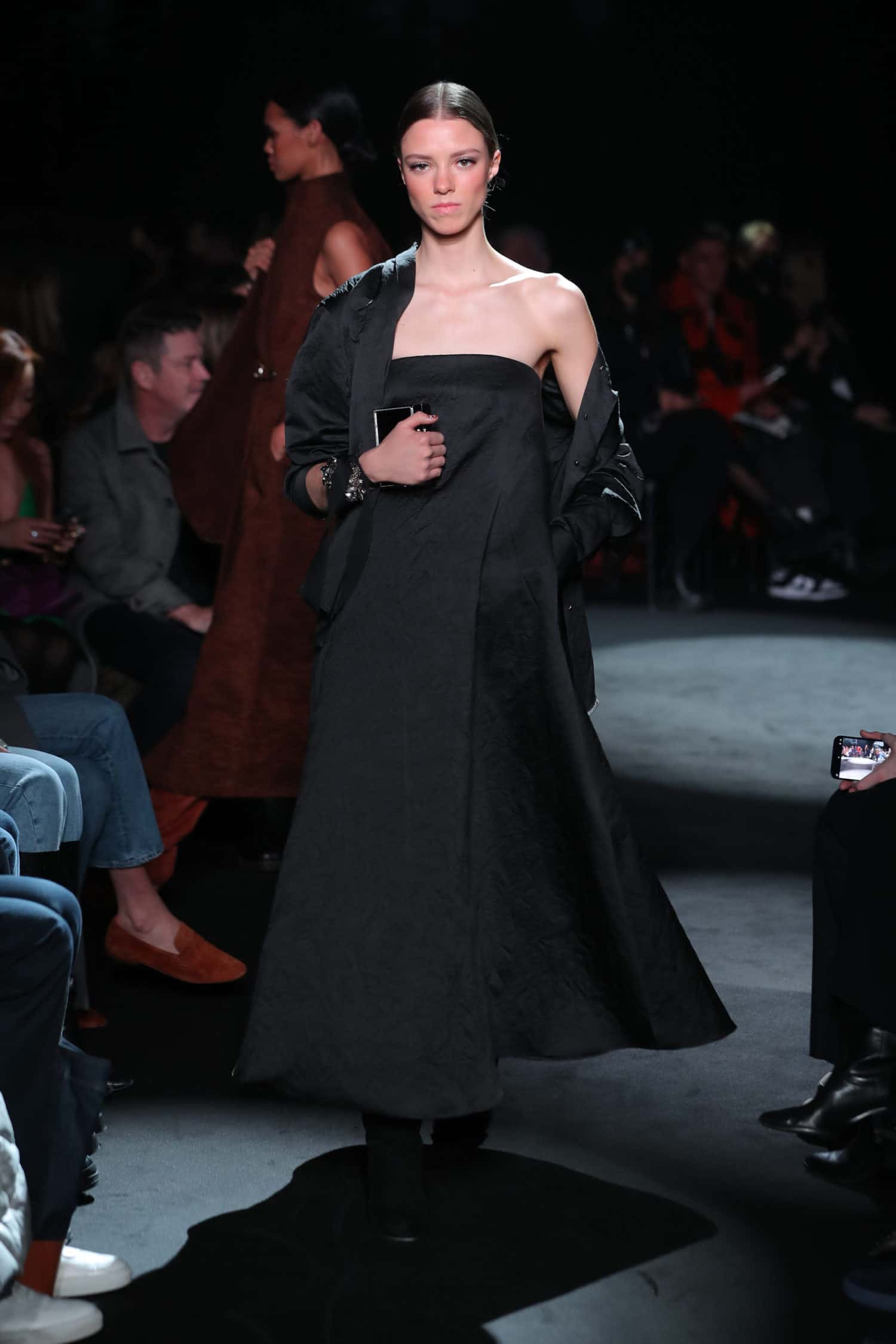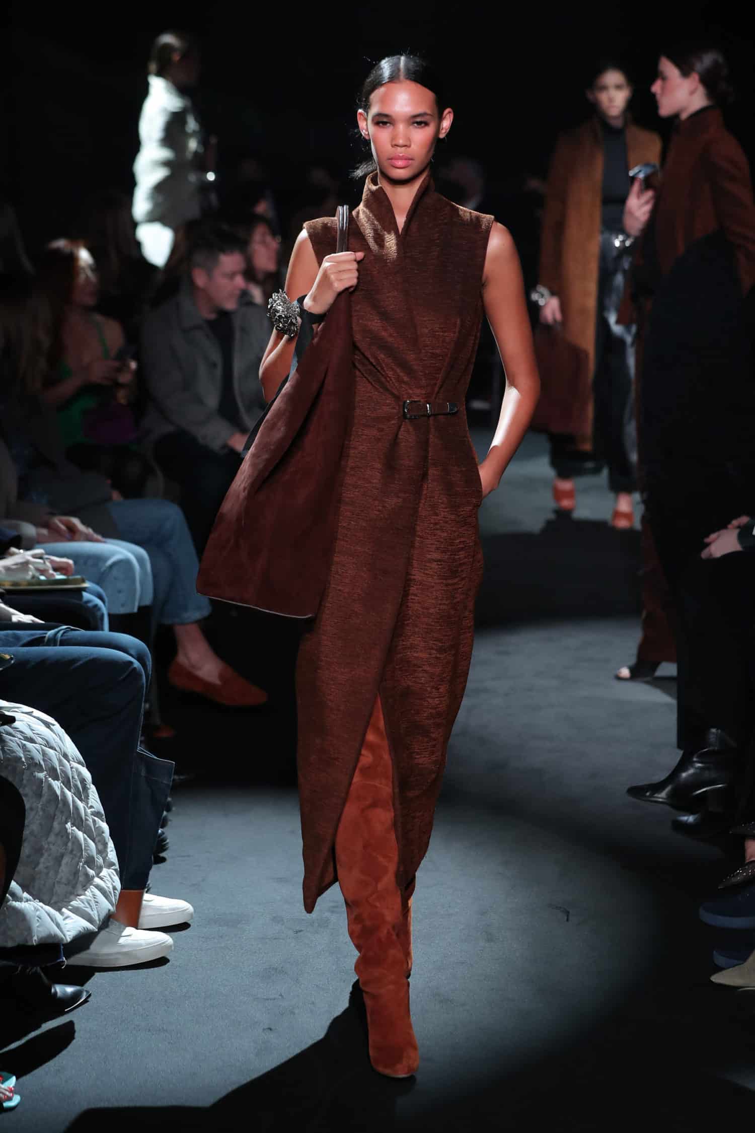 Freya Drohan: While it’s an unrivaled privilege to attend a fashion show in any format, it’s the ones that are fully committed to a story that feel like the greatest honor to witness in person. For Fall, Joseph Altuzarra knew his moodboard inside and out, and it was evident from the moment guests took their seats at the elegant (if slightly imposing) Woolworth Building to find a copy of Moby Dick filled with fabric swatches and a polaroid. The designer had the ocean, its creatures and the humans who devote their lives to it, as well as the myths that surround the eco-system, on the brain. A sense of an epic journey across seas and terrains came to mind as models teetered past in gigantic platforms. Beyond the shearling-trimmed outerwear, textured knits, Shibori prints, pleated kilts in vegan leather, and hooded dresses which spoke to a woman who was ready to trek far and wide, it was the styling by Gabriella Karefa-Johnson (multiple bags worn at once; outfits completed with swashbuckler chain, coin, braided, or beaded belts) that drove home the sense of adventure. To close the show, there was a sombre mermaid parade of sorts, with fish scale-esque coins cut from aluminum and hand-tarnished for an aged look seen on coats, knit dresses, and in floor-sweeping gold gowns. By in large, mermaids symbolize good luck, renewal, and good times ahead—and now Altuzarra has given us the powerful outfits we need to go get ’em.