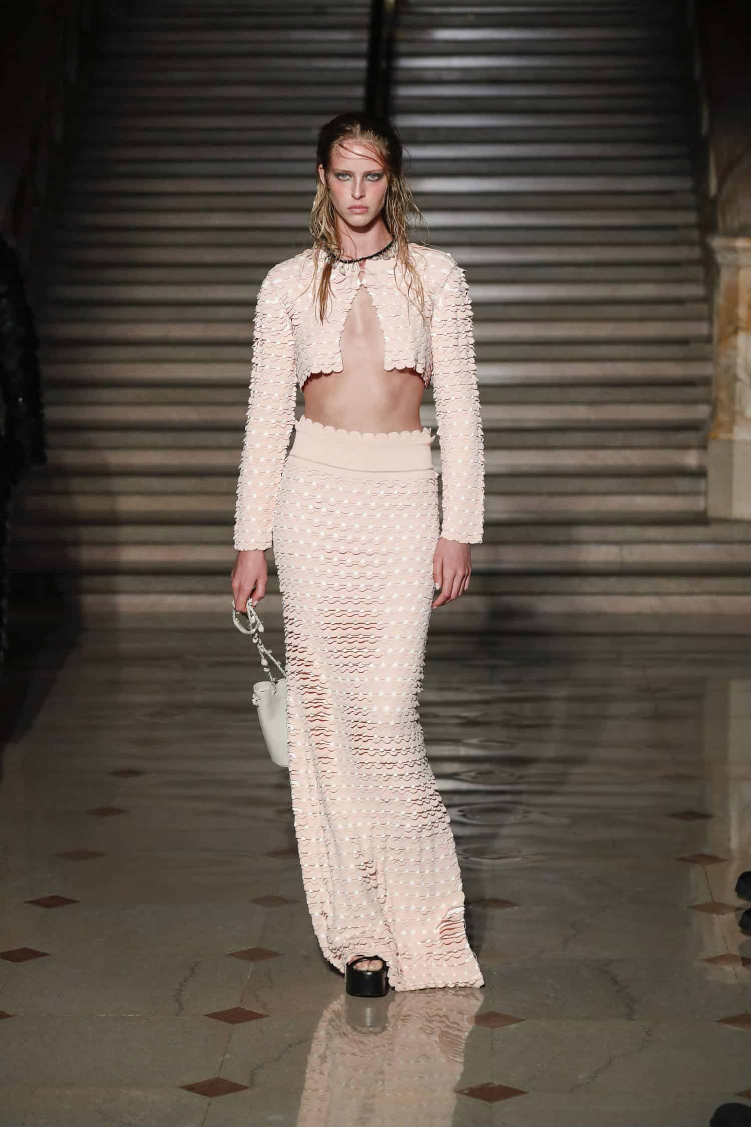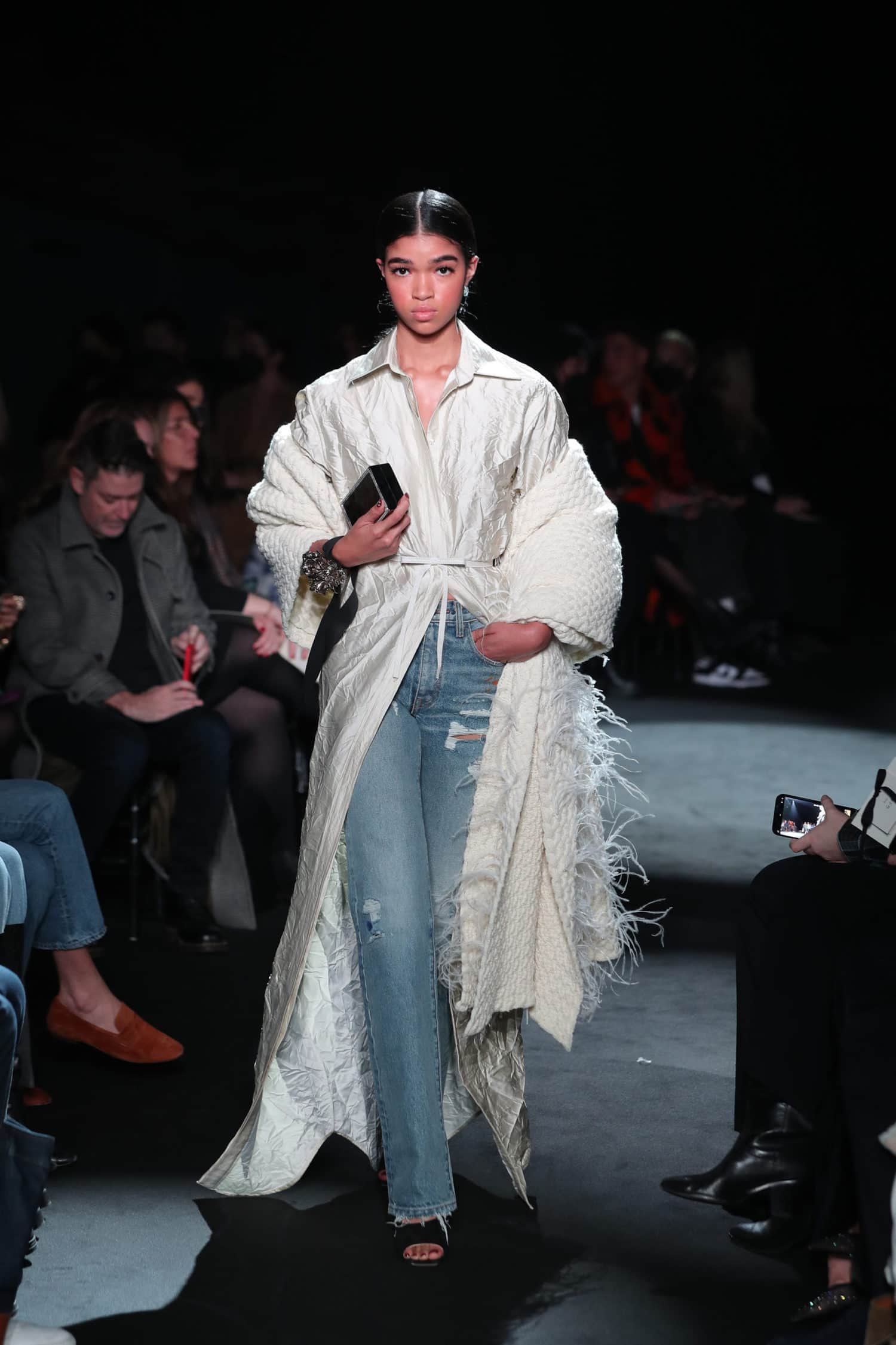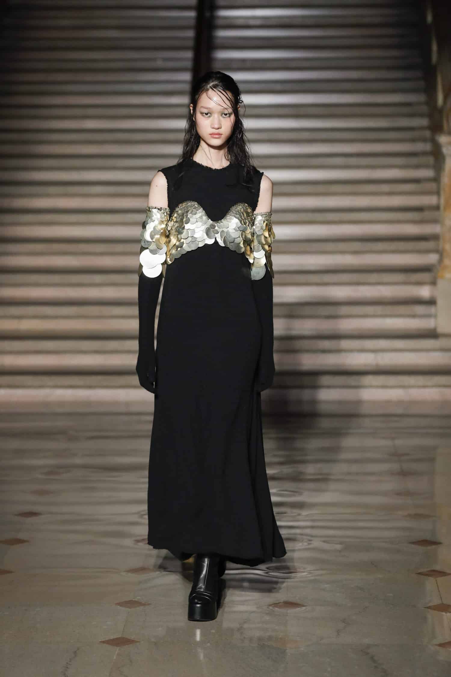 Freya Drohan: While it’s an unrivaled privilege to attend a fashion show in any format, it’s the ones that are fully committed to a story that feel like the greatest honor to witness in person. For Fall, Joseph Altuzarra knew his moodboard inside and out, and it was evident from the moment guests took their seats at the elegant (if slightly imposing) Woolworth Building to find a copy of Moby Dick filled with fabric swatches and a polaroid. The designer had the ocean, its creatures and the humans who devote their lives to it, as well as the myths that surround the eco-system, on the brain. A sense of an epic journey across seas and terrains came to mind as models teetered past in gigantic platforms. Beyond the shearling-trimmed outerwear, textured knits, Shibori prints, pleated kilts in vegan leather, and hooded dresses which spoke to a woman who was ready to trek far and wide, it was the styling by Gabriella Karefa-Johnson (multiple bags worn at once; outfits completed with swashbuckler chain, coin, braided, or beaded belts) that drove home the sense of adventure. To close the show, there was a sombre mermaid parade of sorts, with fish scale-esque coins cut from aluminum and hand-tarnished for an aged look seen on coats, knit dresses, and in floor-sweeping gold gowns. By in large, mermaids symbolize good luck, renewal, and good times ahead—and now Altuzarra has given us the powerful outfits we need to go get ’em.