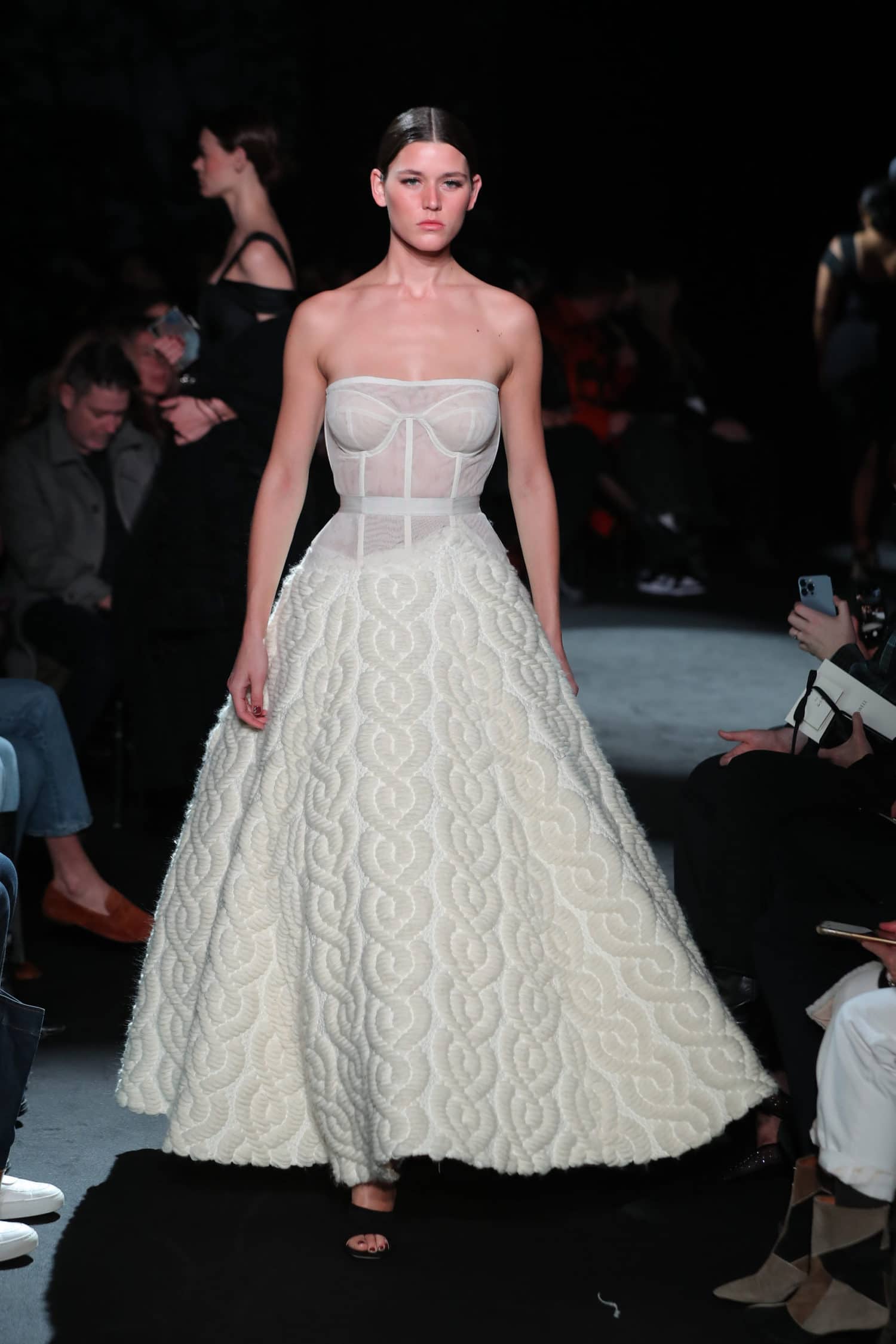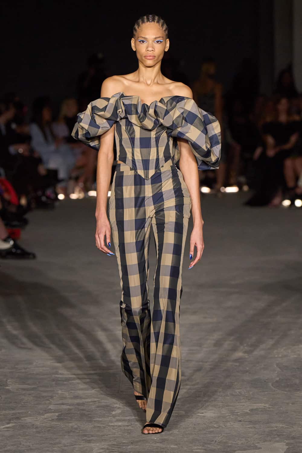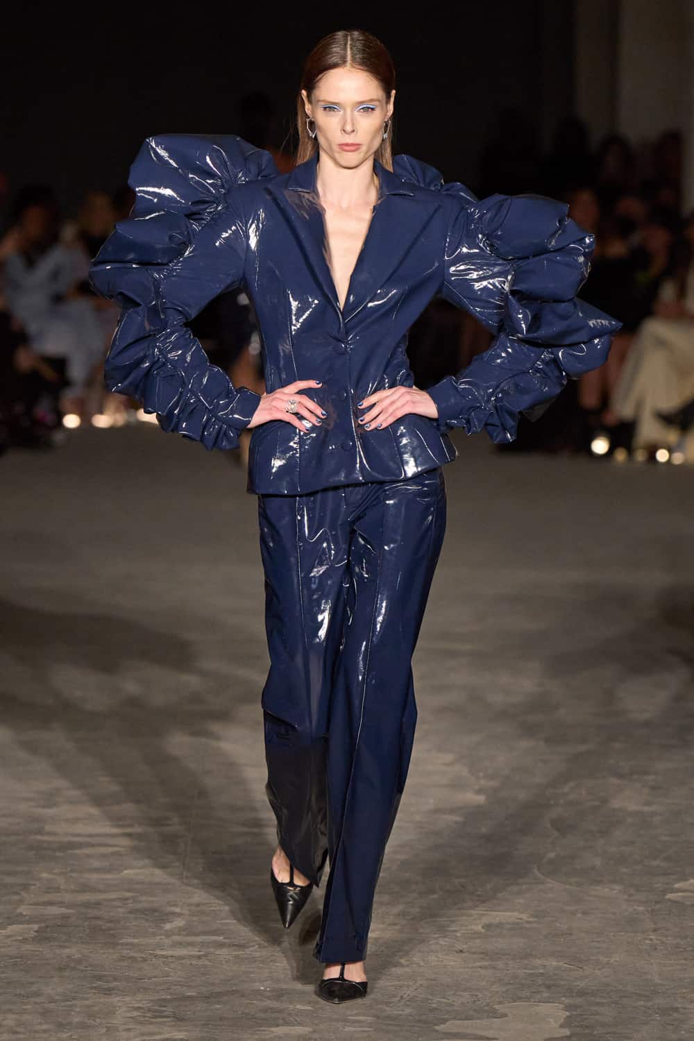 Freya Drohan: A Siriano show is always a bit of an outer body experience, what with seeing his steadfast celebrity supporters in the flesh as they take their seats front row, and witnessing catwalk legends up close and personal on the runway. But for Fall ’22 he went a step further, and created a kind of world and characters that we’d yet to witness. The designer immersed his loyal crowd in what he calls the Victorian Matrix…allow us to elaborate. Really, we could have been anywhere but a basement in the middle of Midtown Manhattan; perhaps a club in Berlin or an after hours party in another era, where the well-to-do Victorian ladies let their freaky side fly. Opening the show, Karen Elson and Coco Rocha stomped down the concrete runway in the underbelly of the Empire State Building to a trance music soundtrack in second-skin navy latex looks. Siriano called the collection “exciting” and “experimental” which certainly felt like an apt description for an offering that refused to be categorized by one audience. But then again, Siriano has forged an incredible career due to his ability to dress so many types of women. Here, we had it all: elegant suiting in saturated cobalt, floor-sweeping gowns that fused dominatrix-style elements with the regality of a proper Victorian woman, plus hooded and quilted separates, plaid, ball skirts, and body-conscious silhouettes to flatter every figure. One gaze over at his eclectic front row—which included Susan Sarandon, Alicia Silverstone, Drew Barrymore, MJ Rodriguez, Aquaria, and Symone—and you could picture various pieces on each of them with ease. Despite the sparse and stripped back show space, there were undeniably elegant moments too. Take, for example, a nude-colored corset with tulle ruffles, and several iterations on Siriano’s favorite sheer crystal-embellished dresses.