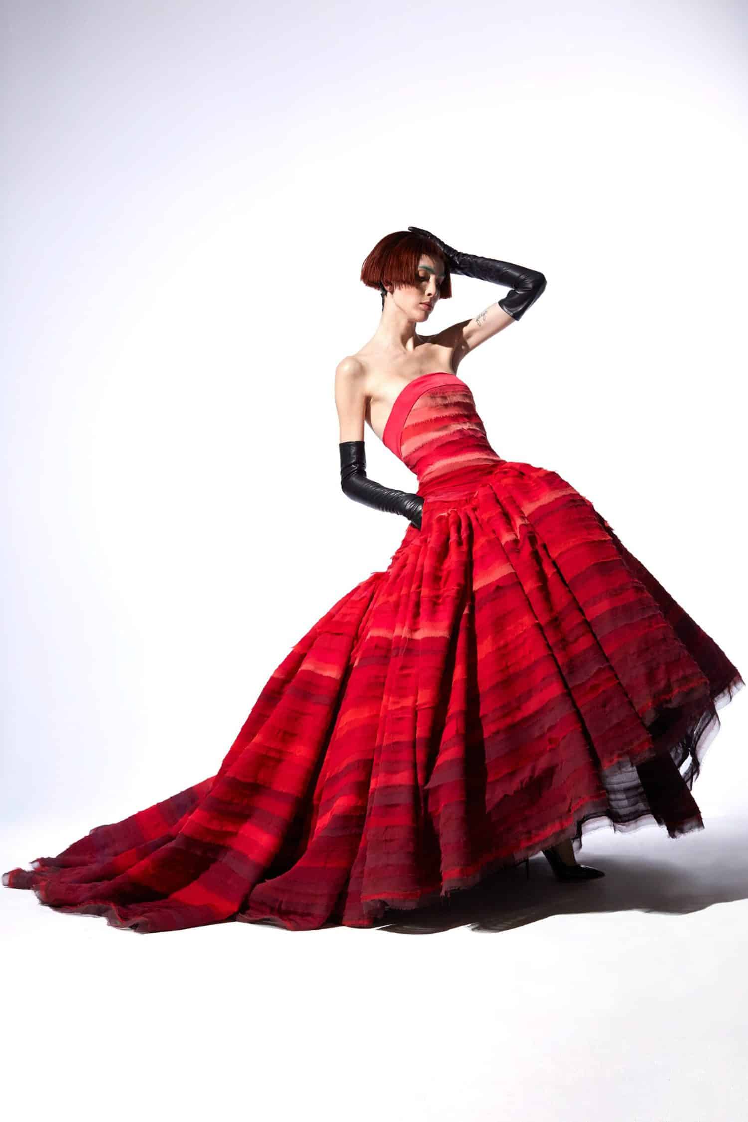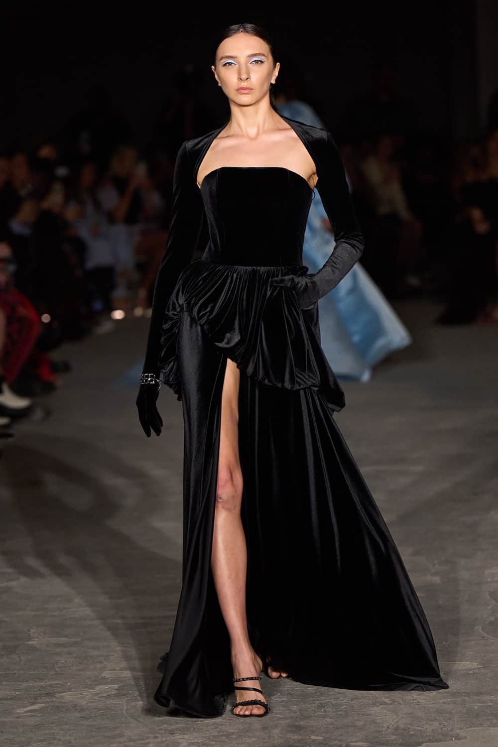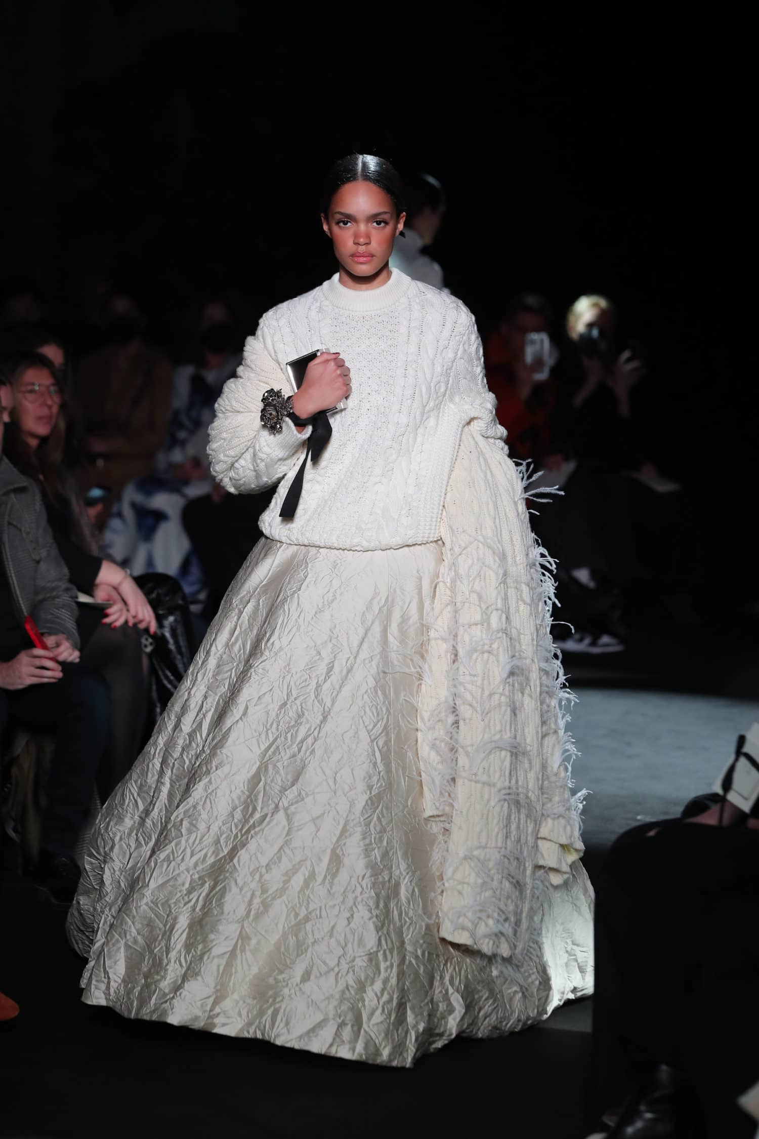 Freya Drohan: A Siriano show is always a bit of an outer body experience, what with seeing his steadfast celebrity supporters in the flesh as they take their seats front row, and witnessing catwalk legends up close and personal on the runway. But for Fall ’22 he went a step further, and created a kind of world and characters that we’d yet to witness. The designer immersed his loyal crowd in what he calls the Victorian Matrix…allow us to elaborate. Really, we could have been anywhere but a basement in the middle of Midtown Manhattan; perhaps a club in Berlin or an after hours party in another era, where the well-to-do Victorian ladies let their freaky side fly. Opening the show, Karen Elson and Coco Rocha stomped down the concrete runway in the underbelly of the Empire State Building to a trance music soundtrack in second-skin navy latex looks. Siriano called the collection “exciting” and “experimental” which certainly felt like an apt description for an offering that refused to be categorized by one audience. But then again, Siriano has forged an incredible career due to his ability to dress so many types of women. Here, we had it all: elegant suiting in saturated cobalt, floor-sweeping gowns that fused dominatrix-style elements with the regality of a proper Victorian woman, plus hooded and quilted separates, plaid, ball skirts, and body-conscious silhouettes to flatter every figure. One gaze over at his eclectic front row—which included Susan Sarandon, Alicia Silverstone, Drew Barrymore, MJ Rodriguez, Aquaria, and Symone—and you could picture various pieces on each of them with ease. Despite the sparse and stripped back show space, there were undeniably elegant moments too. Take, for example, a nude-colored corset with tulle ruffles, and several iterations on Siriano’s favorite sheer crystal-embellished dresses.