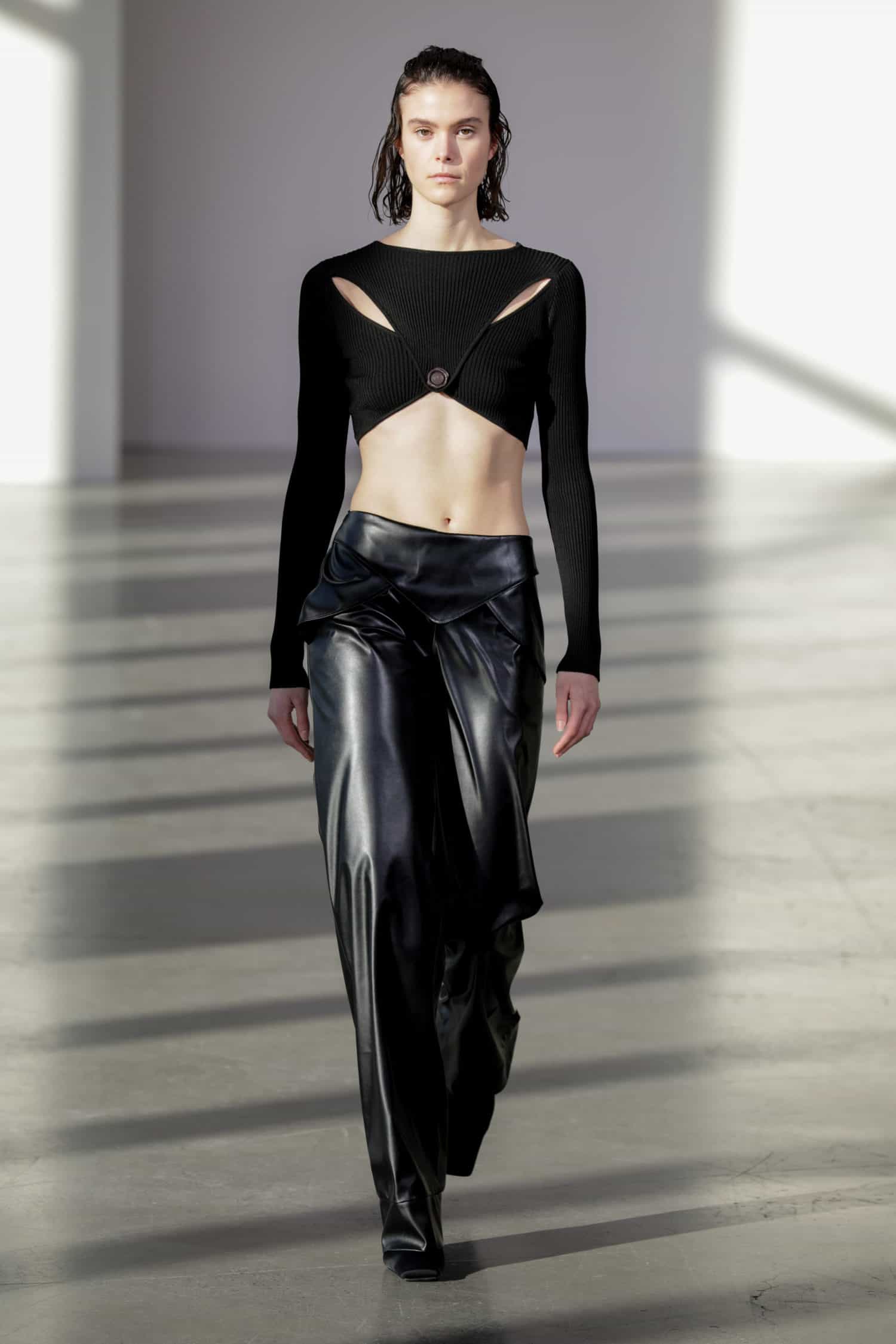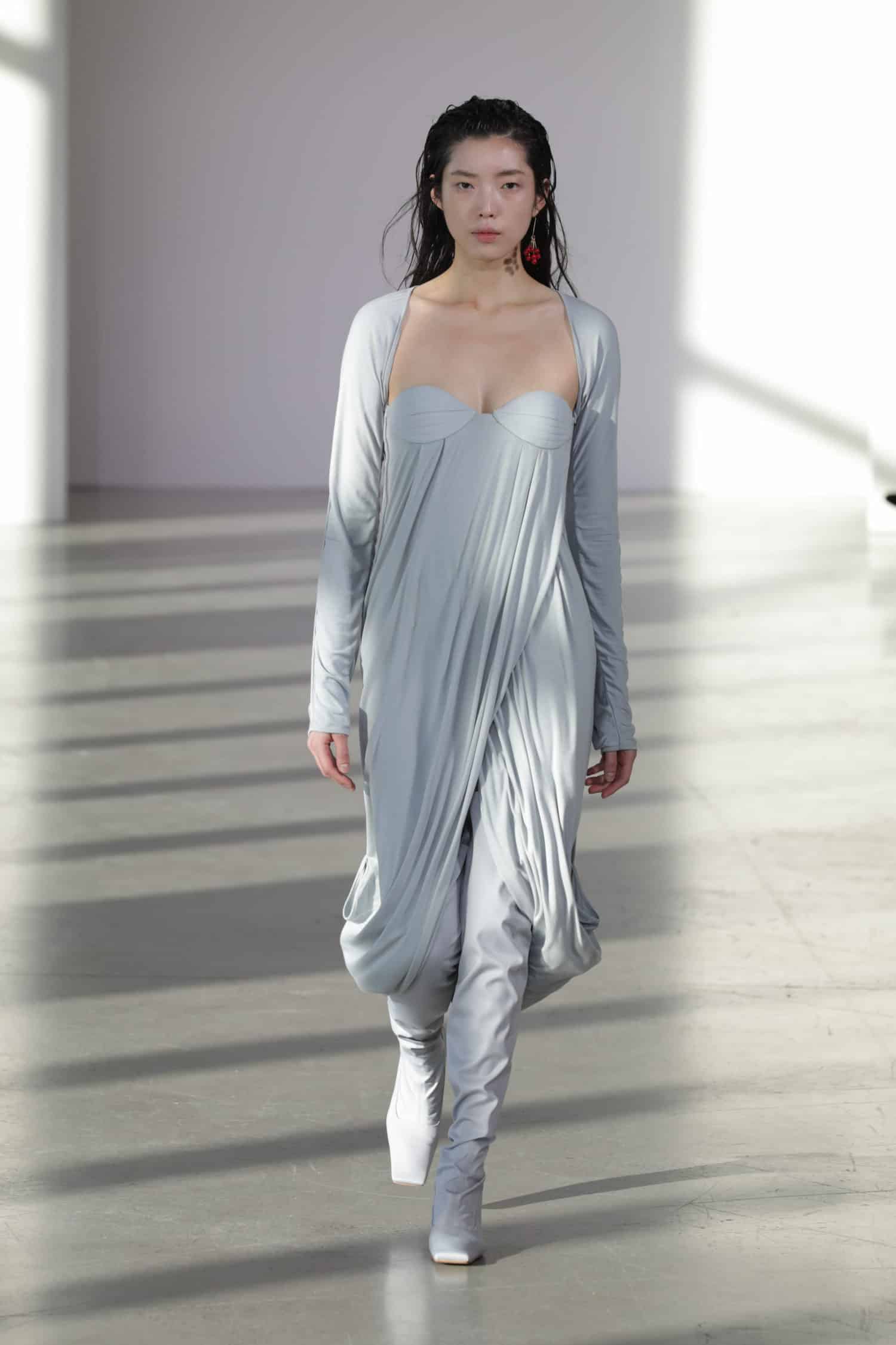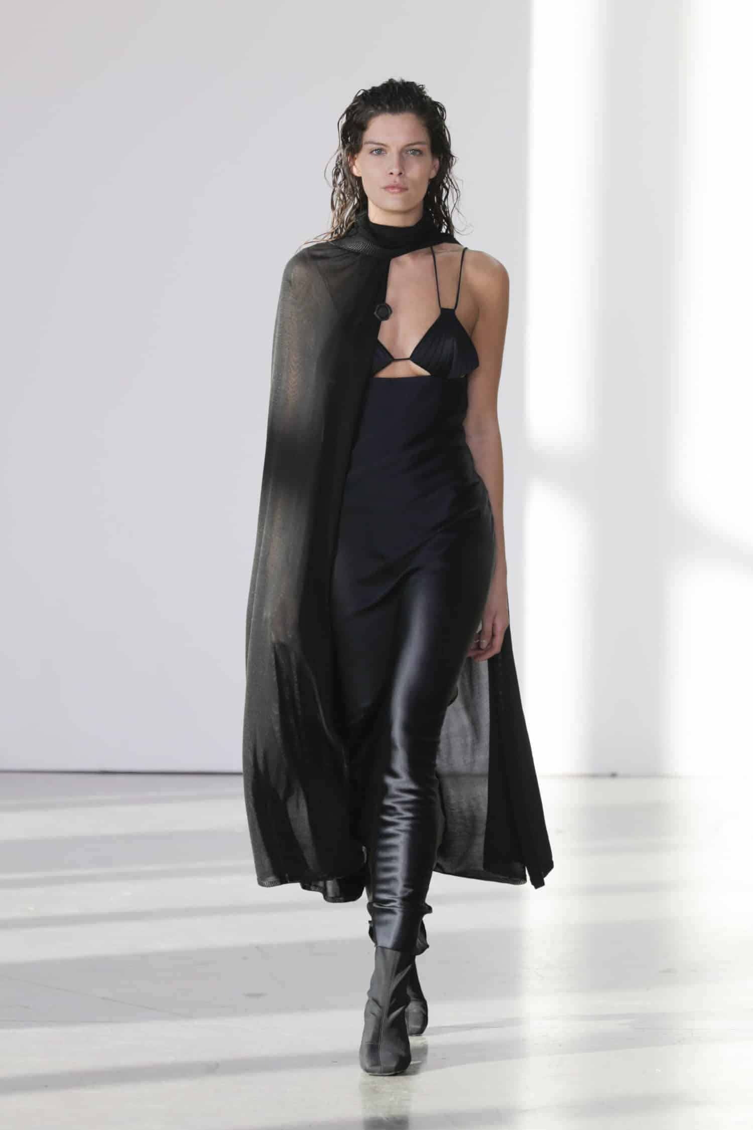 Ian Grafvonluxburg: As the late afternoon sunlight cascaded into The Gallery, guests at Bevza’s Fall 2022 show began to fill the room. Sunlight was the only accessory needed in the room, which was all white with no detailed accentuations in sight, a foreshadowing of the simple yet elegant sophistication we were about to witness. Inspired by “love letters to the Earth,” Kyiv-based designer Svitlana Bevza presented a collection that could be worn straight off the runway, or incorporated into your personal style. Pearlized seashell earmuffs and garments made of fish-scale-like fabric shined on the runway. Dresses with wire built into the hemline created a sense that models were bobbing in waves, pushing the garments forward and retracting them all in one swift move. Playing off the the stylistic choices made in love letters, the tailoring and fit on some of the garments echoed envelopes: centerfolds with peek-a-boo flaps as well as wax-seal-shaped buttons and clutches tied the collection together seamlessly. The front row attendees were eating up the details. With ethically-sourced materials, Bevza continues to spread the message of sustainability—eco-friendly materials made of recycled plastic bottles showed up in the shape of slick long vests and a tundra-ready maxi skirt. A conscious and gentle love letter to the planet, for sure.