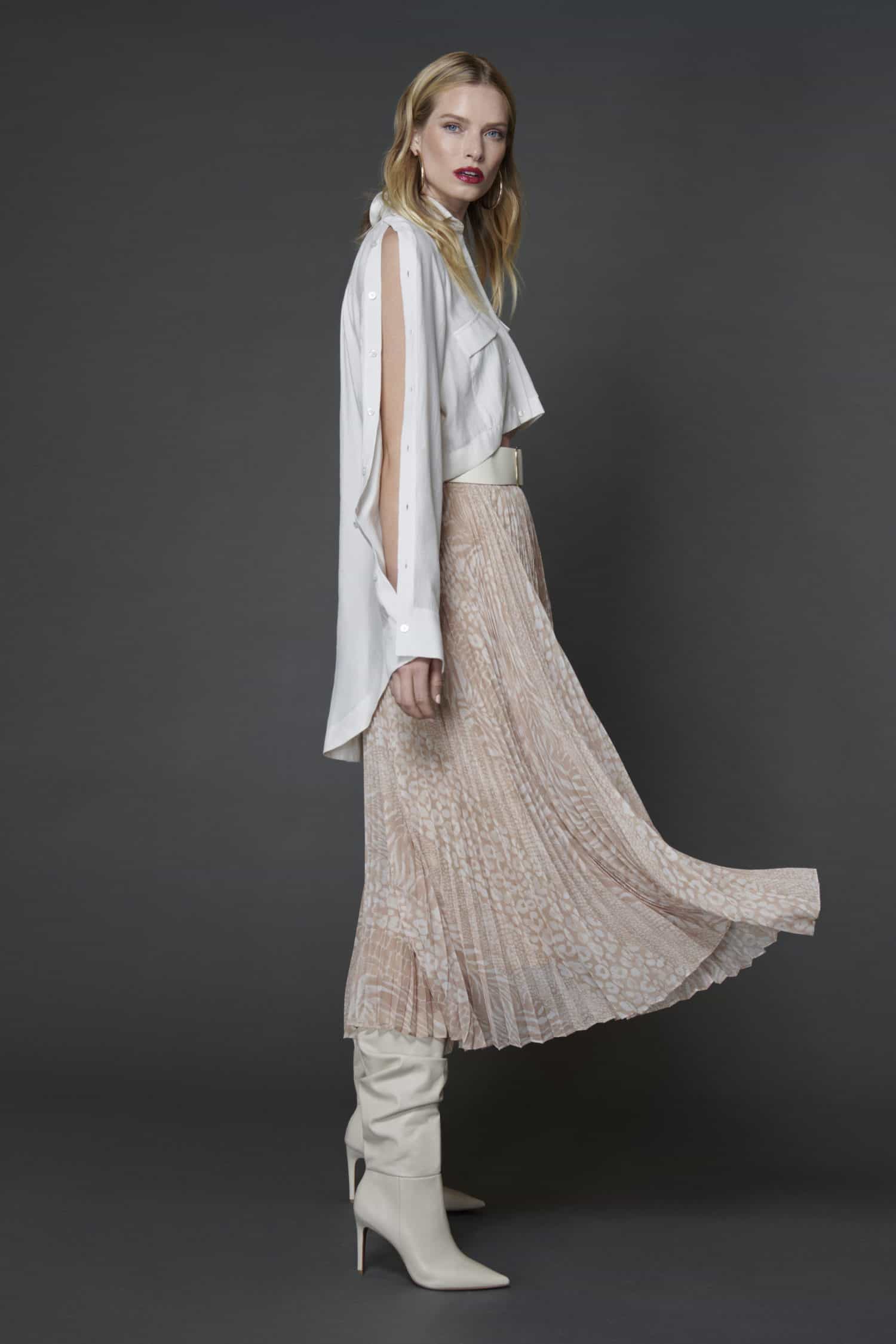 Specifically, he name checked screen sirens and sex symbols of the 1970s, actresses Edwige Fenech, Barbara Bouchet, and Zeudy Araya, and their inimitable vibes as central to his re-envisioning of the BCBGMAXAZRIA woman. “She’s not afraid of experimentation. She is an art lover, a visionary, a philanthropist, a pioneer, and more,” he said of his archetype. “Her way of dressing has evolved along with the changing of the times. Versatility rules her wardrobe and outfits need to easily be transformed from day to night.”