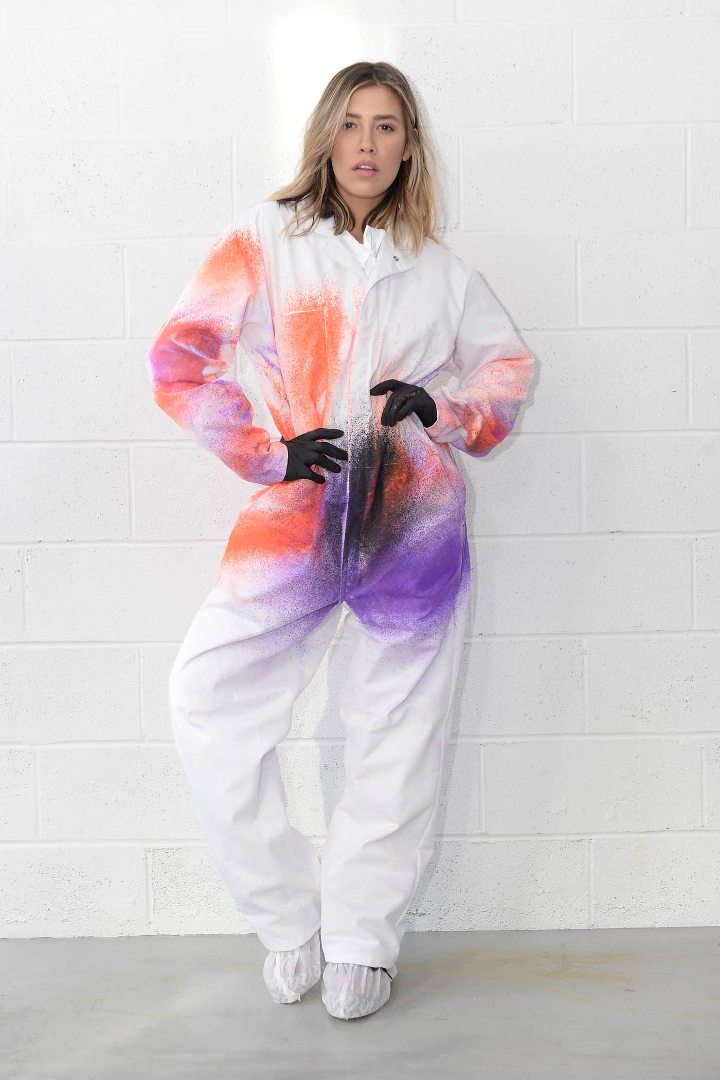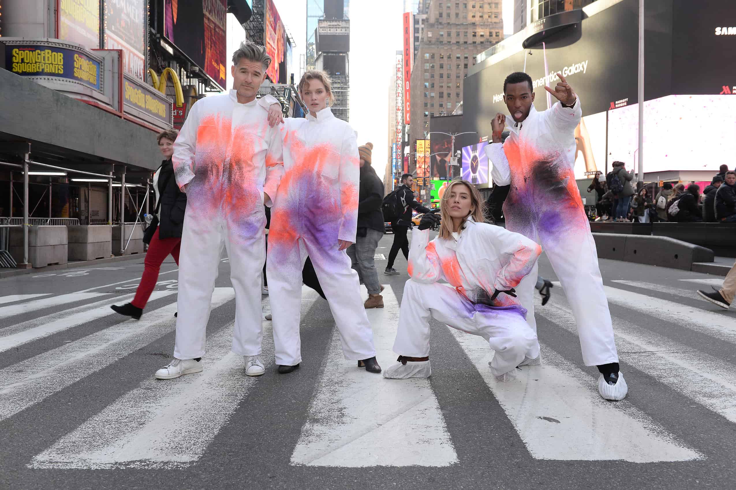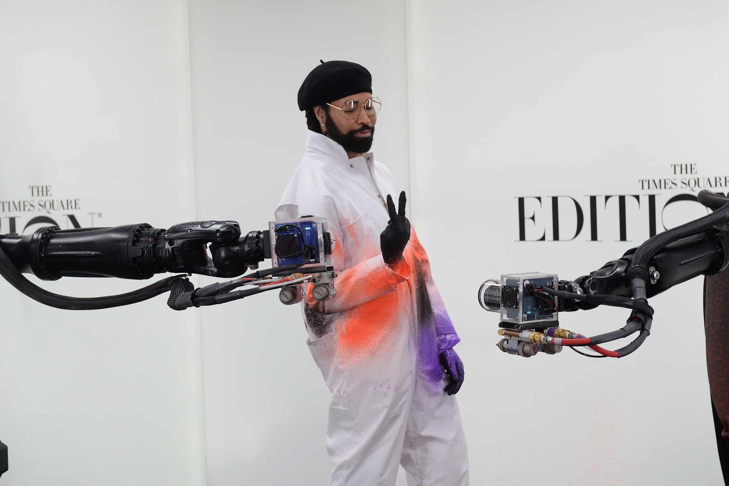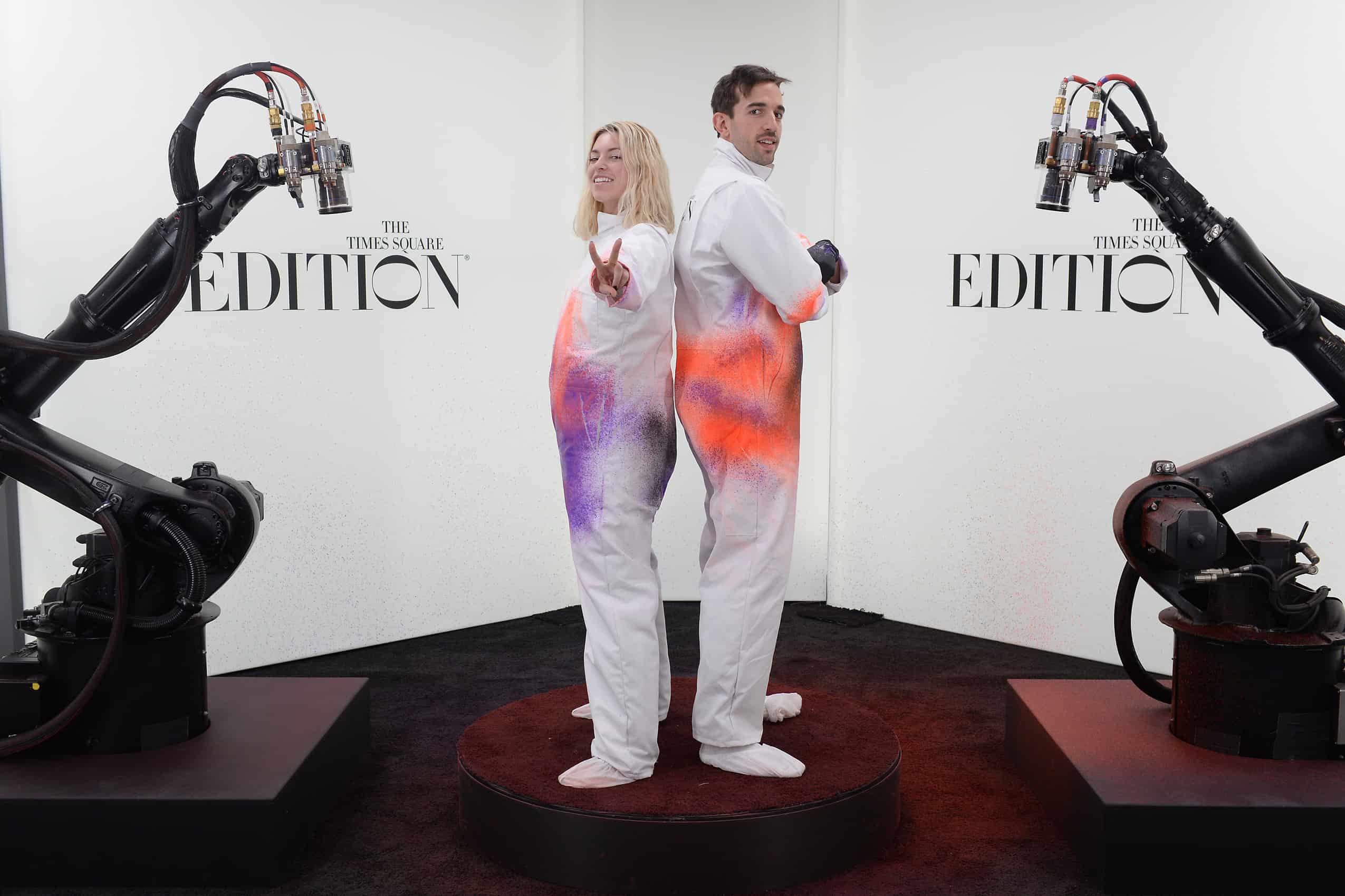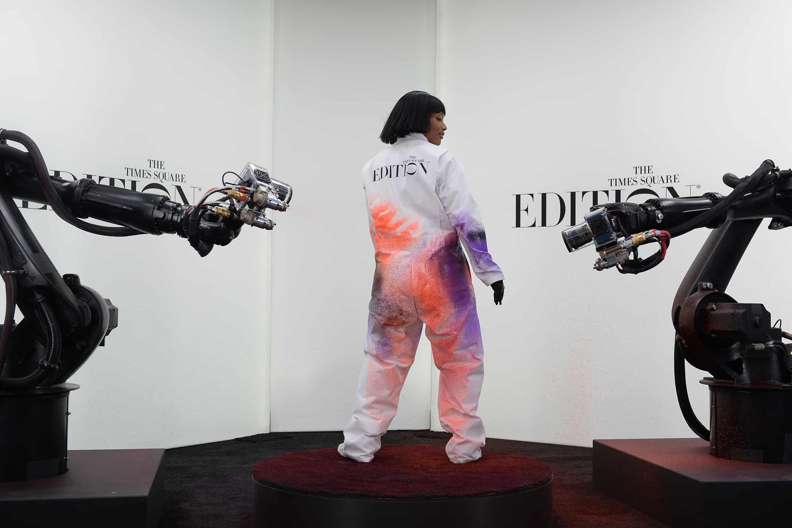Schrager’s version took fashion insiders like Alex Lundqvist, Faith Lynch, Eric Rutherford, Ty Hunter, and Ashley Haas and put them in white, Edition-branded jumpsuits before placing them on a circular dais where they were spun around as two robotic arms covered them in purple, orange, and black paint.