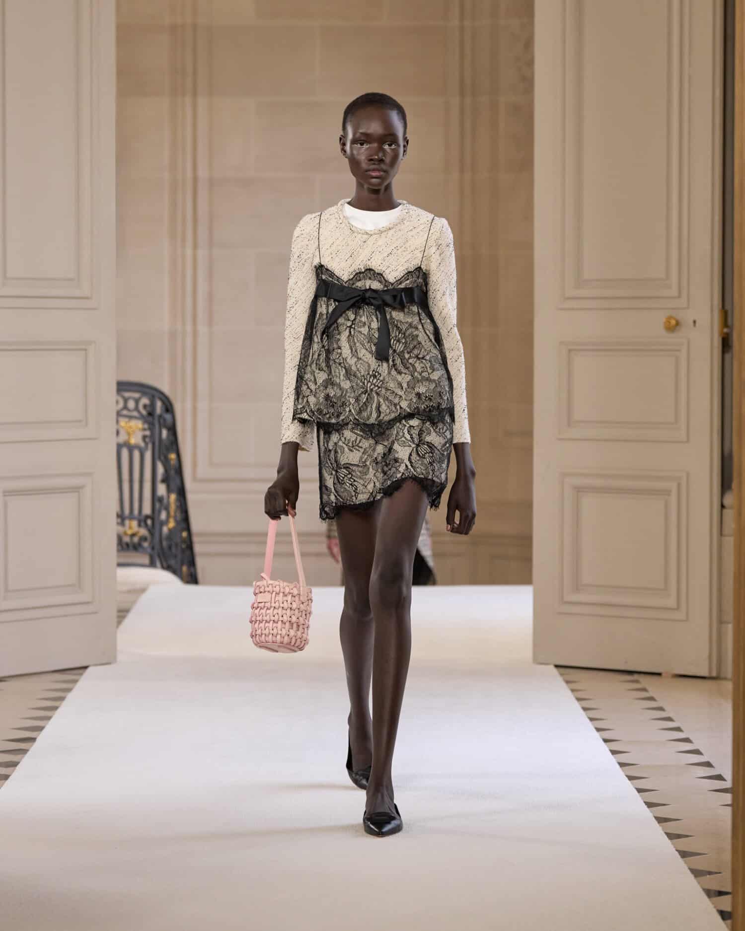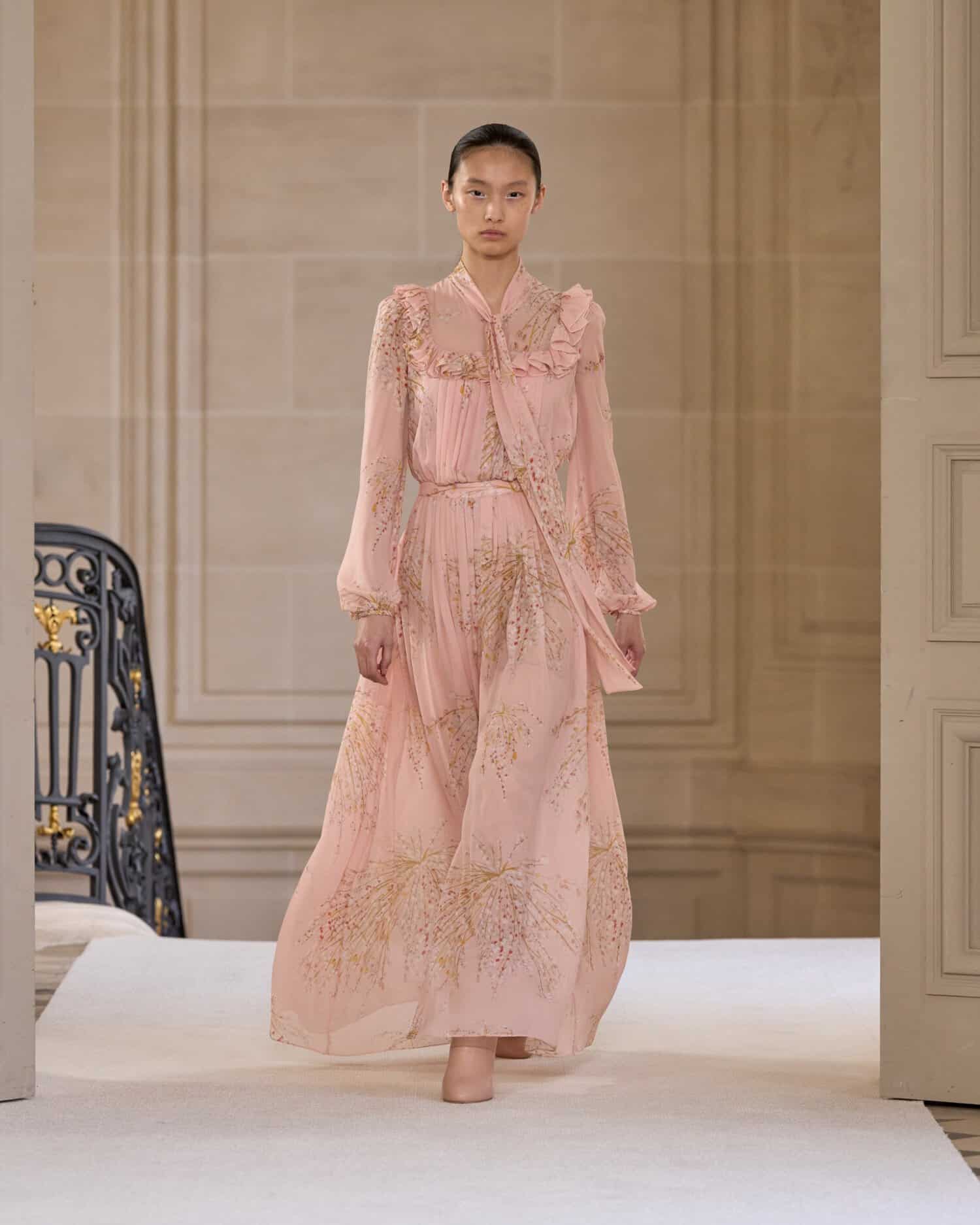 Giambattista Valli looked to womens’ self-determination for his Fall 2025 collection, seen through a streamlined palette of berry purples, light rose, deep red, and marigold. The designer’s latest lineup featured lightweight, flowing maxi dresses ideal for daytime wear, plus cutout and textured styles fit for any nighttime outing. A variety of matching separates and sharp coats in cream and black provided additional versatility, with Valli’s signature elegance shining through swirling lace layers and thin bows. Sheer bases, shimmering metallics, and delicate floral embroidery and blooming prints completed the line with an unapologetic dynamism.