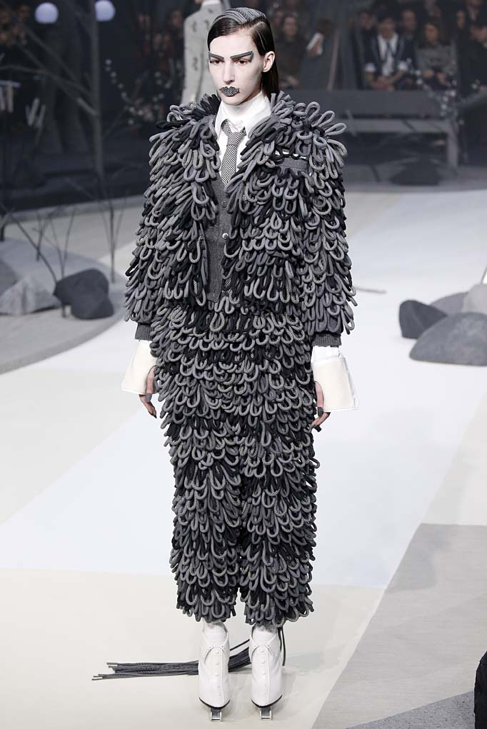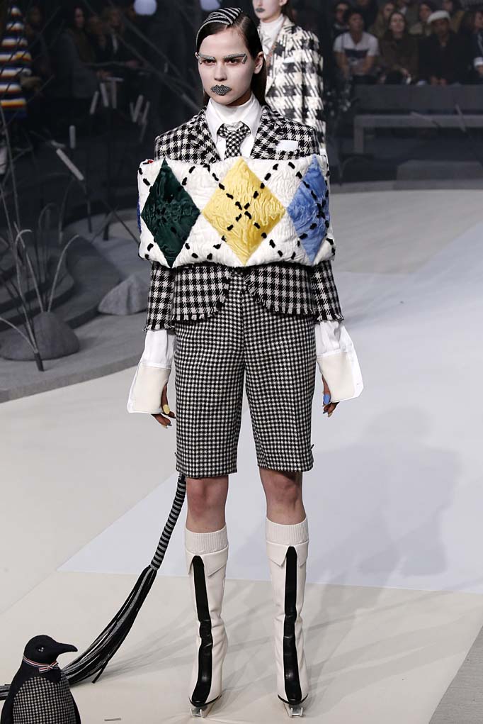There was a cold chill at Thom Browne this season as models in tall platforms that mimicked ice skates descended onto a frozen lake against a rural American setting of gray painted churches and farmhouses. Leafless trees came wrapped in check suiting fabric. Two stoic male statues each held two lighted globes like lone beacons of light in the darkness. The ominous music combined with slow measured walks (thanks to those ice skate stilts) and the spooky makeup also set an eery tone. Even the hair, which was partially adorned with long trails of yarn, was a strange combo of nun meets alien. And Hector has a new cold weather friend this season—the Penguin is the new iteration of the doggy handbag.