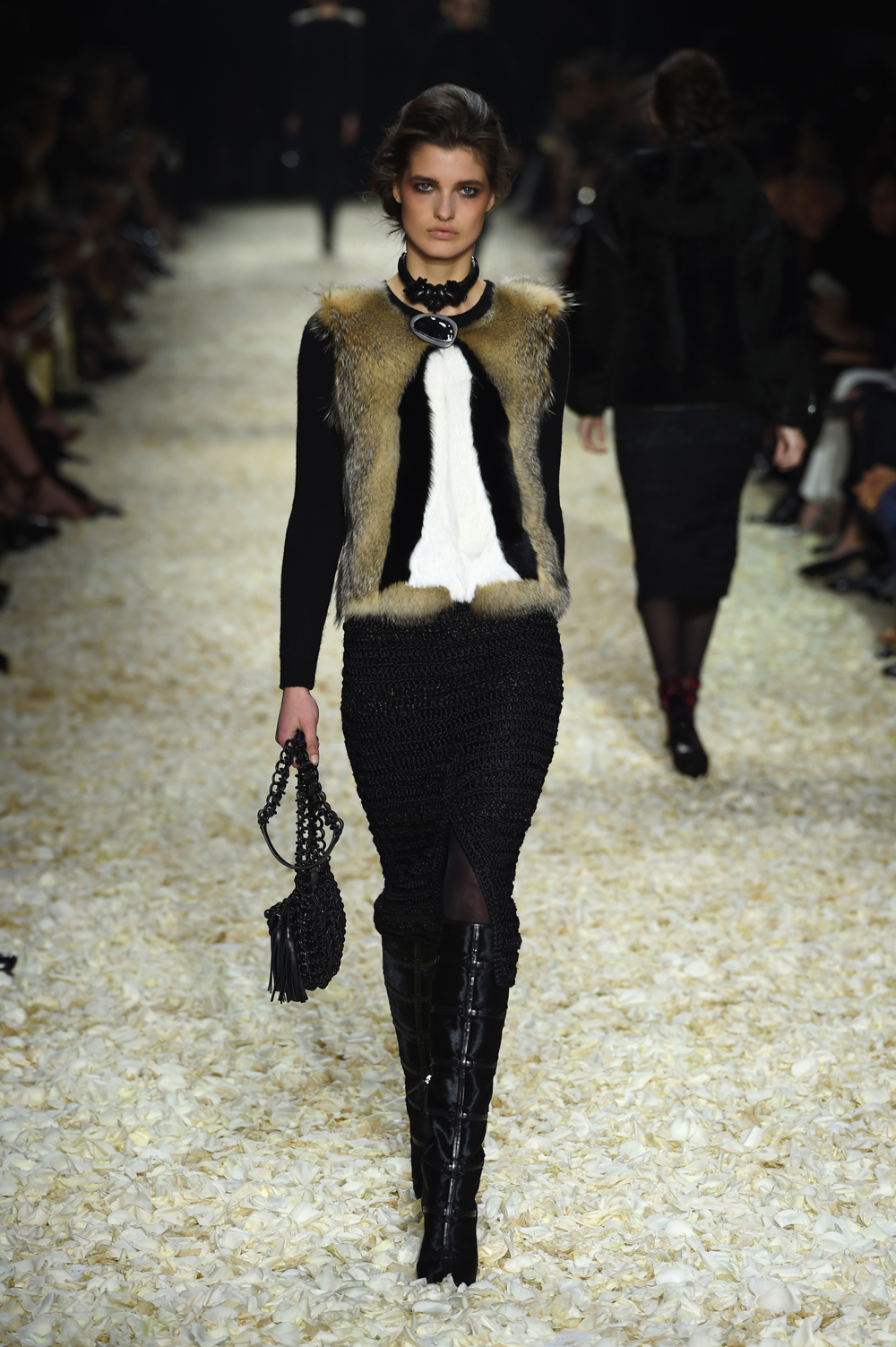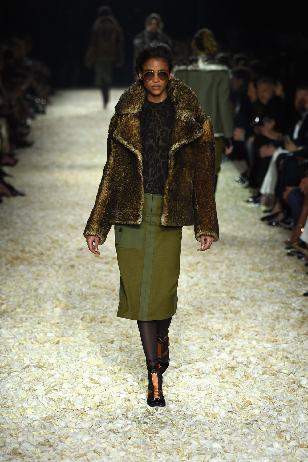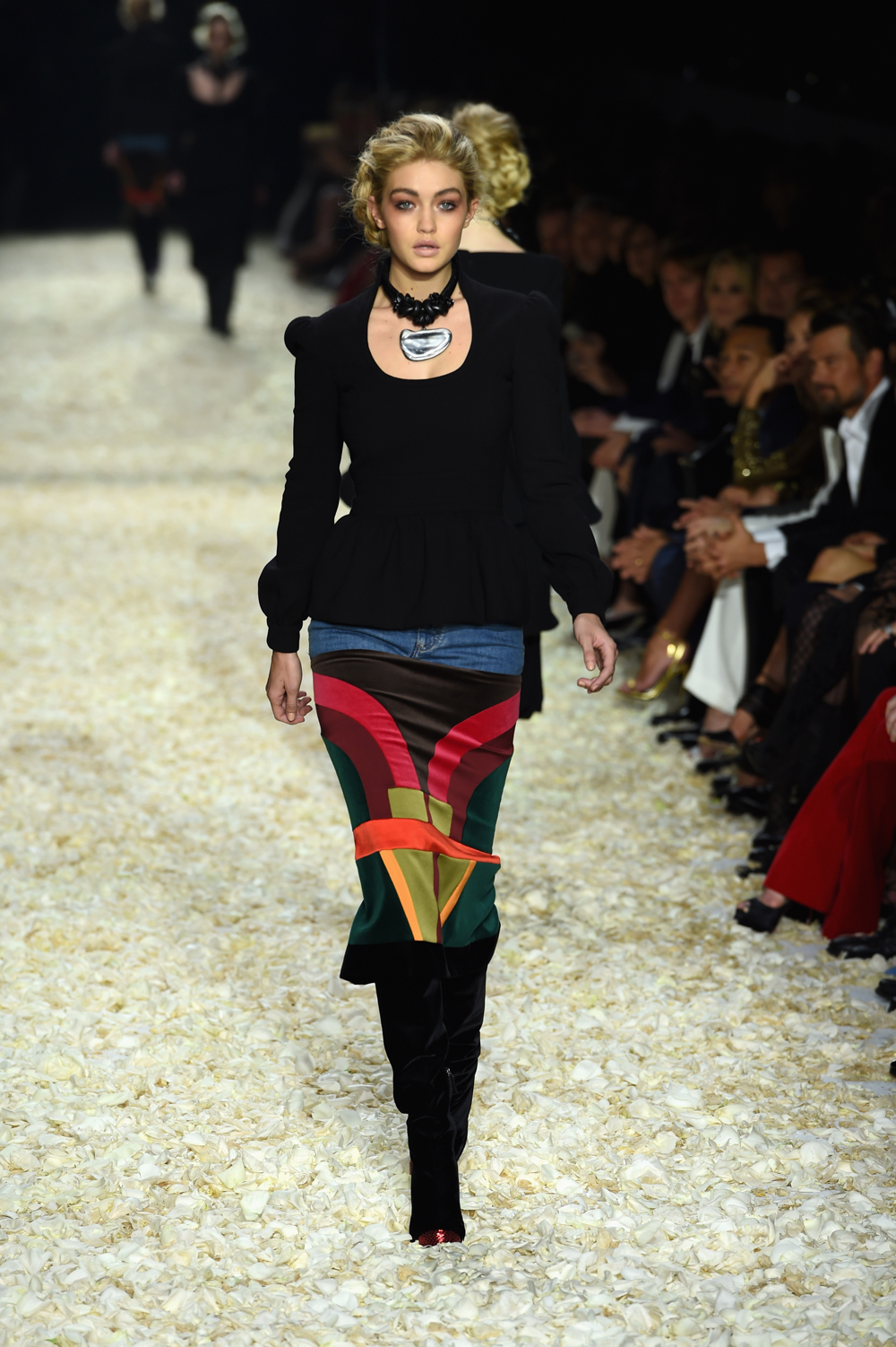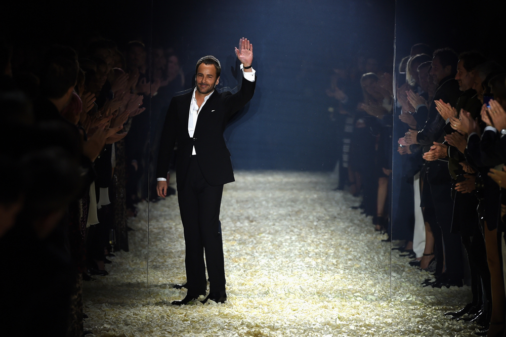 At last night’s Tom Ford show at Milk Studios in L.A., disco beats pulsed, and out came a kaleidoscope of patchwork skirts, coats, and pants–mixes of leopard, denim, lush blue furs, velvet and leather. Black and pink dresses, cascading with ruffles, beg to be twirled. A long fur looked like an abstract landscape in Santa Fe, where Mr. Ford has a house. It all feels very Los Angeles, riffing on the relaxed chic of late 1960s-era Joni Mitchell in Laurel Canyon. Daphne Groeneveld opened the show, followed by girls like Joan Smalls, Anna Ewers, Sasha Luss, Binx Walton, and Lindsey Wixson, plus Karlie Kloss, who closed the show. Gigi Hadid, a Tom Ford campaign model, and sister Bella both walked.