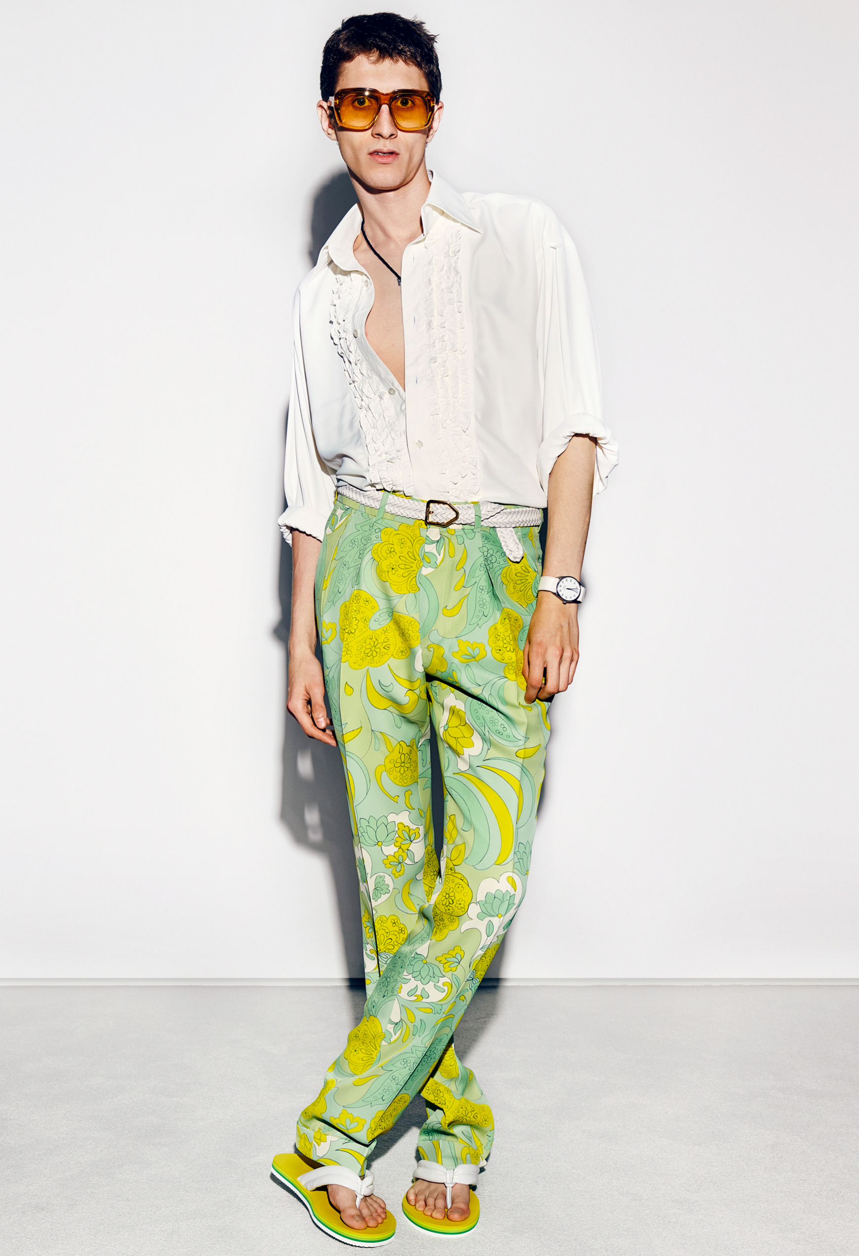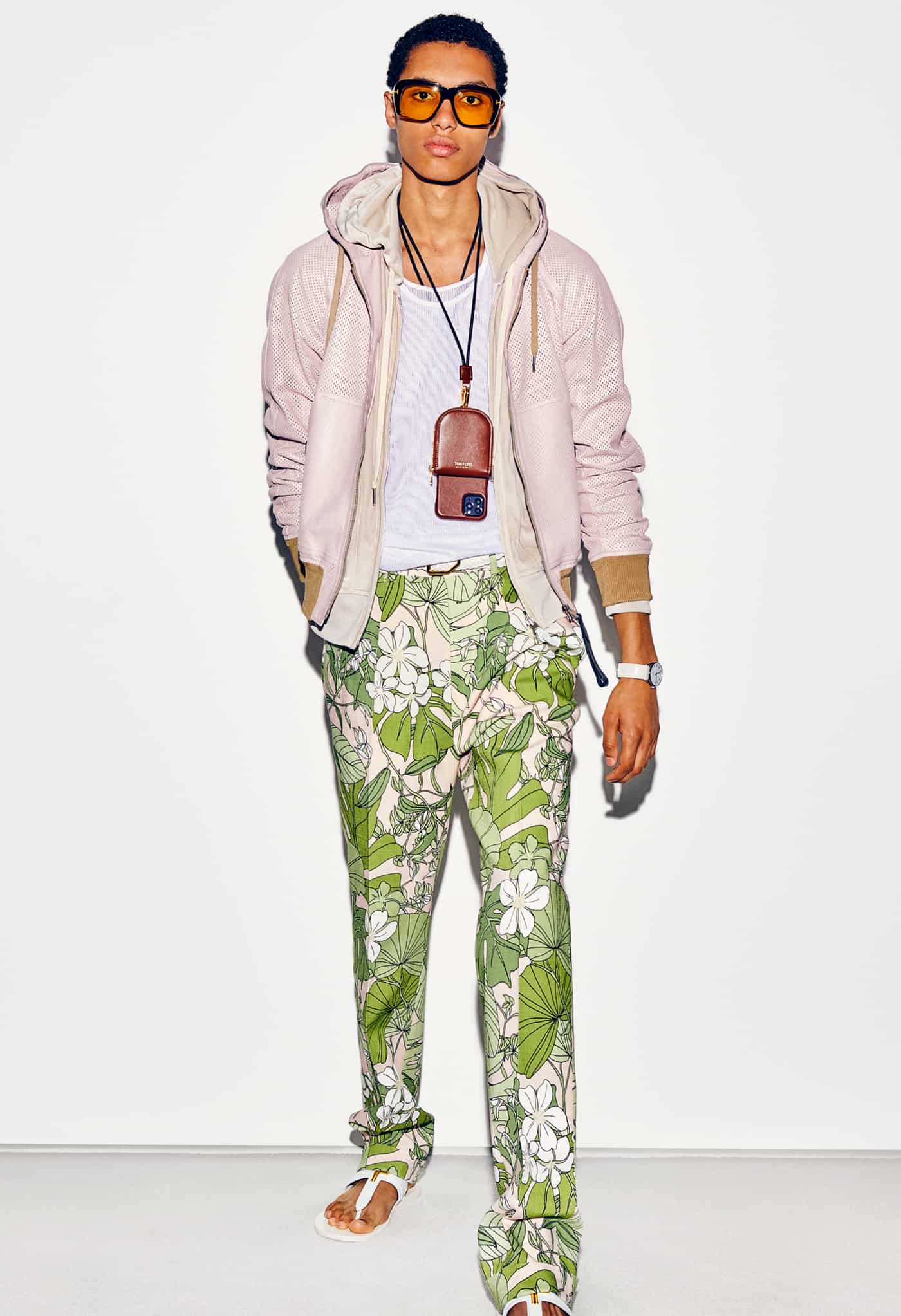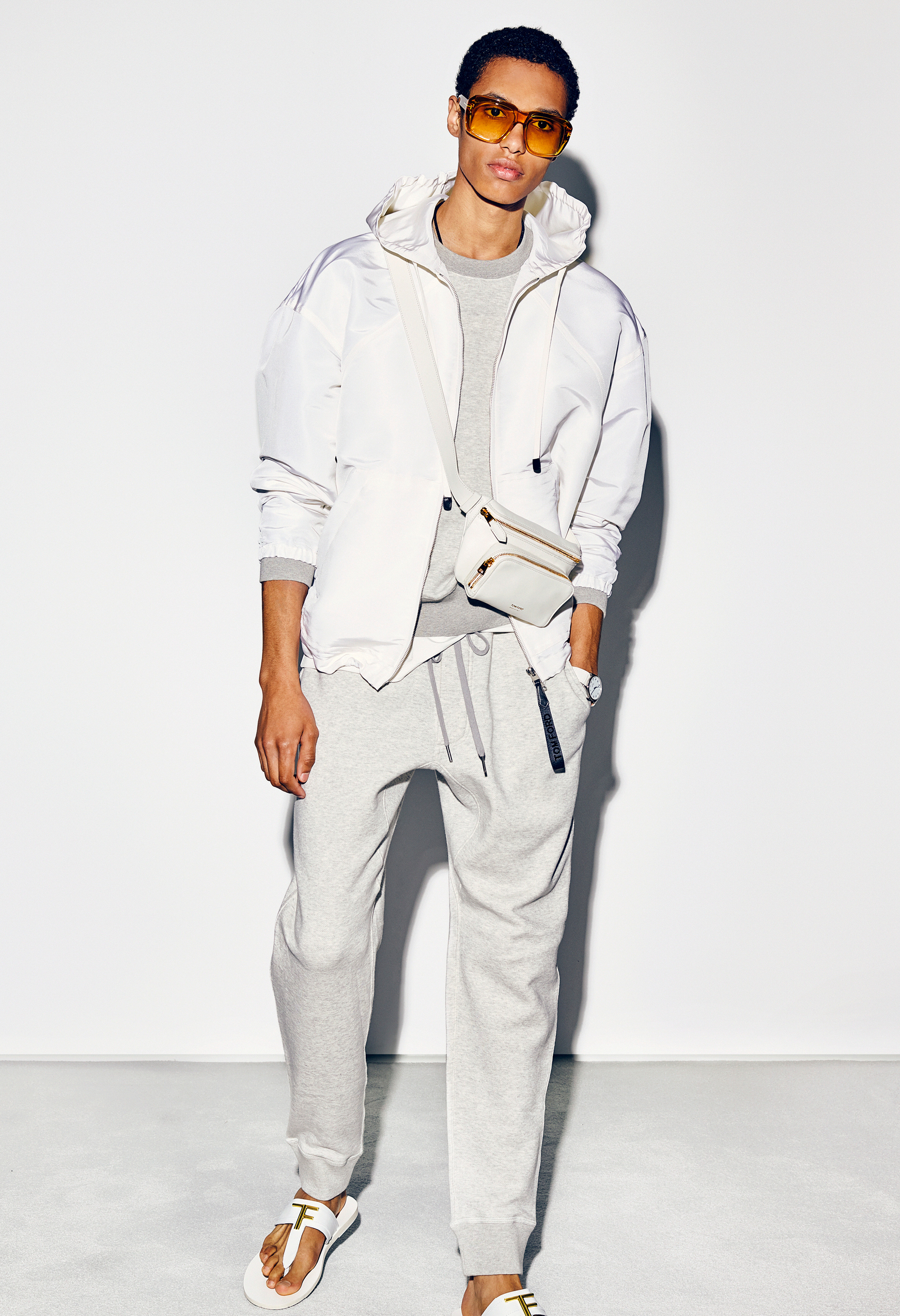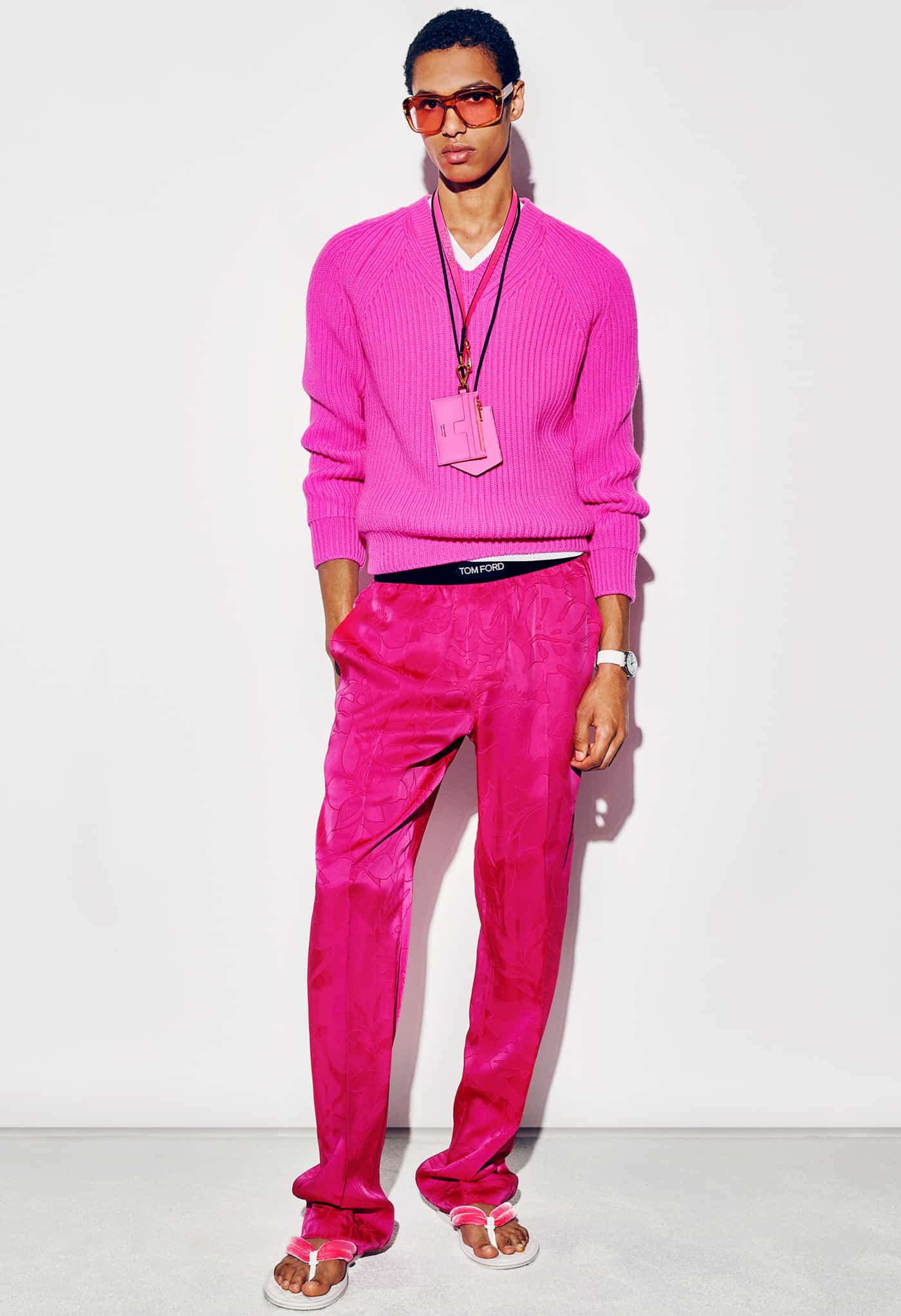 The menswear offering was similarly inclined, with no shortage of riotous hues of fuchsia, tropical orange, tomato red, and a regal shade of purple that has long since become Ford’s signature. Yes, there are hoodies, crewneck sweaters, and track pants: but this is as far from your Sunday couch potato uniform as it gets.
