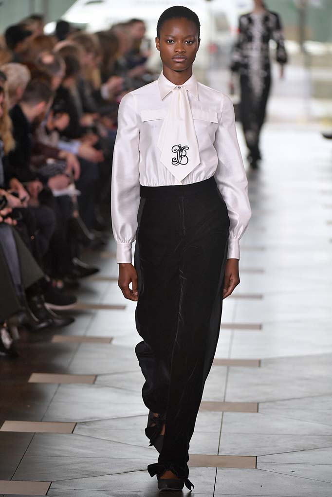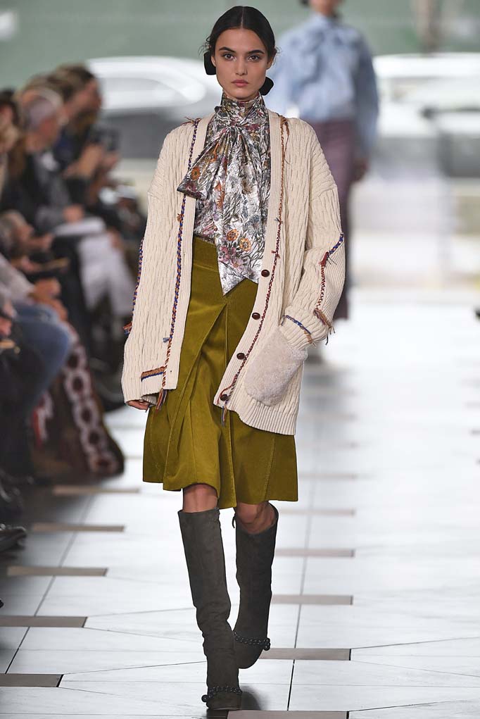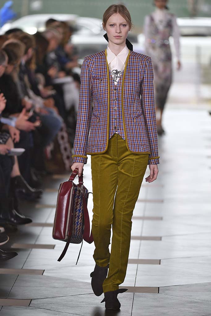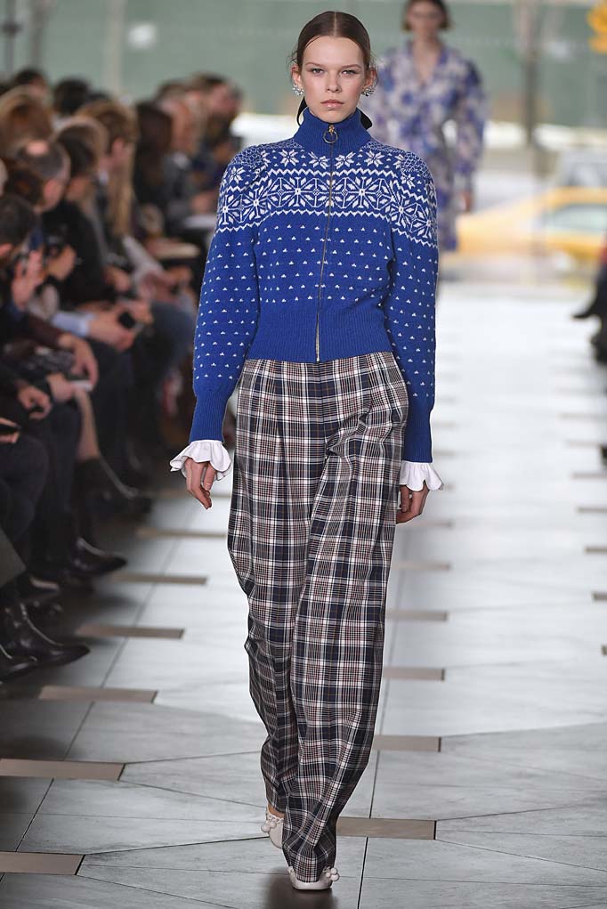 What does the prep school girl wear when she’s all grown up? Tory Burch, bien sûr. Tory’s girl is always buttoned-up, but this season was a nod to uniform dressing by way of knee-length pleated tartan skirts and conservative navy blazers. There was also a strong nod to the ’70s, the era in which Burch attended Bryn Mawr’s elite Agnes Irwin School. Collegiate style monogramming adorned jackets and neckties for the Ivy Leaguers. Fast-forward to the lady who lunches, and there were plenty of gorgeous caftans for those gallivanting around Palm Beach. And there you have your Tory Burch history lesson.