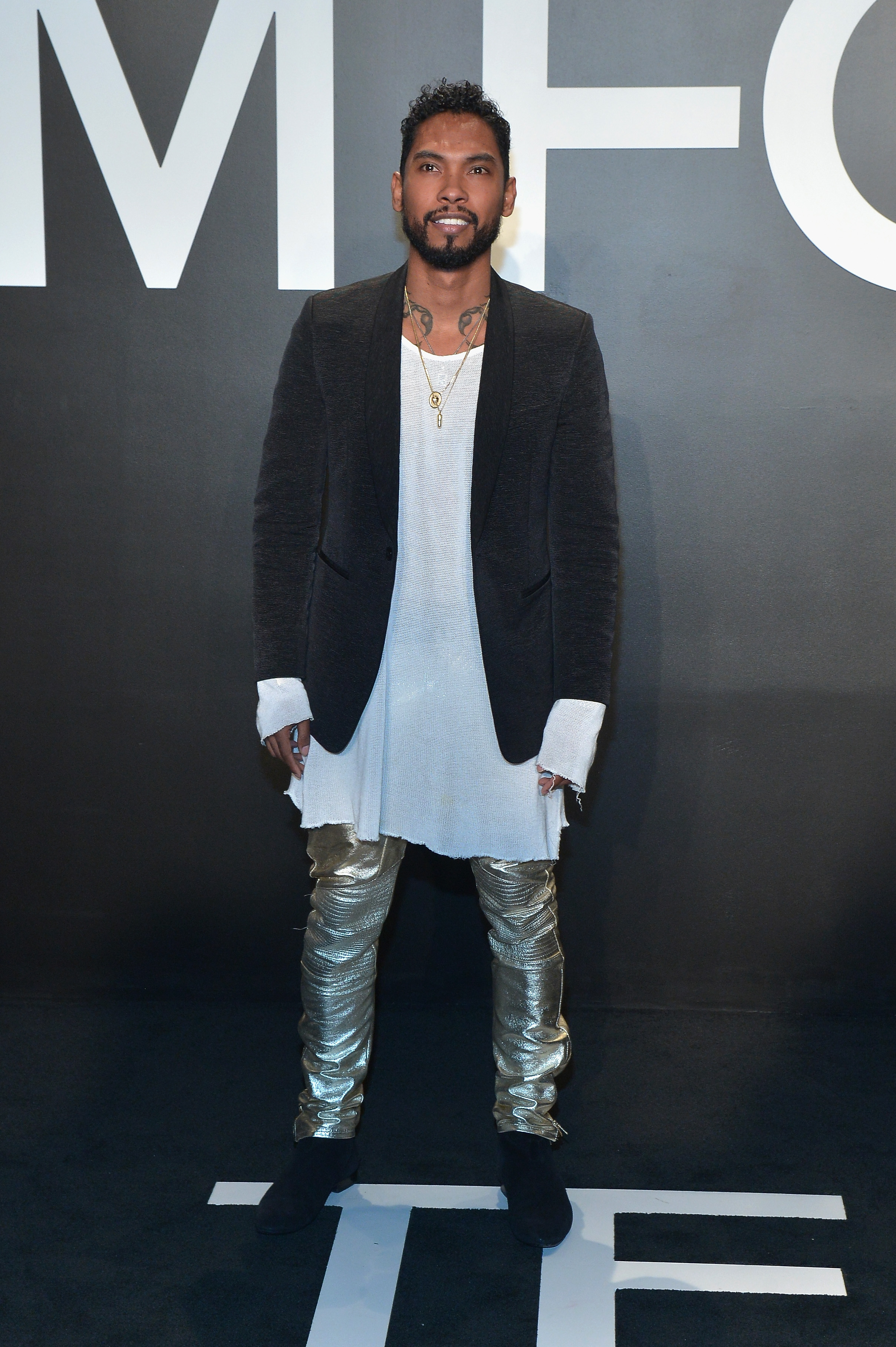 Male models carried large boxes filled with white rose petals and literally blanket the runway and everything around it. The air couldn’t have possibly smelled sweeter, much like one of Mr. Ford’s coveted fragrances. Across from section E1 was section B1, where Josh Duhamel and Fergie, Amy Adams (in a TF red velvet tuxedo), Scarlett Johansson (in a TF gold Pre-Fall 2015 dress, her hair coiffed in a faux-hawk) and Beyoncé in a TF black crystal mosaic dress avec Jay-Z, also in Tom Ford. Besides those chicsters, the two long front rows, which were slate gray ultra suede low banquettes, were filled with the likes of John Legend, J.Lo, Elton John, Rita Ora in a TF white tuxedo, Neil Patrick Harris, Miguel, Armie Hammer and Naomi Campbell dripping in TF gold sequins. Miley Cyrus sat close to her beau Patrick Schwarzenegger, who models for Mr. Ford. “I was in a bidding war at an amfAR event that he was at,” Cyrus told us. “And I outbid him on a piece of art.”