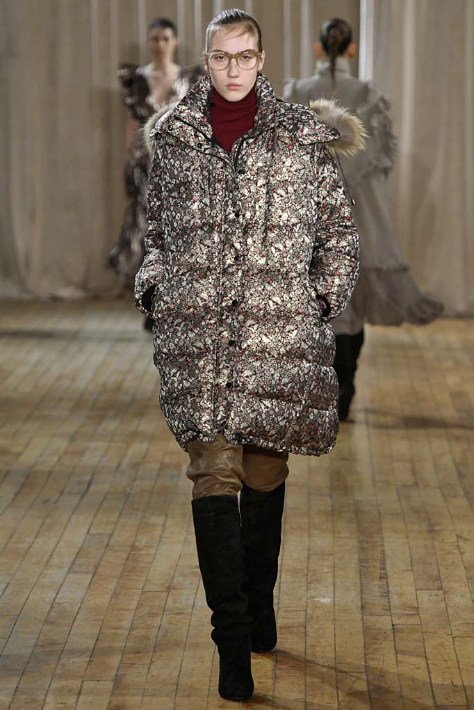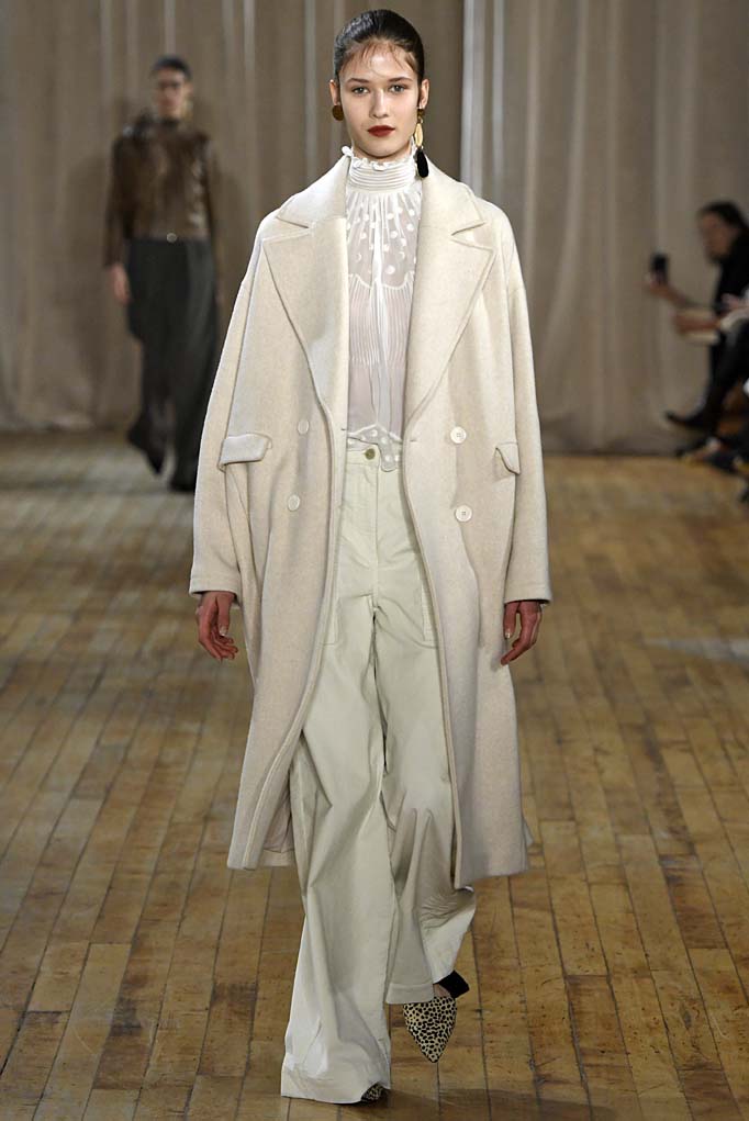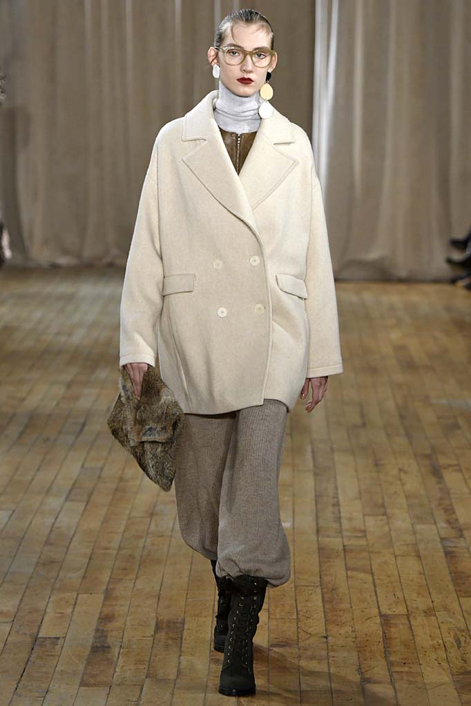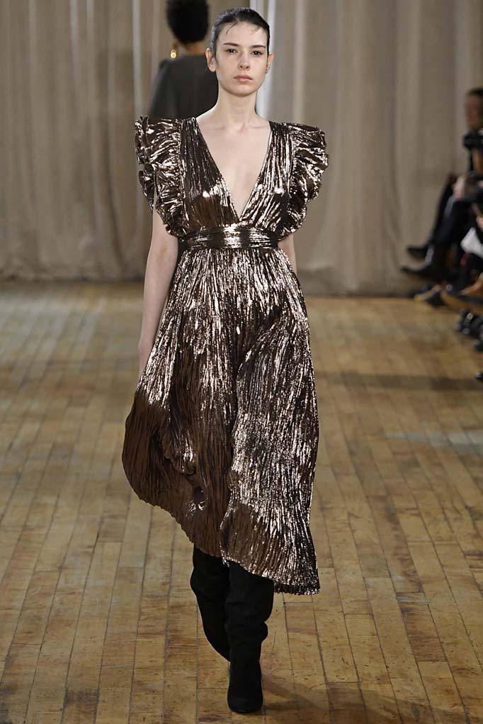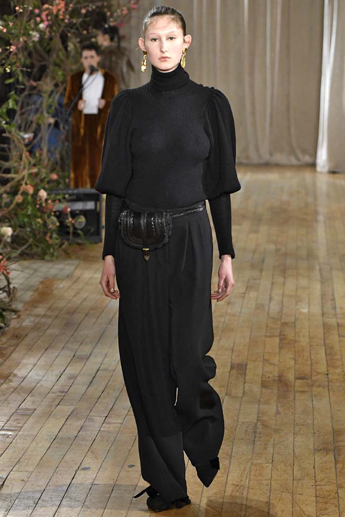 Thanks for the brief break from the ’90s, chérie. In her first runway show, Ulla Johnson looked to the disco decade for a little escapism from these tumultuous times. The most obvious reference was a deep-V metallic number that is destined for dinner at Bea. But Johnson remains known and loved for her knits, and true to form, she offered up a striped coat you’ll live in, along with ample cozy sweaters. The structured outerwear, especially a sumptuous shearling, left us wishing this had been delivered before the (ultimately ephemeral) blizzard. Still, we’re willing to wait.