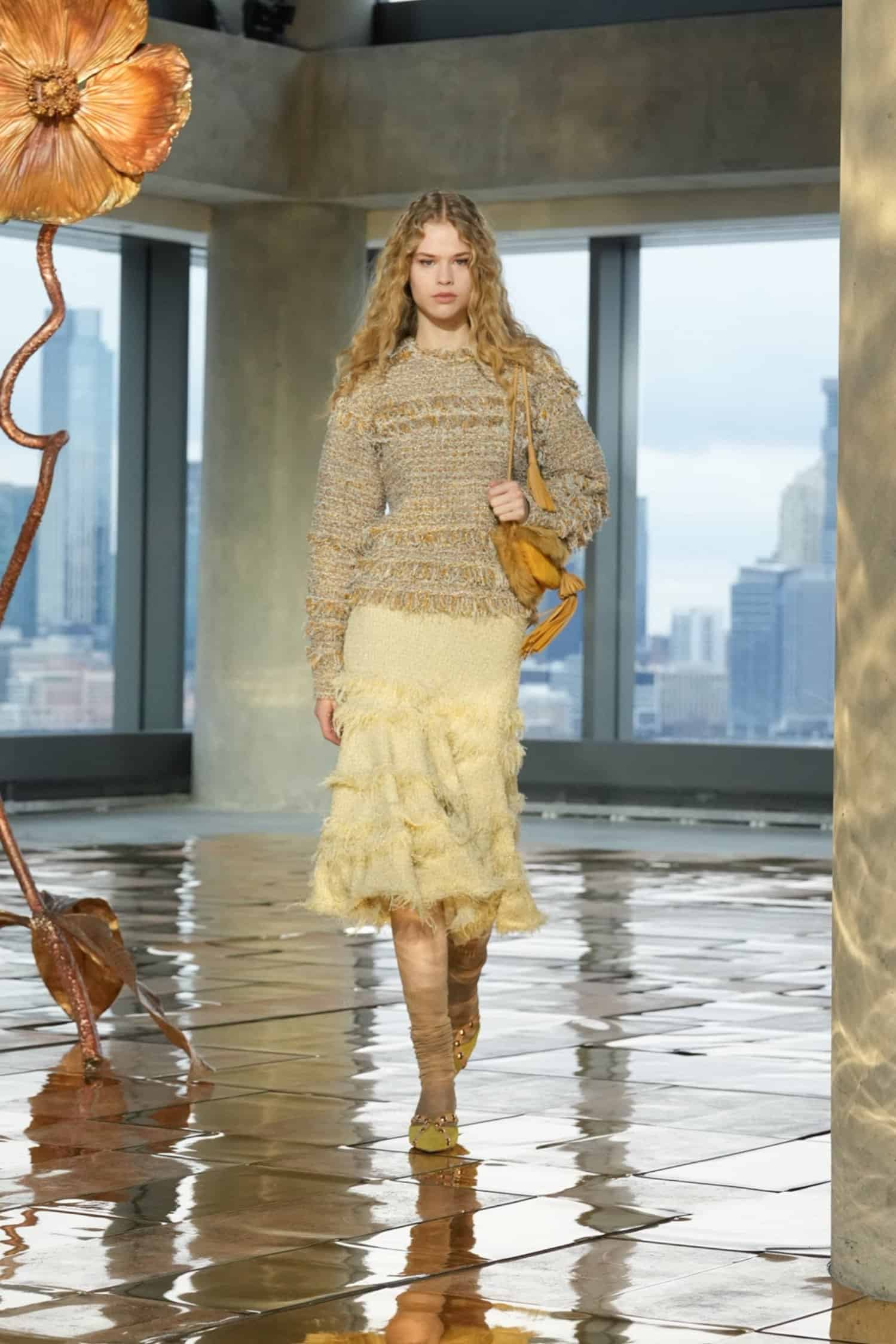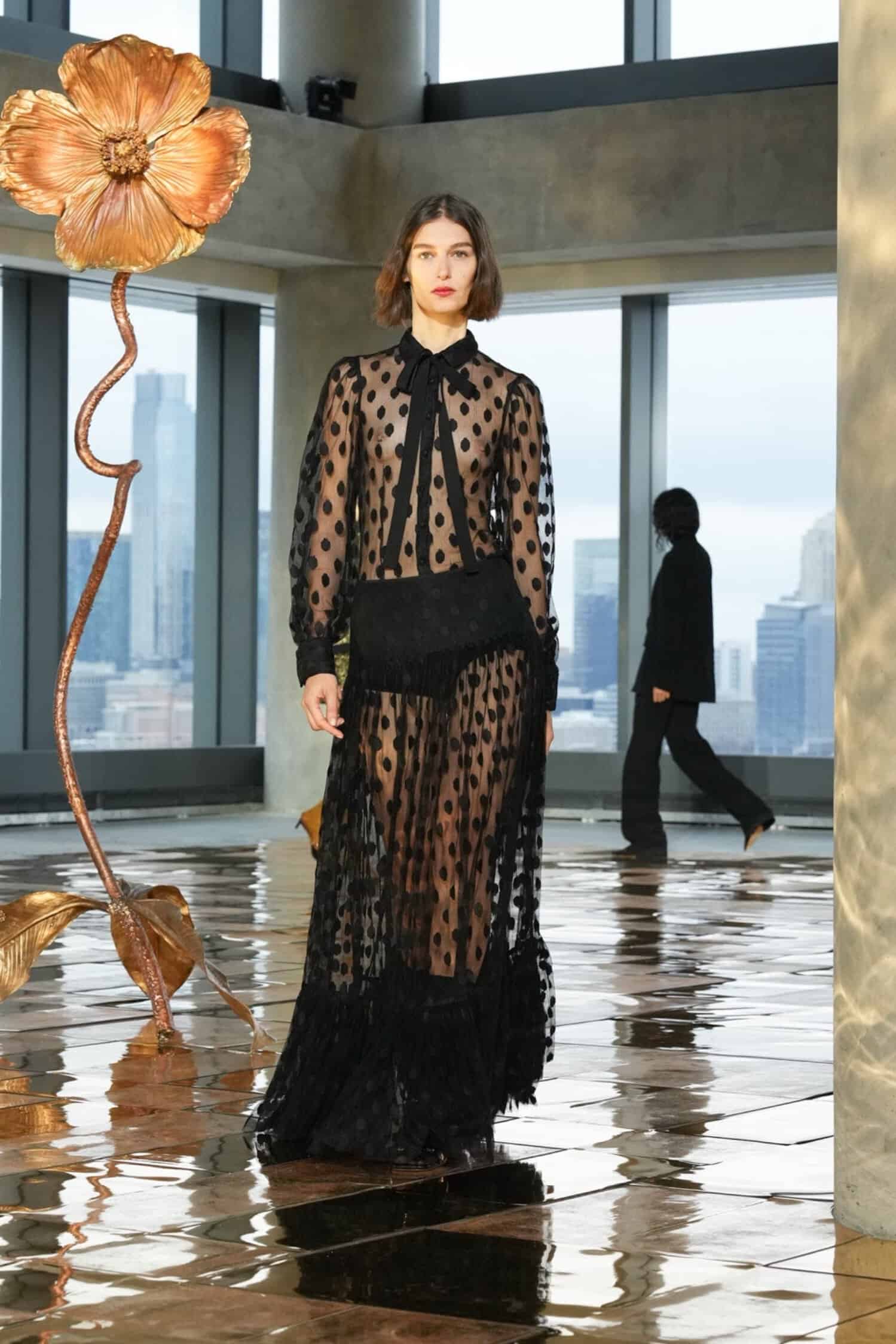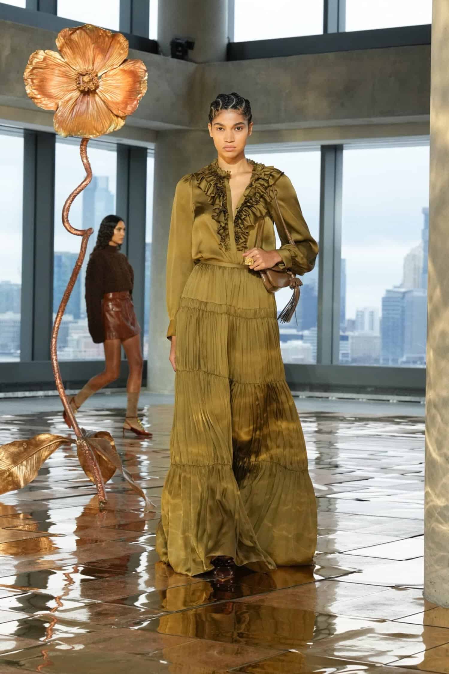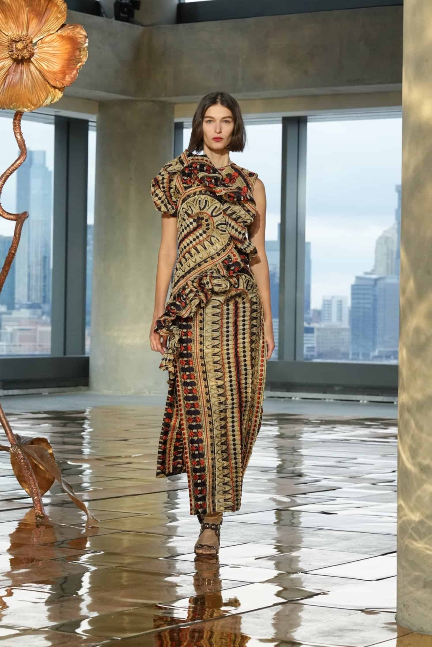 While rooted in her signature bohemian elegance, Johnson’s latest designs were also imbued with hope and the desire to celebrate beauty amidst dark circumstances. Metallic gold trailed down skirt hems, shimmered in tweed separates, and gleamed in allover patterns, akin to sunlight peeking through overcast skies. Silky midi and maxi dresses were elevated by pleated tiers, paisley prints, and subtle geometric patterns—as well as delicate three-dimensional trims that nodded to unfurling flowers. Textured sweaters, flounced dresses, and sheer blouses also provided bursts of color, from rich purples, maroon, and scarlet to earthy green and golden yellow tones.
