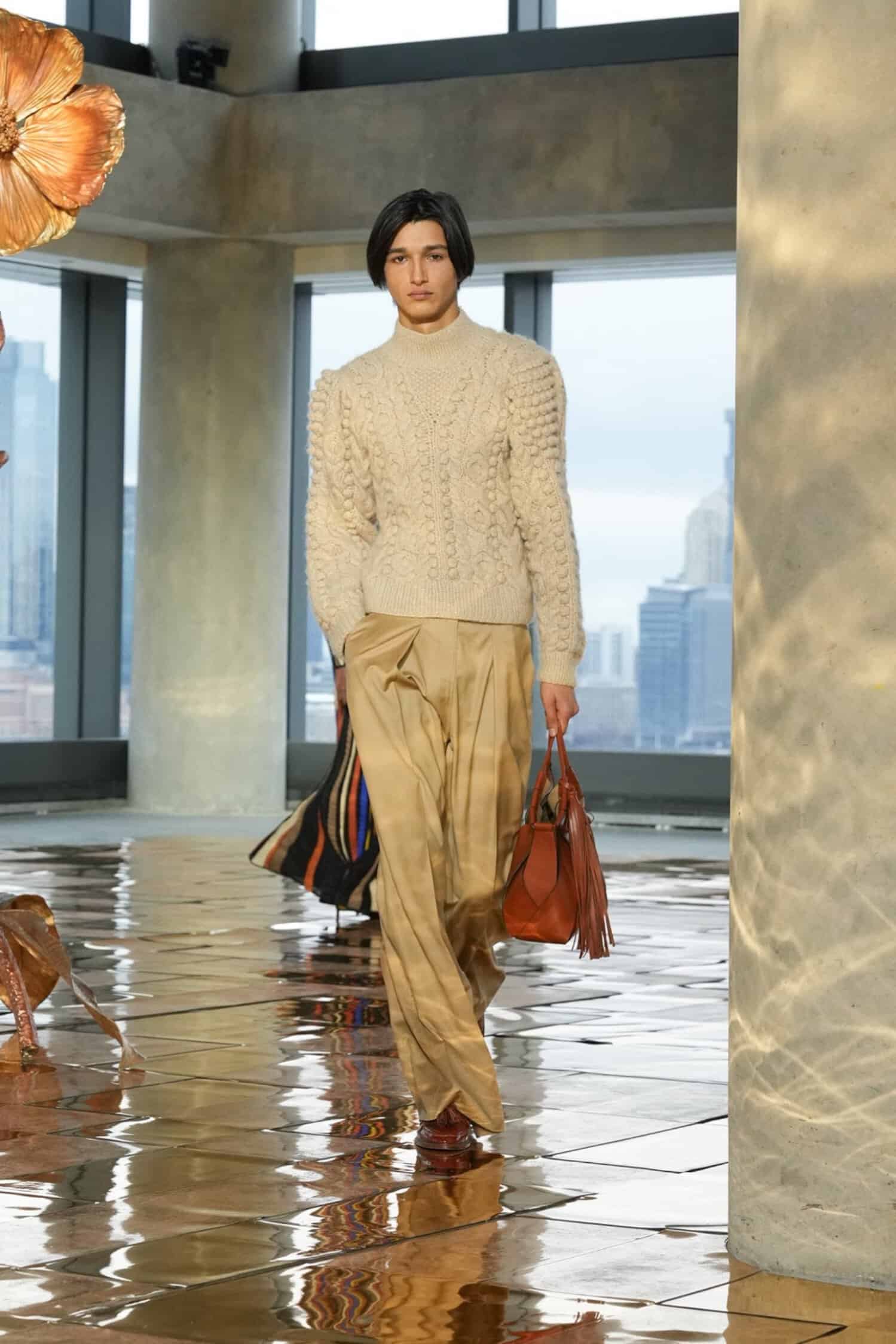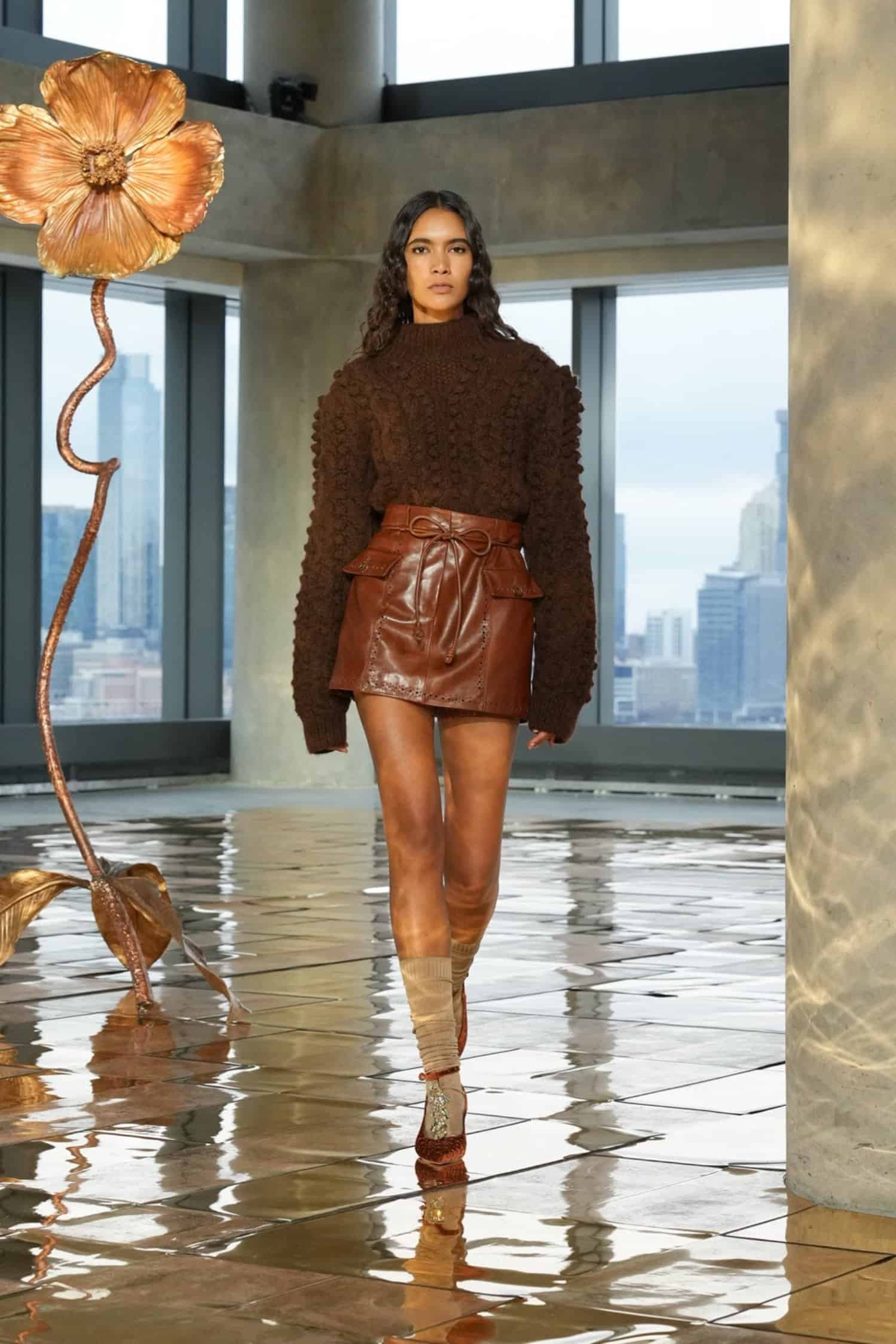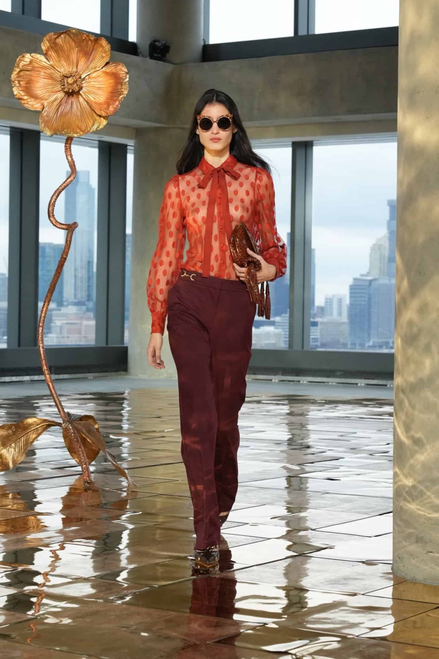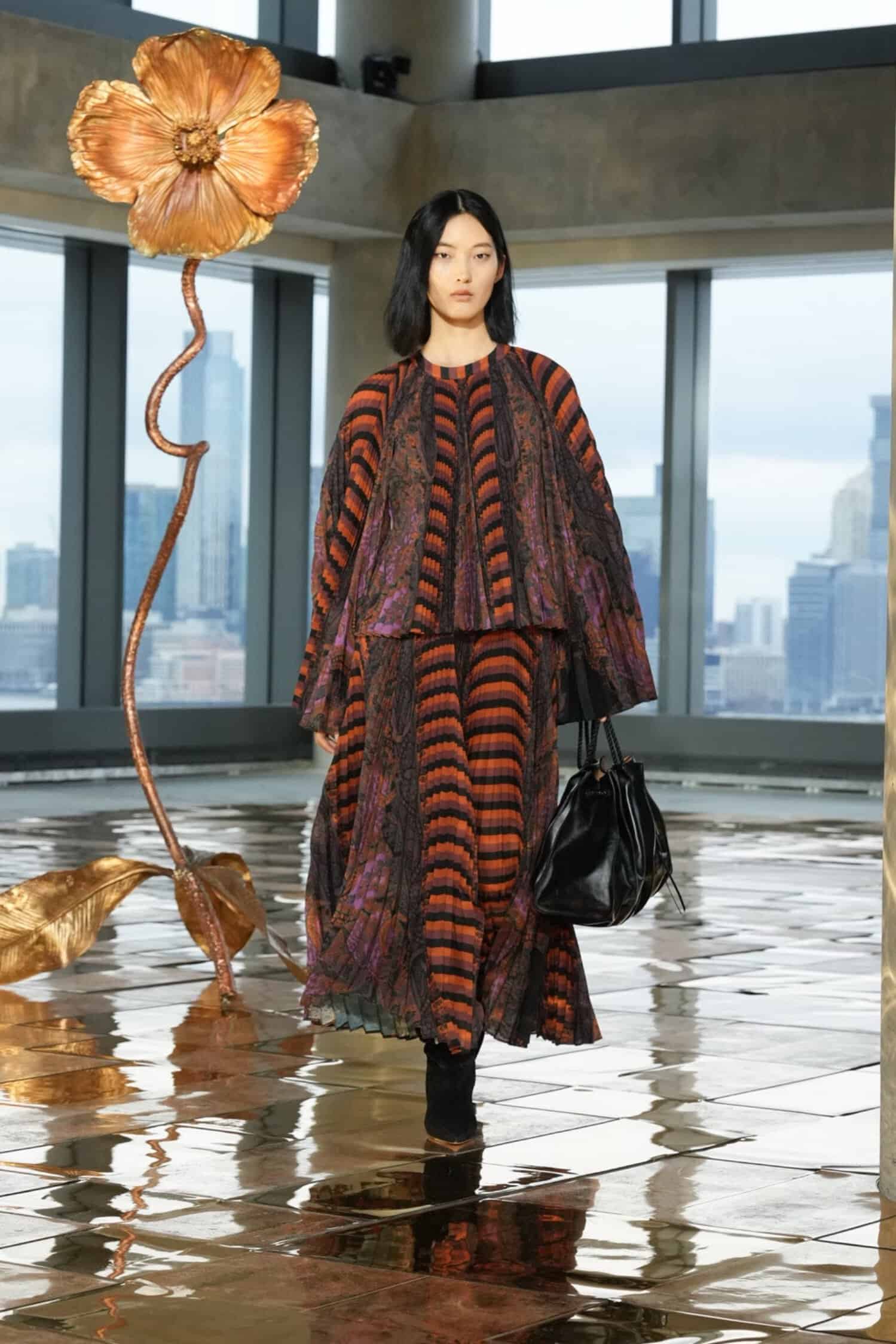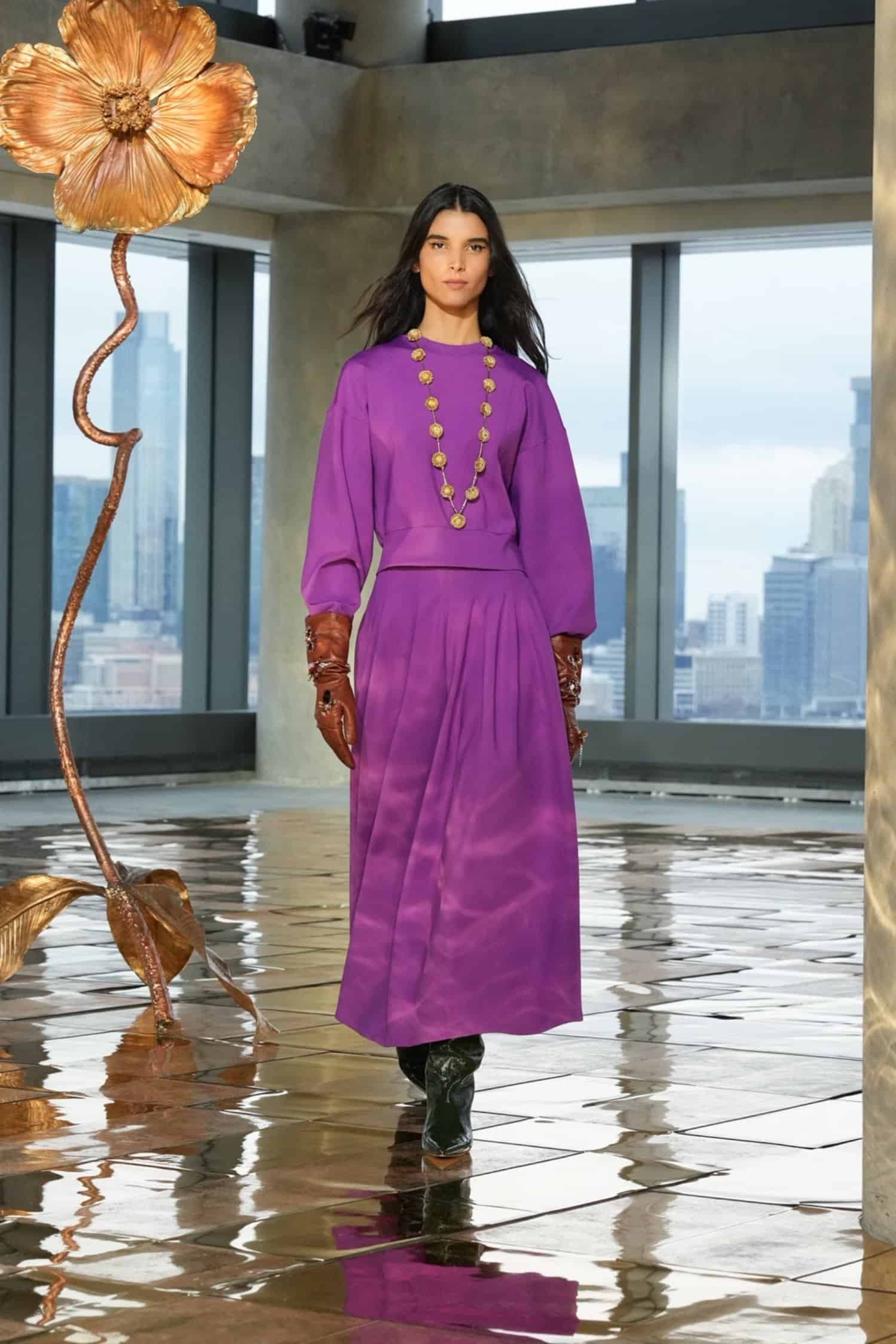 While rooted in her signature bohemian elegance, Johnson’s latest designs were also imbued with hope and the desire to celebrate beauty amidst dark circumstances. Metallic gold trailed down skirt hems, shimmered in tweed separates, and gleamed in allover patterns, akin to sunlight peeking through overcast skies. Silky midi and maxi dresses were elevated by pleated tiers, paisley prints, and subtle geometric patterns—as well as delicate three-dimensional trims that nodded to unfurling flowers. Textured sweaters, flounced dresses, and sheer blouses also provided bursts of color, from rich purples, maroon, and scarlet to earthy green and golden yellow tones.
