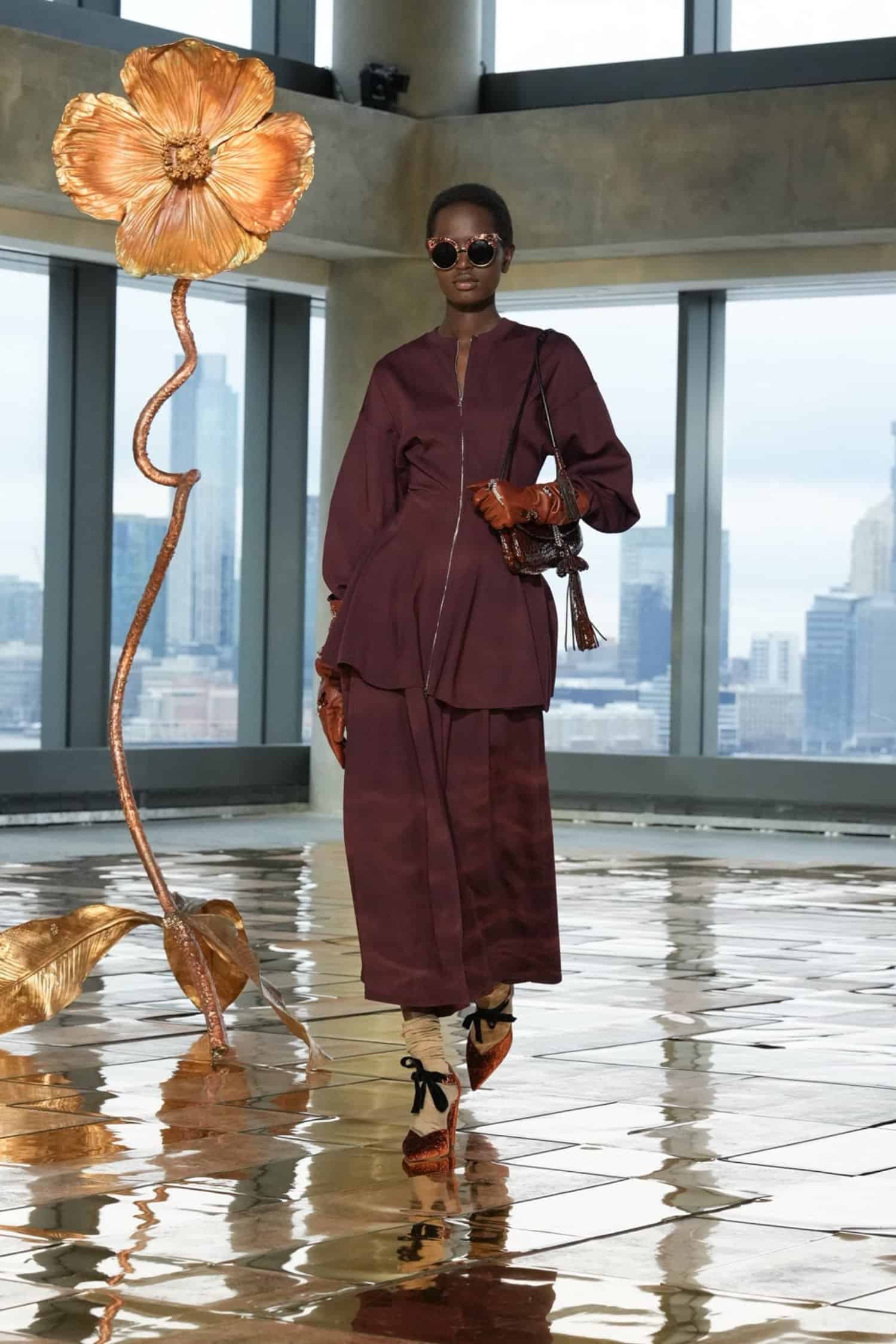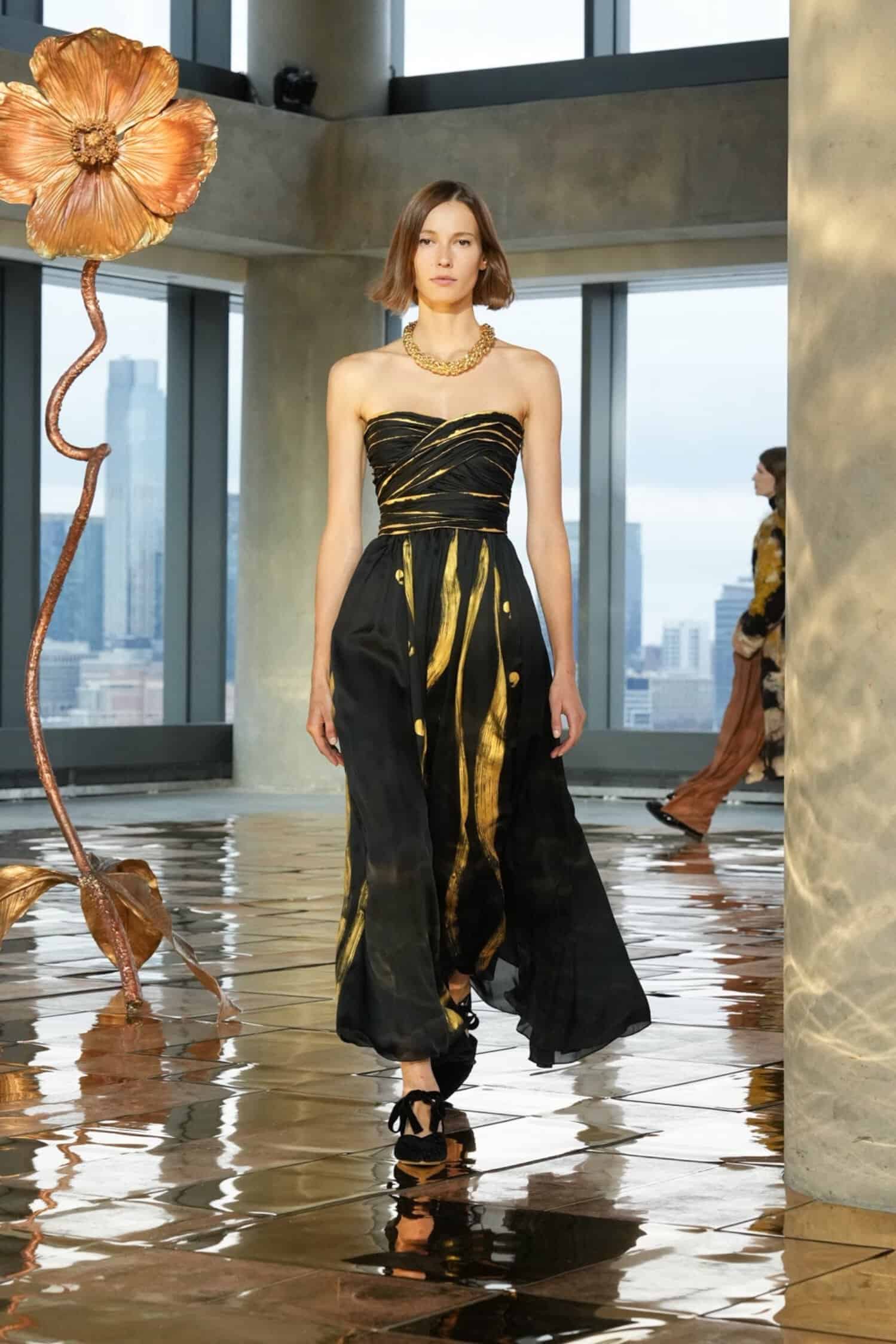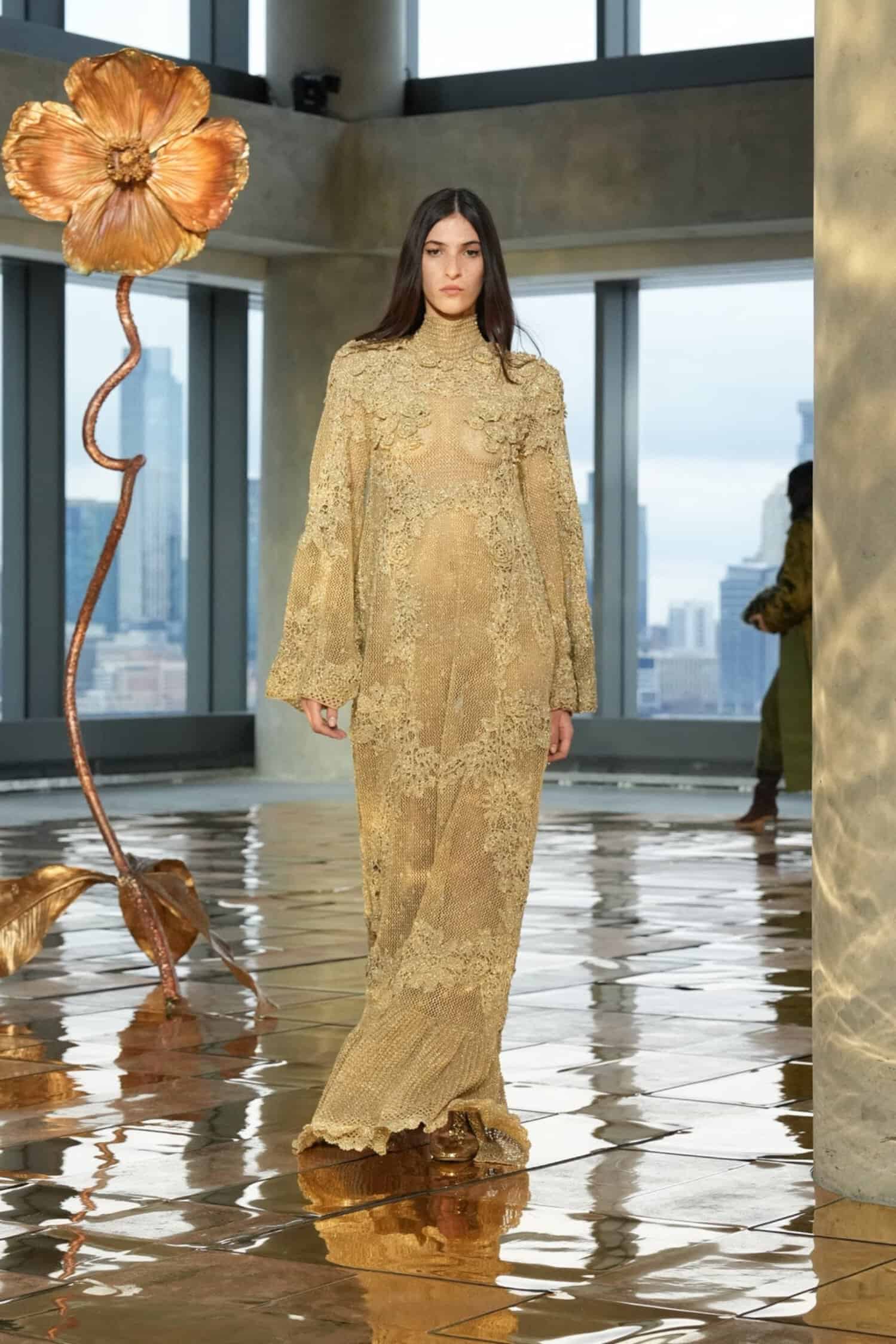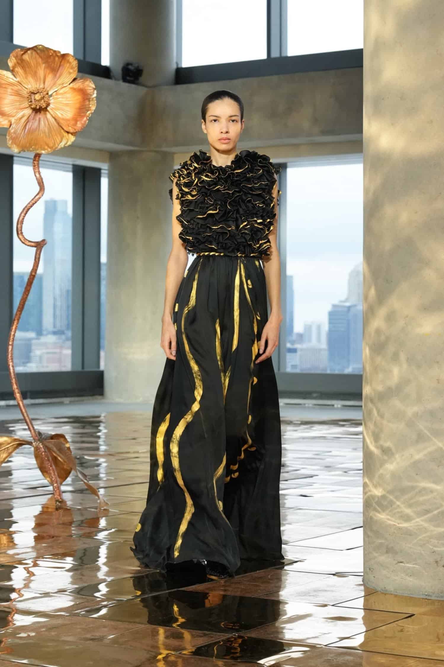 They say the darkest hour comes before the dawn—but at Ulla Johnson‘s Fall 2025 show during New York Fashion Week, daylight was breaking. As the sun lifted through the windows at 555 Greenwich Street, guests including Morgan Spector and Rebecca Hall, Danielle Deadwyler, and Laura Brown were abuzz, bringing an energetic start to the morning. That same optimism was central to Johnson’s shimmering collection, which preceded down a gilded runway punctuated by Julie Hamisky’s massive shining poppy sculpture, La Géante.
