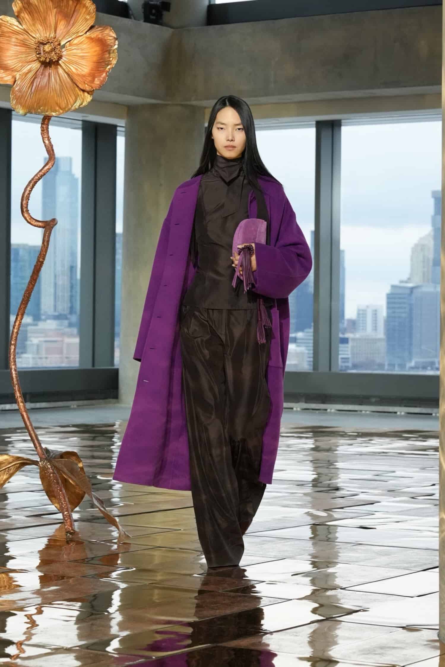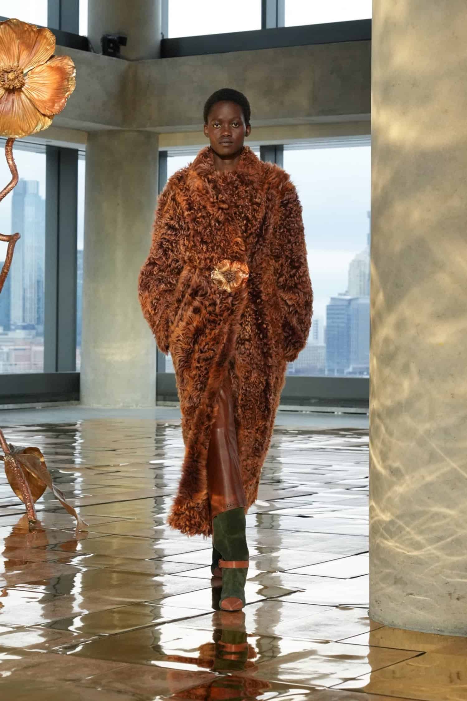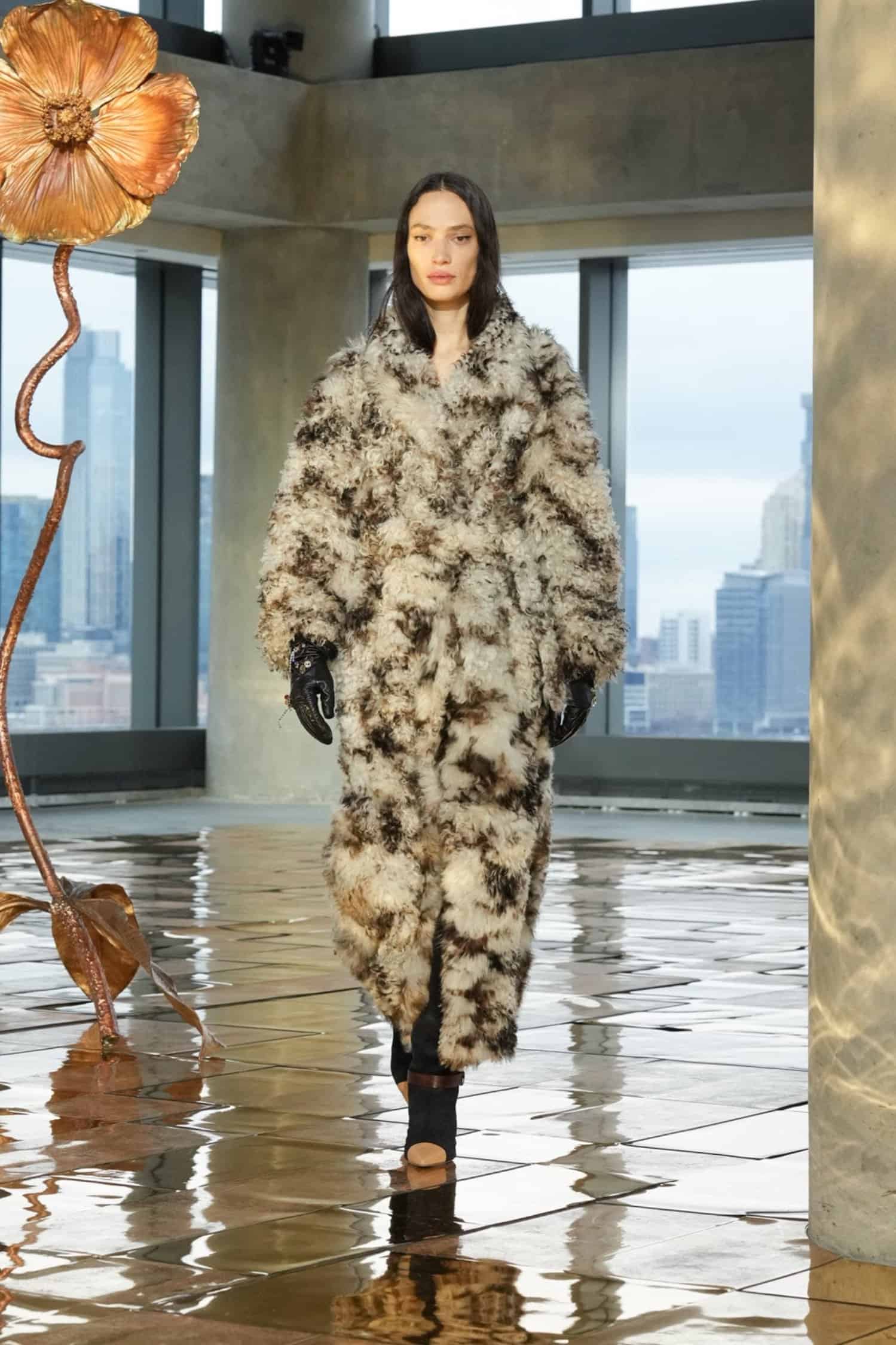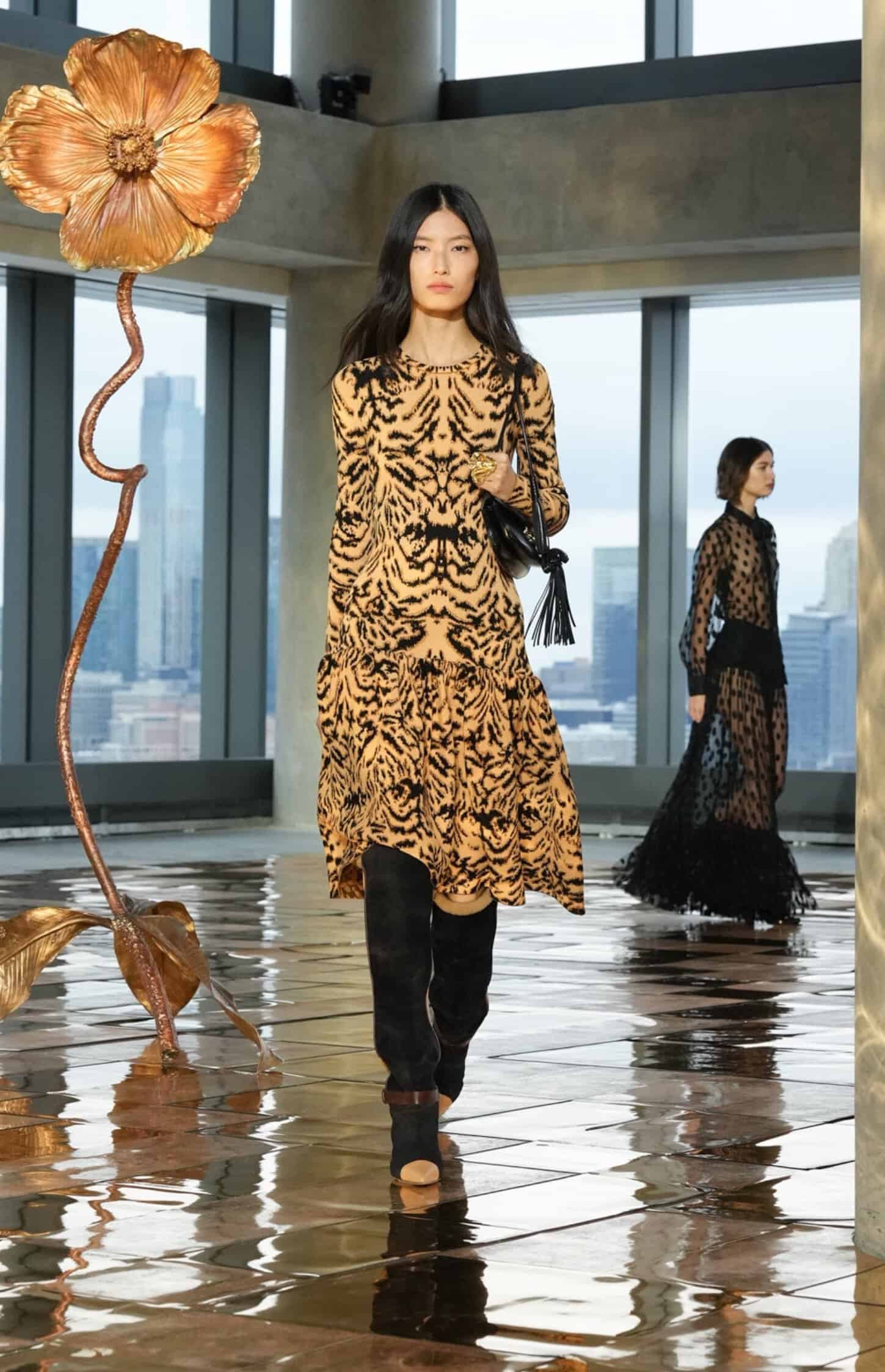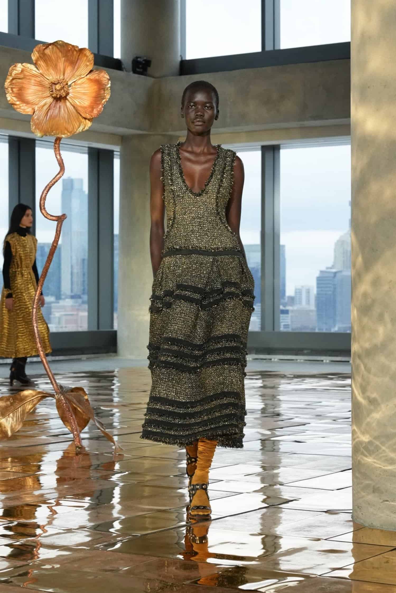 They say the darkest hour comes before the dawn—but at Ulla Johnson‘s Fall 2025 show during New York Fashion Week, daylight was breaking. As the sun lifted through the windows at 555 Greenwich Street, guests including Morgan Spector and Rebecca Hall, Danielle Deadwyler, and Laura Brown were abuzz, bringing an energetic start to the morning. That same optimism was central to Johnson’s shimmering collection, which preceded down a gilded runway punctuated by Julie Hamisky’s massive shining poppy sculpture, La Géante.