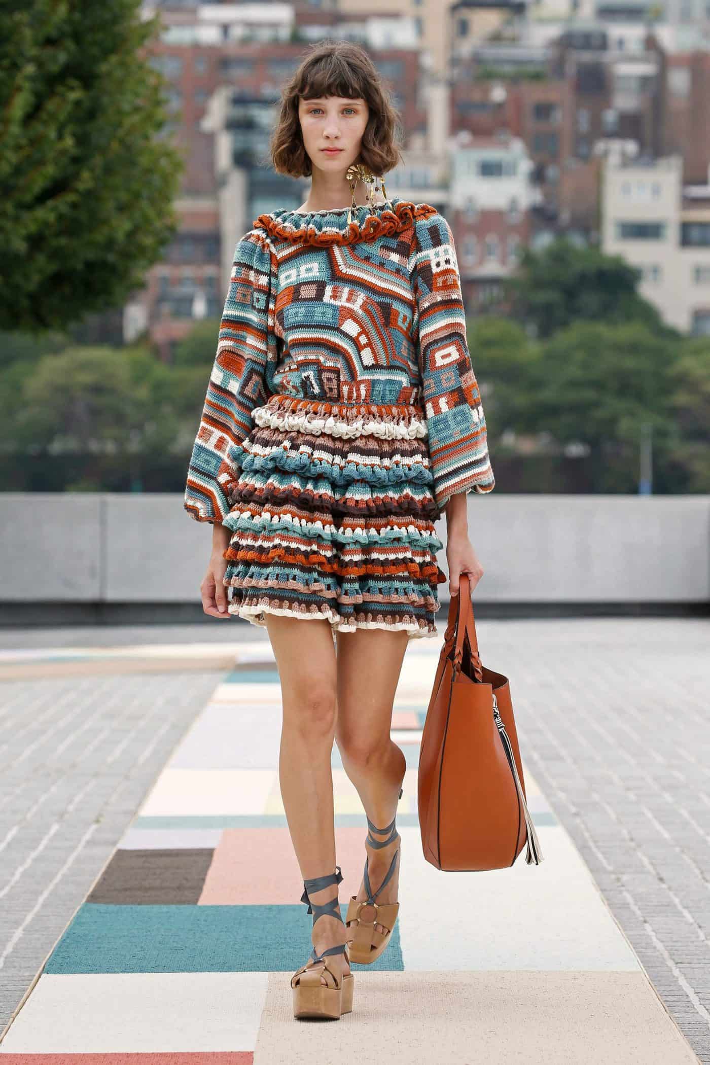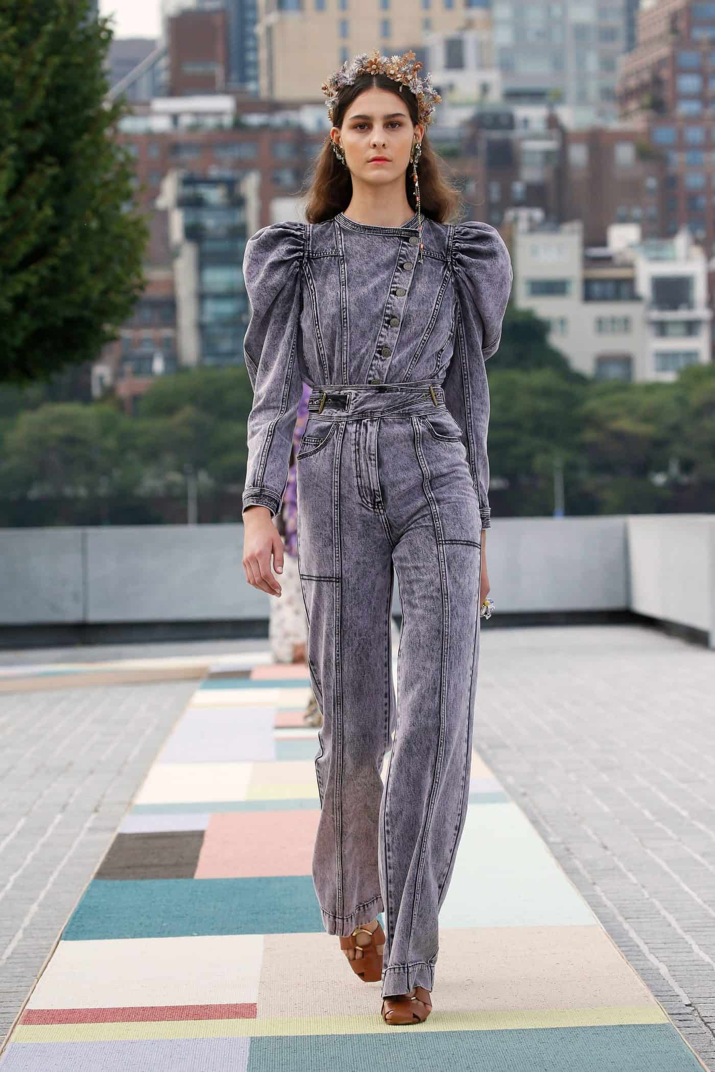 But even with the noticeable influence of The Land of the Rising Sun, the collection was textbook Johnson to its core. Think: molded and puff sleeve shoulders, cloqué and crochet detailing, tiered and ruffled skirts, utilitarian faded denim jumpsuits, and bursts of coral and violet mixed in with ethereal white and earthy tones.