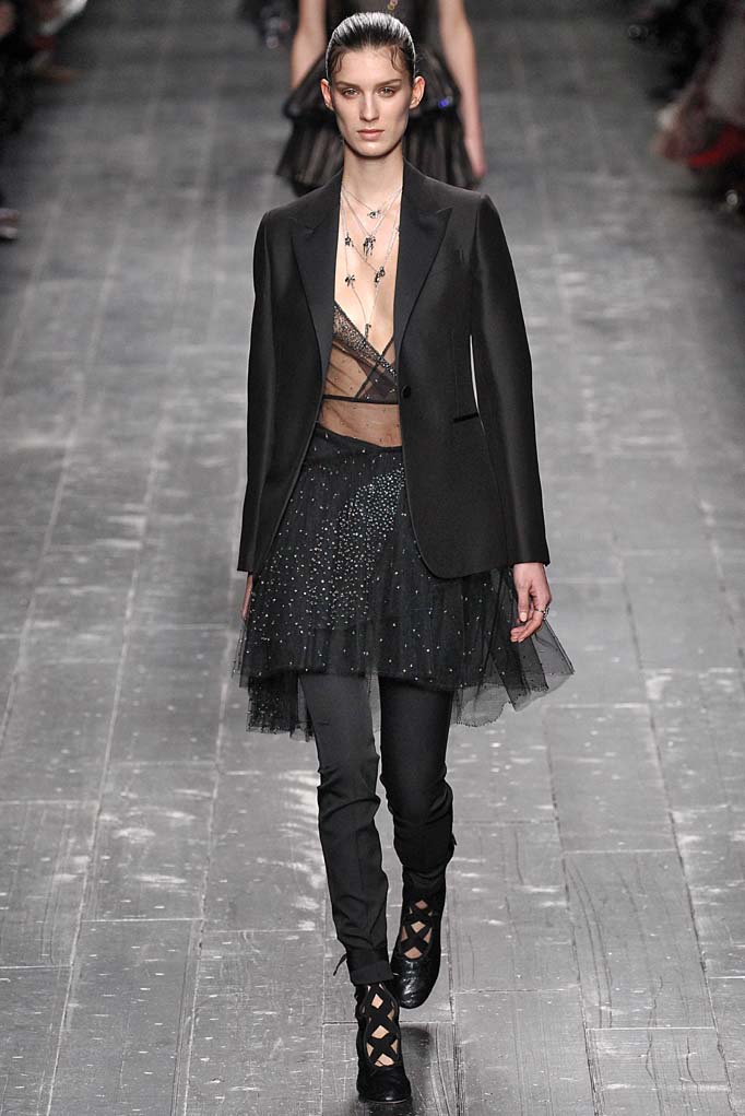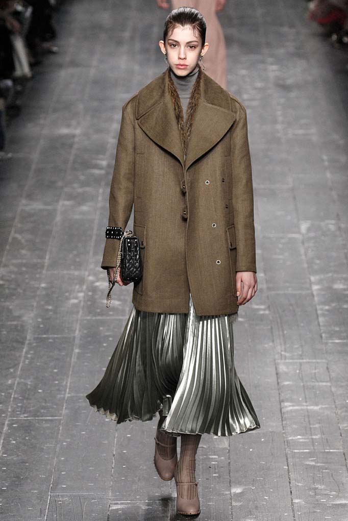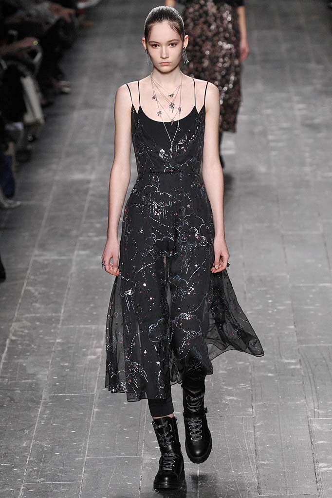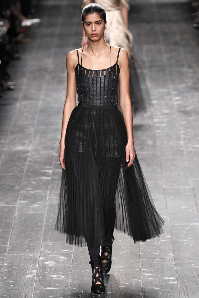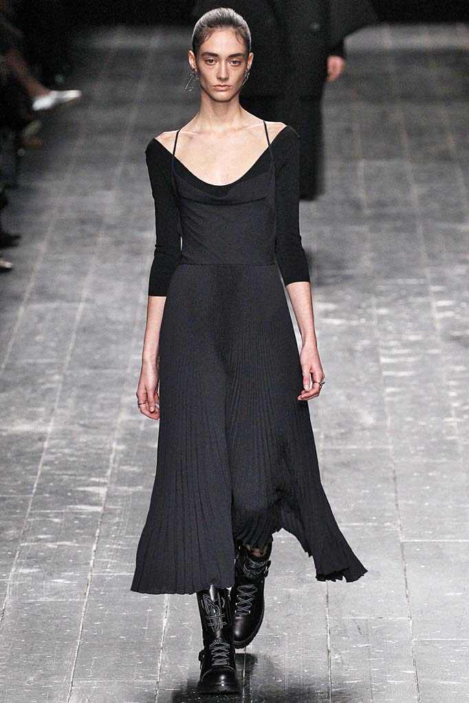 Chez Valentino romance is always in the air and this season took inspiration from ballet and modern dance, which felt like a natural fit for the brand. Valentino Garavani designed costumes for the New York City Ballet four years ago, after all. But Maria Grazia Chiuri and Pierpaolo Piccioli debuted the collection with a string of edgier and mostly all black pieces—they felt like something a cool modern ballerina like Misty Copeland might wear in her time off or on her way to the ballet studio. Bags were slung across the chest and combat boots were paired with tulle skirts and pleated dresses.