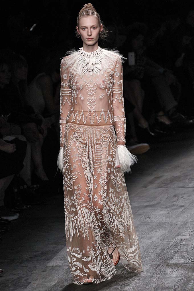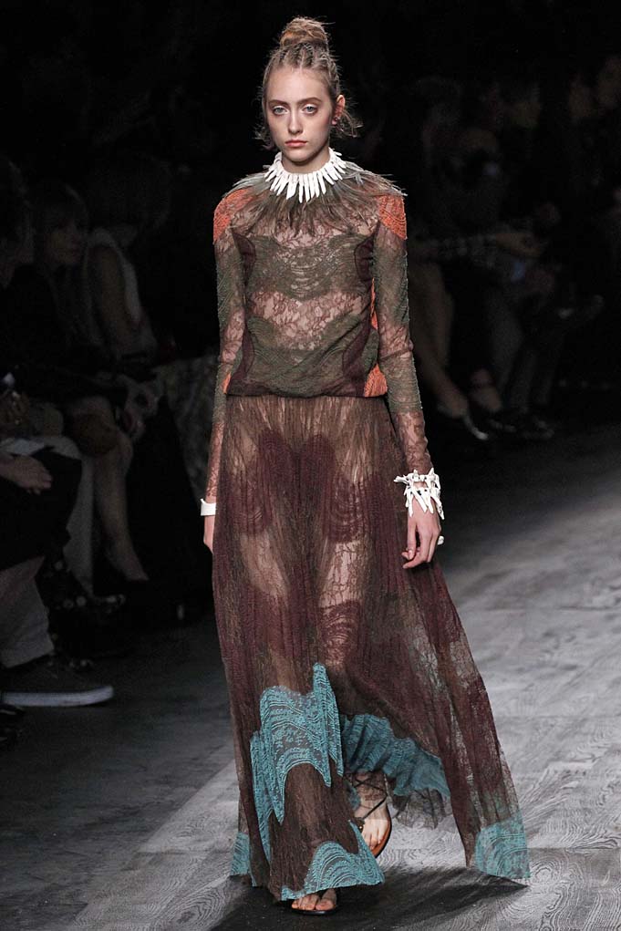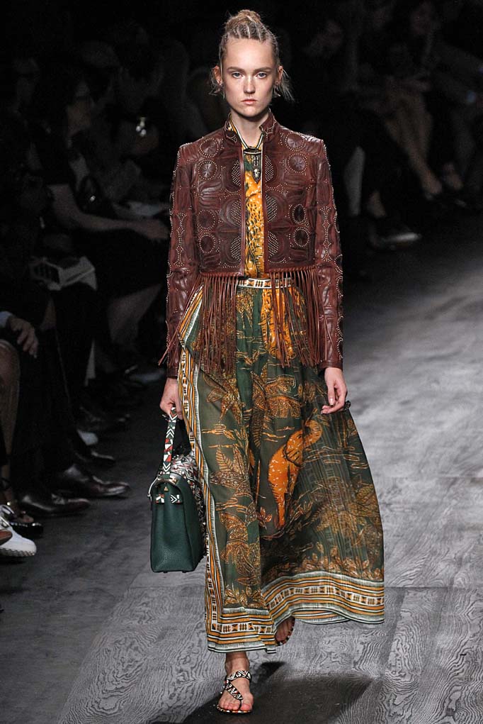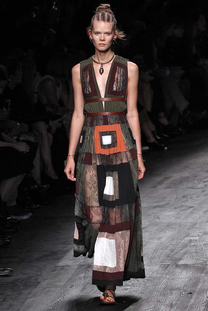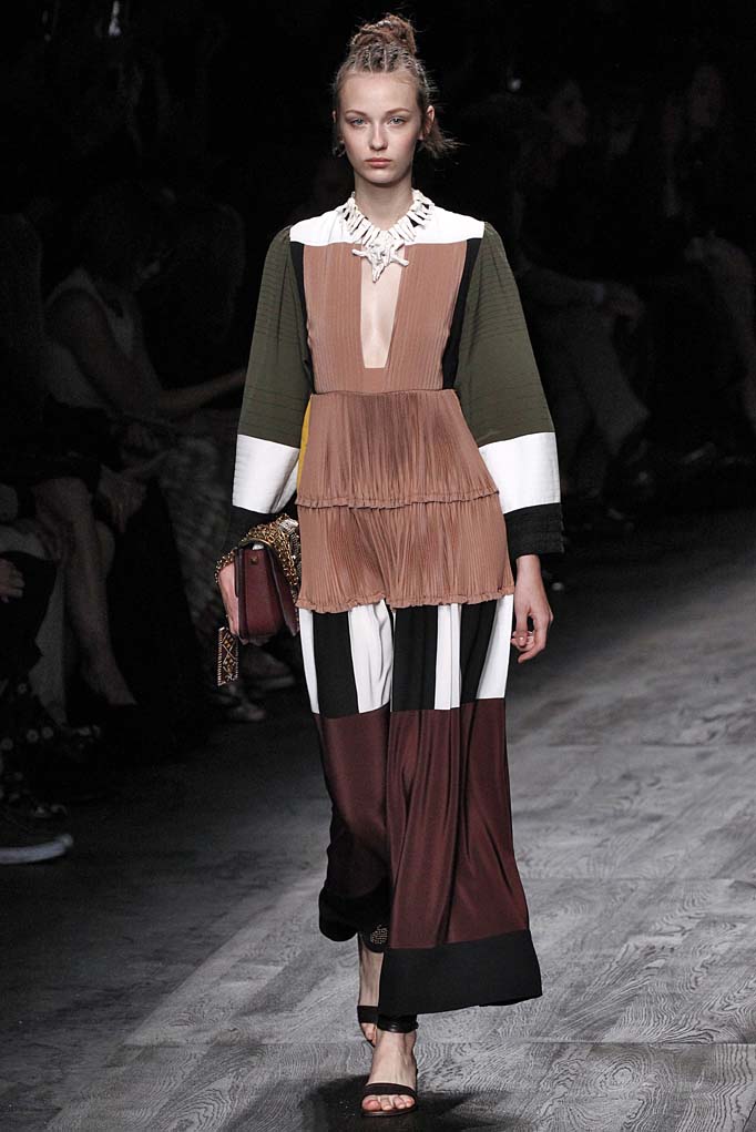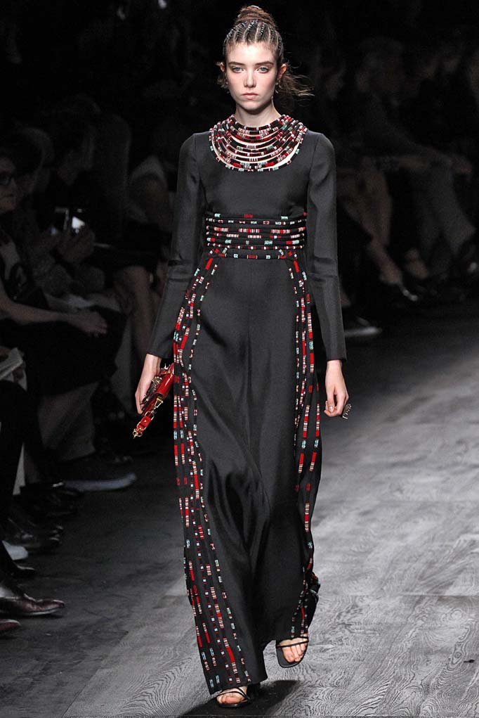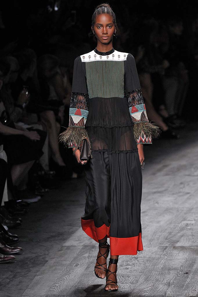 Socially driven is certainly one way to describe the Valentino Spring ’16 collection. The clothing, including white ceramic jewelry that looked like teeth and Masai-inspired patterns, may appear to have some major African influences, and that was entirely intentional. Maria Grazia Chiuri and Pierpaolo Piccioli were inspired to remind their audience of the tens of thousands of African refugees who in the past year have been flooding southern Italy. A social conscience is surely, in more ways than one, something beautiful.