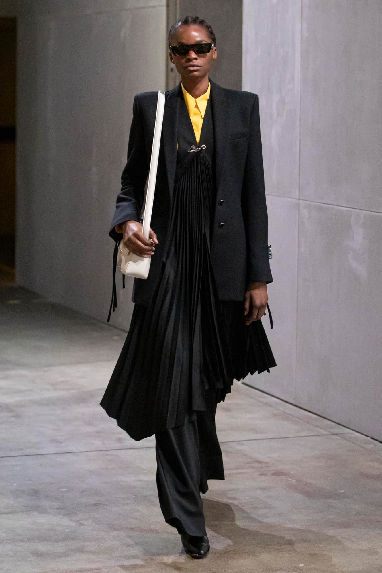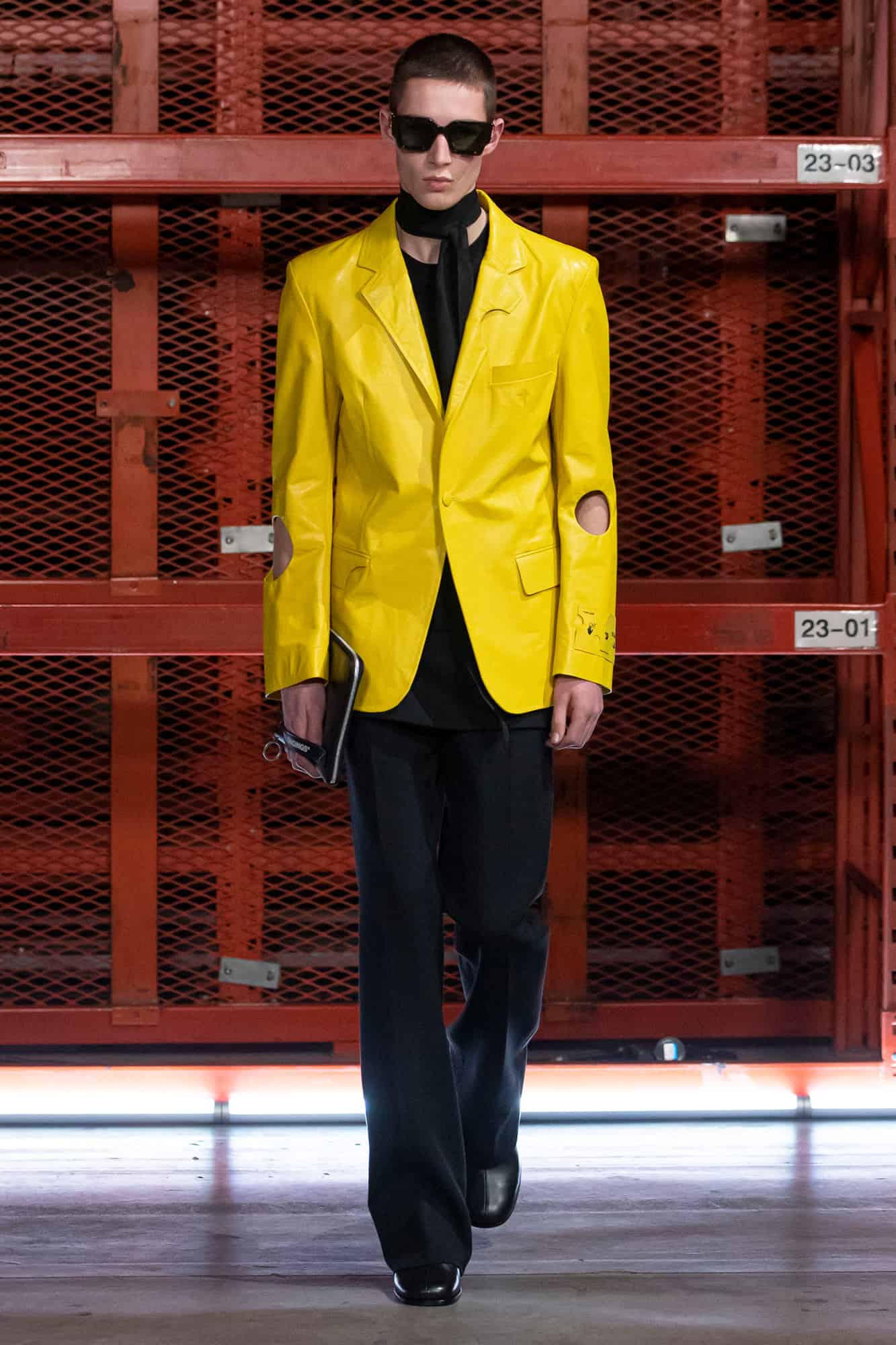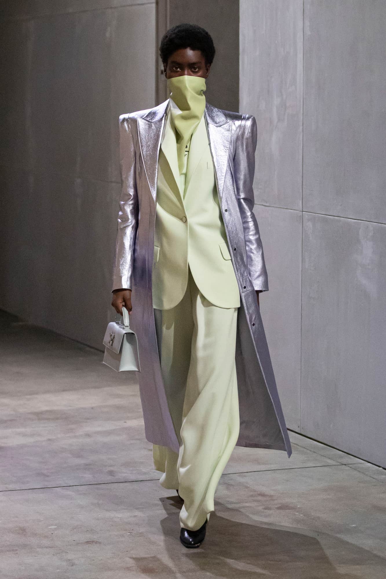 As for the garments themselves, styled by Dazed’s new editor in chief Ibrahim Kamara, sought to reference everything going on in the world right now: from racism to politics and the environment. With knife pleats, sharply-cut tailoring for both sexes (those shoulders!), and a body-clinging, cut out dress, it was an offering that is sure to go down a treat with Abloh’s A list fan club. What’s more, it’s the first time we’ve really seen a major designer incorporate face coverings on the catwalk in recent seasons too.