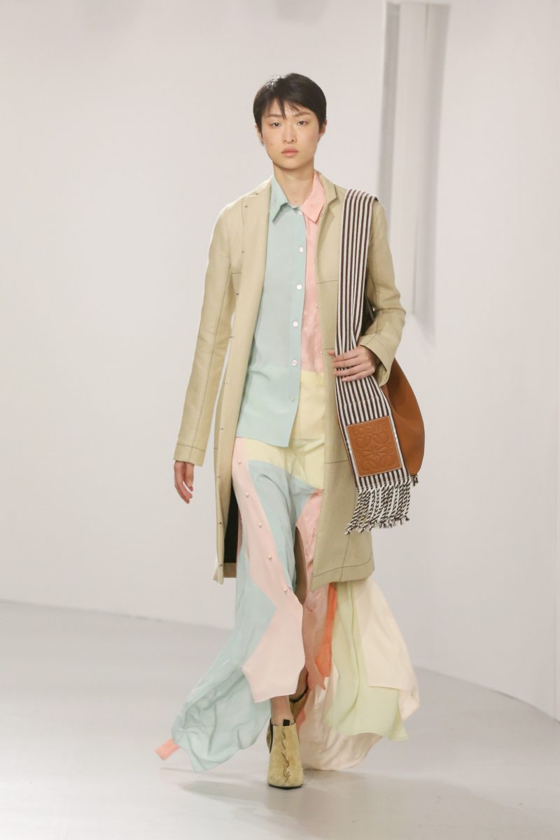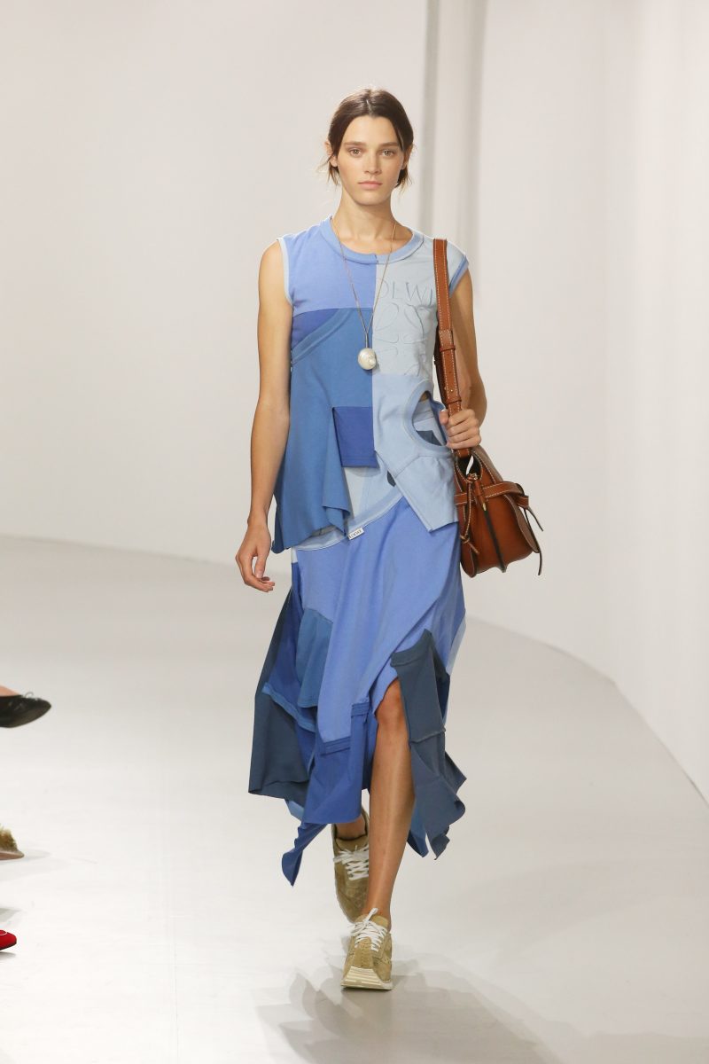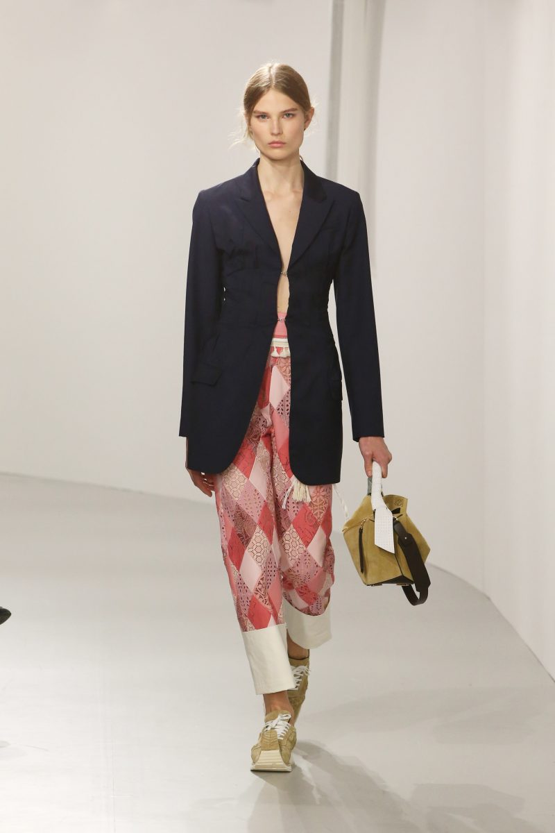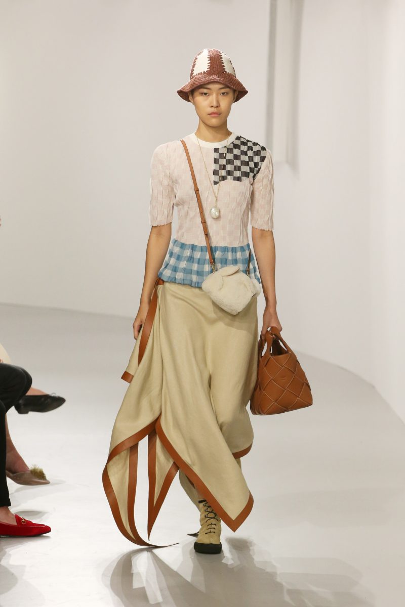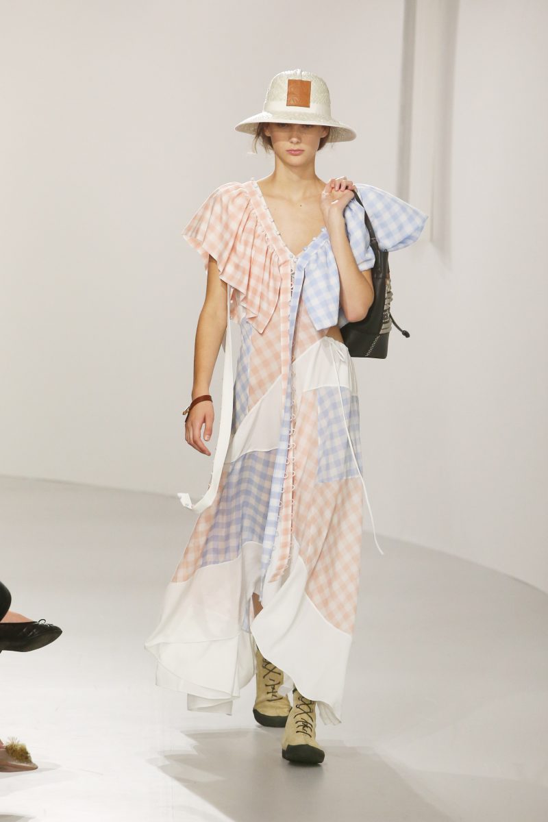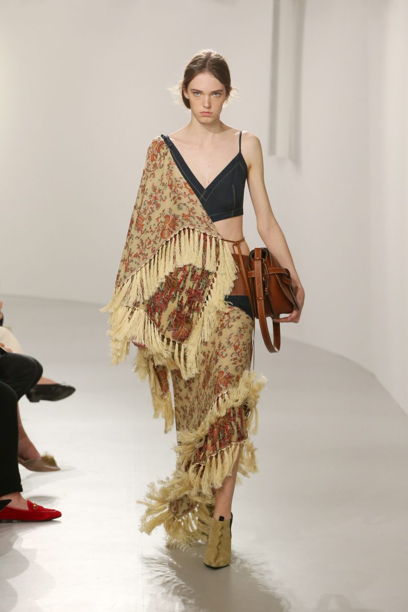 Another designer focusing on craft and folk art this season was Jonathan Anderson for Loewe. Slim body clingers came laid with patchwork quilting—traditionally in a multitude of fabrics and also in various shade of gingham. Prairie patterns came as a peplum tops paired with slit pencil skirts. Models wearing pieces like a dress that looked as though it had been cut from a table cloth or rug (fringe and all) came with a bag slung behind the shoulder like a boho hobo. T-shirts and sweatshirts with Loewe insignia came with fringed fabric and a wrap waisted blue blazer with gingham detailing paired with wide leg cropped grey pants and a sunhat were reminiscent of a modern day Huckleberry Finn. It was cross-continental cool country chic.