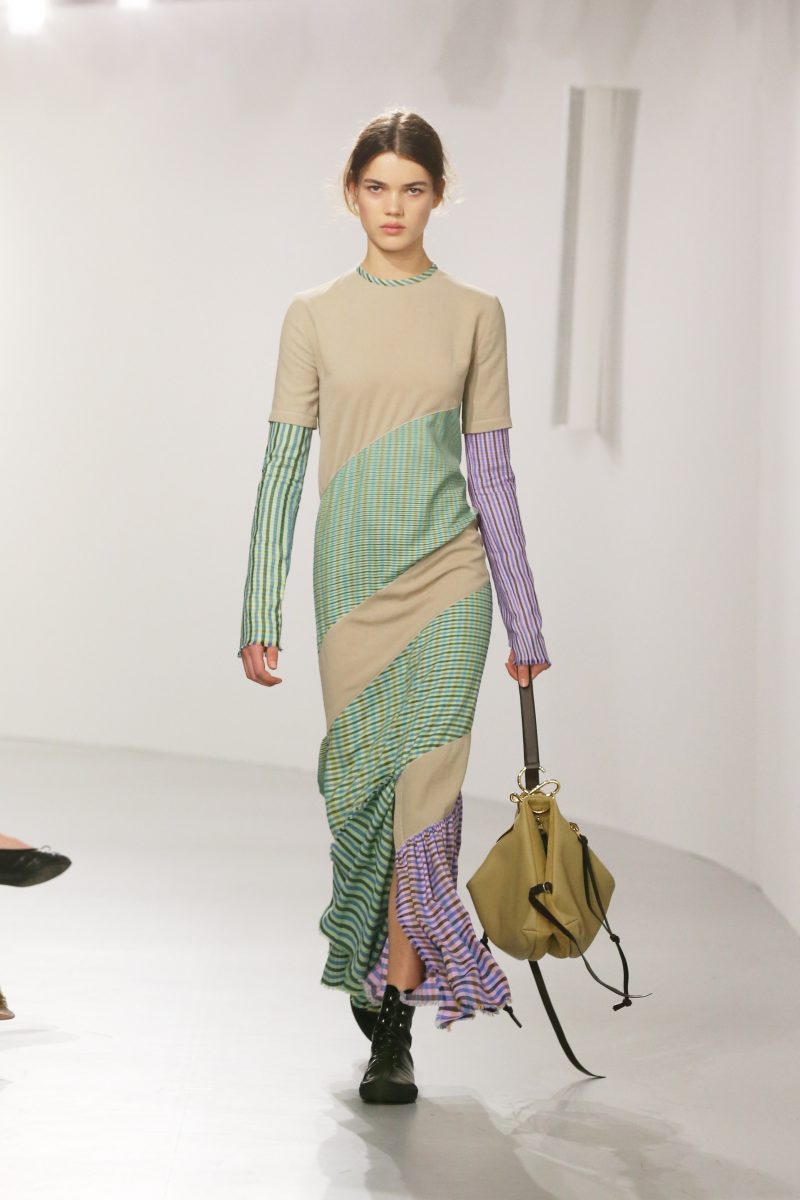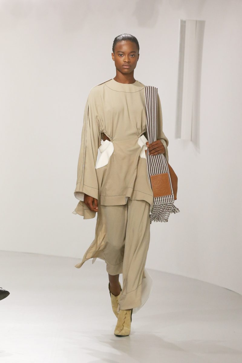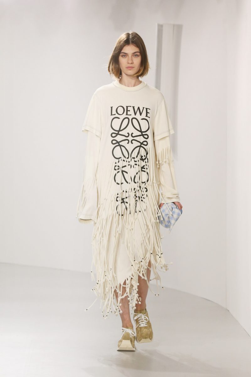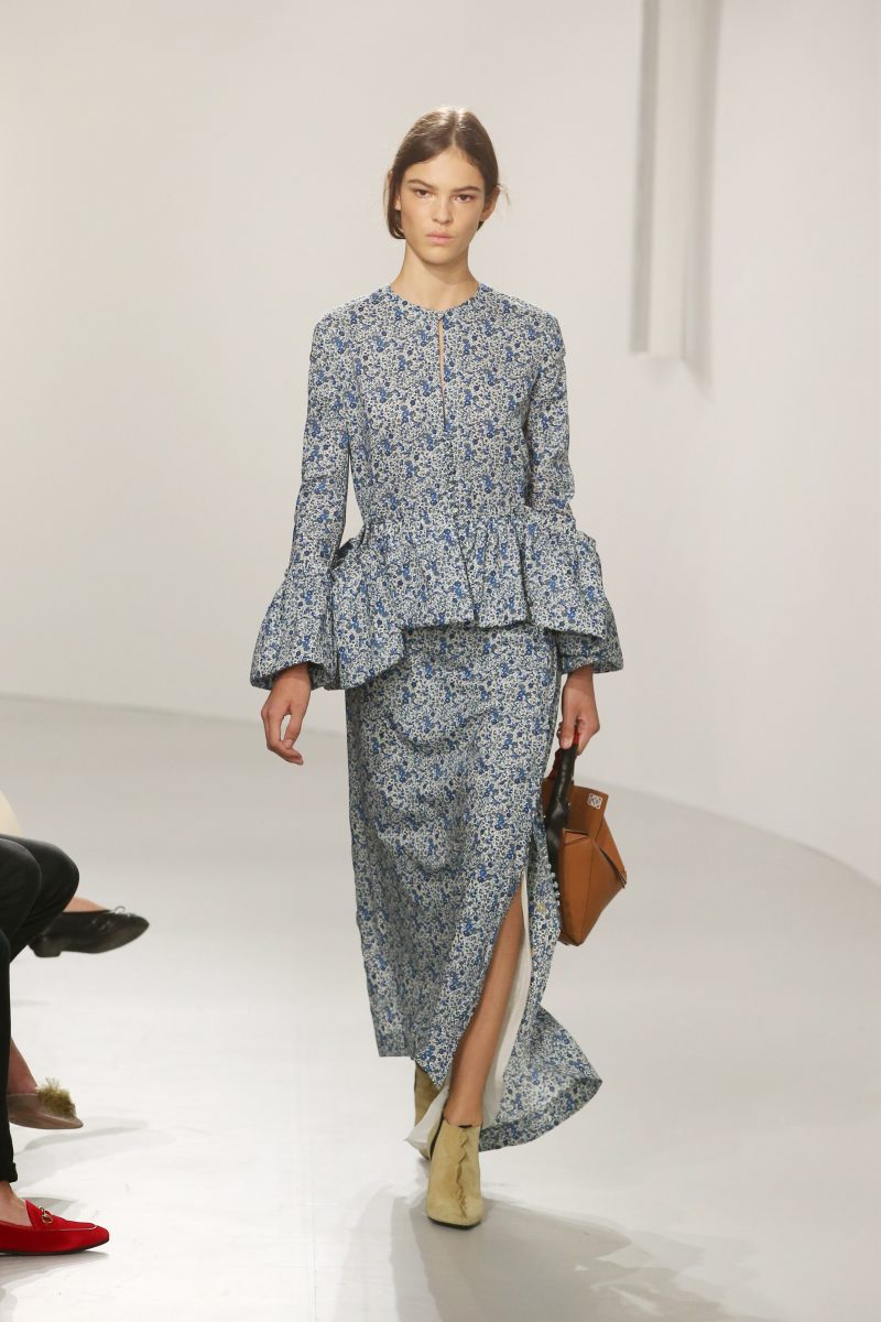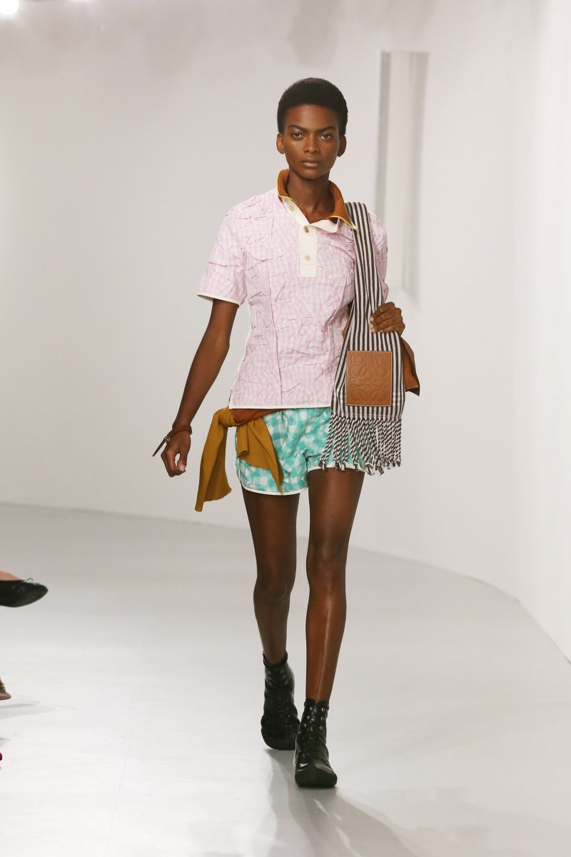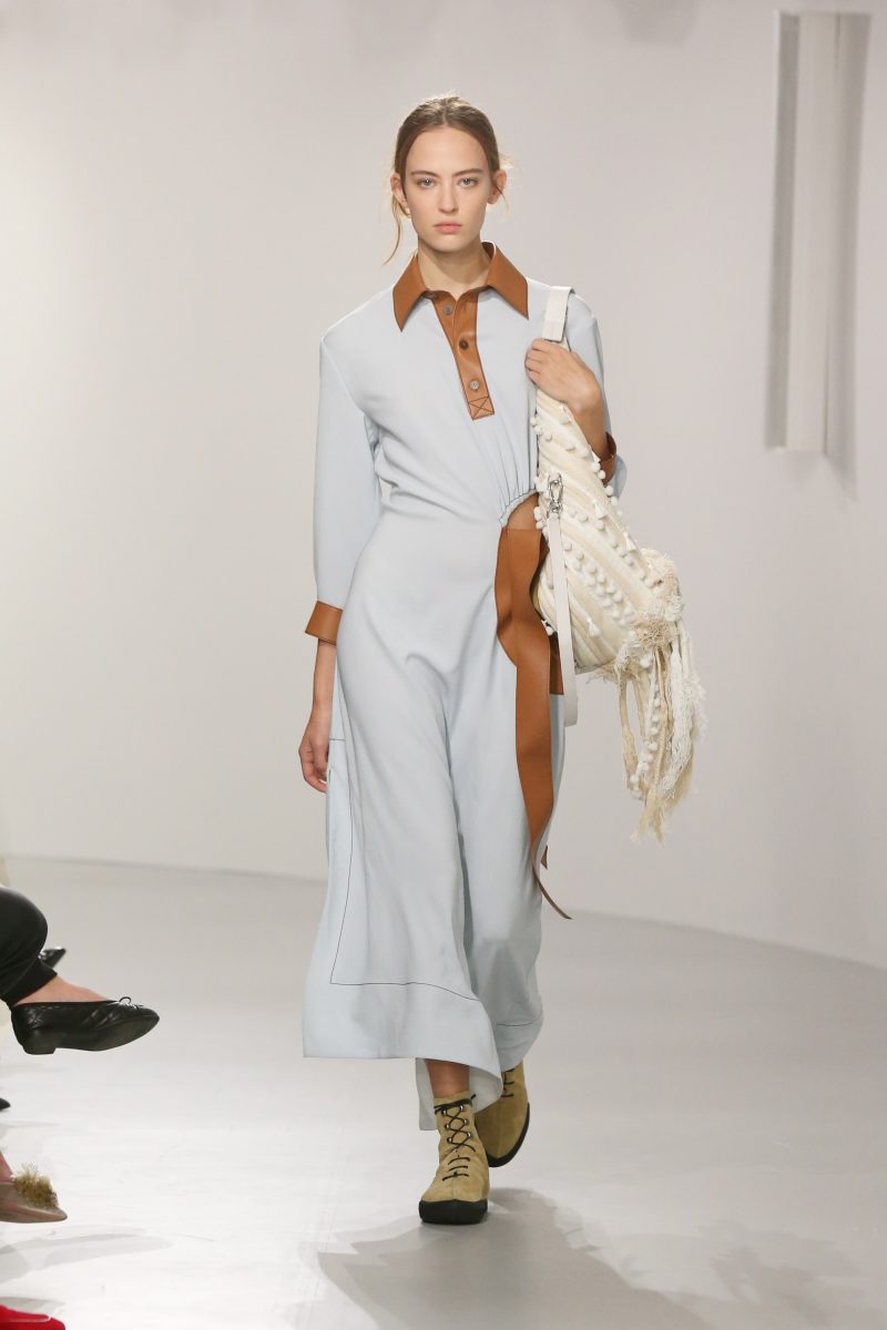 Another designer focusing on craft and folk art this season was Jonathan Anderson for Loewe. Slim body clingers came laid with patchwork quilting—traditionally in a multitude of fabrics and also in various shade of gingham. Prairie patterns came as a peplum tops paired with slit pencil skirts. Models wearing pieces like a dress that looked as though it had been cut from a table cloth or rug (fringe and all) came with a bag slung behind the shoulder like a boho hobo. T-shirts and sweatshirts with Loewe insignia came with fringed fabric and a wrap waisted blue blazer with gingham detailing paired with wide leg cropped grey pants and a sunhat were reminiscent of a modern day Huckleberry Finn. It was cross-continental cool country chic.