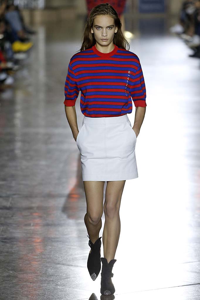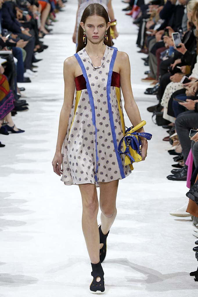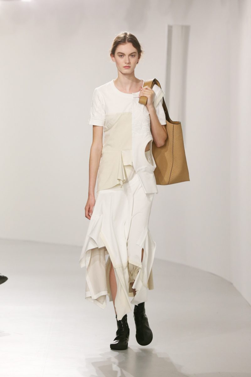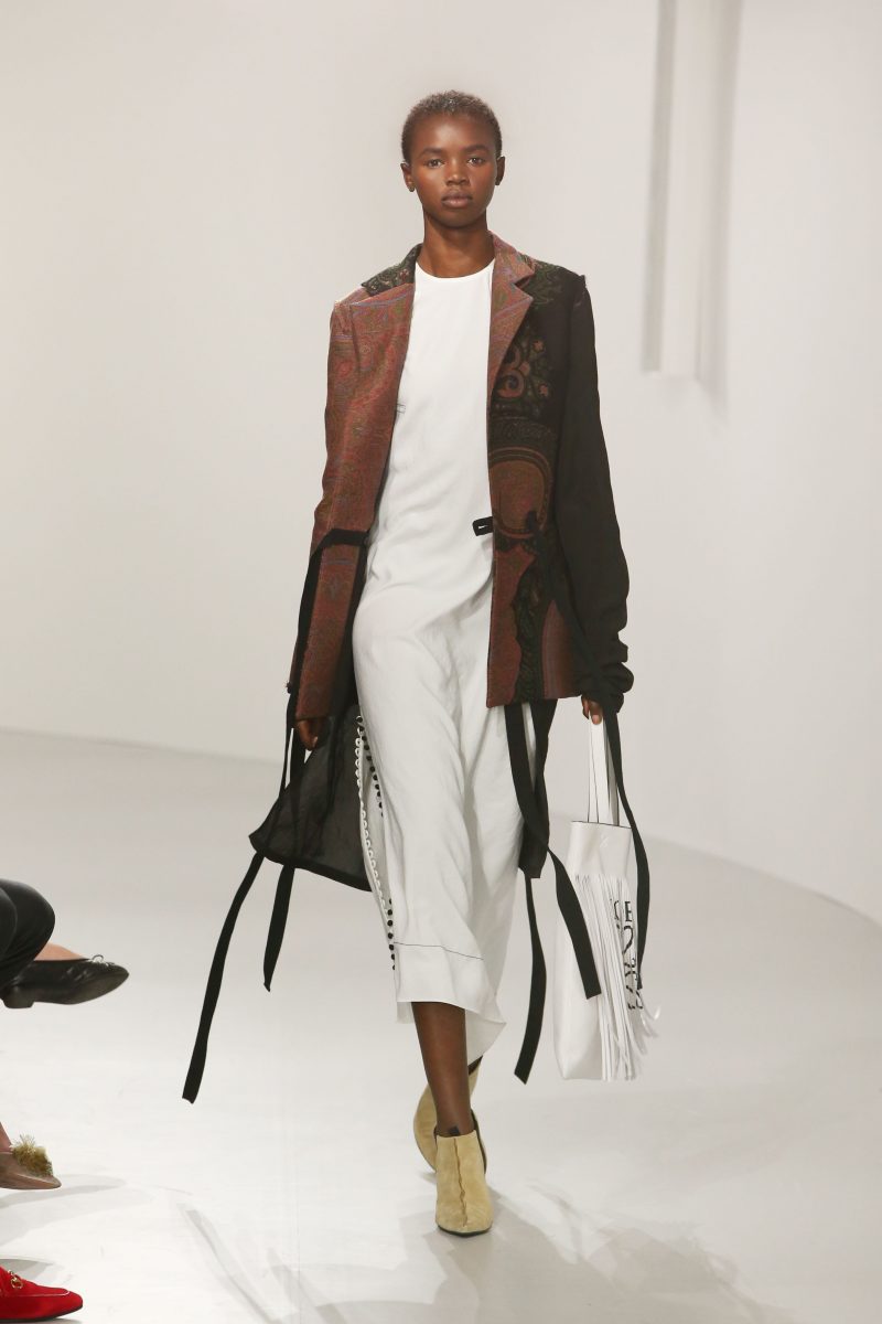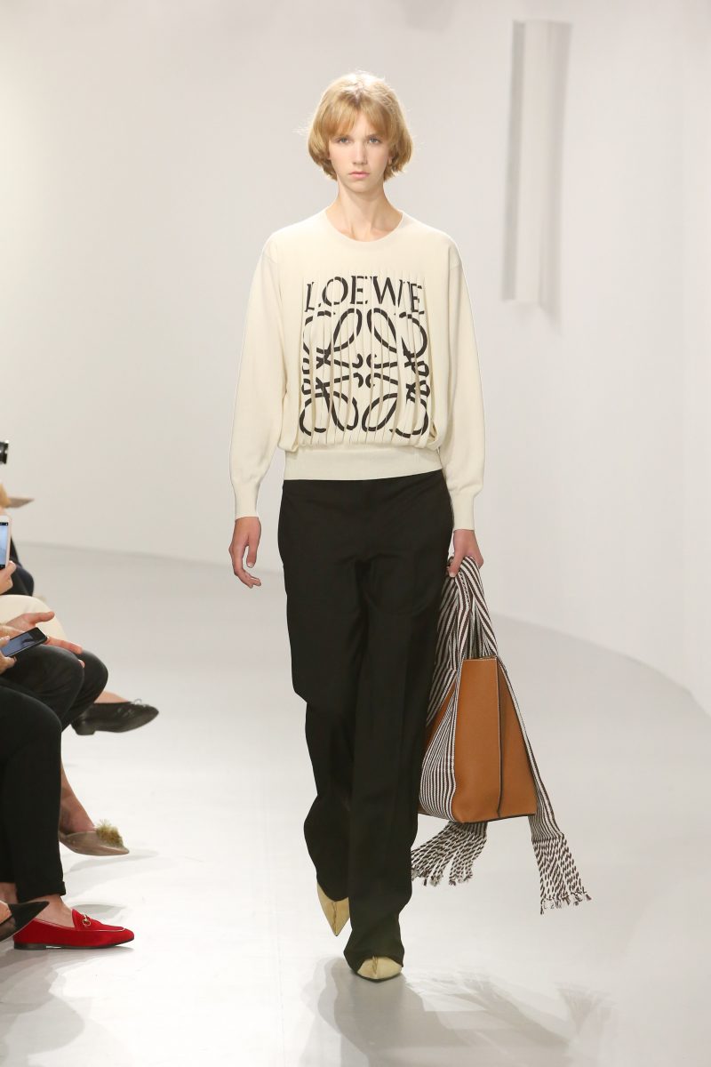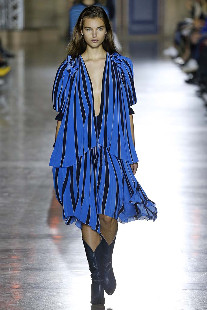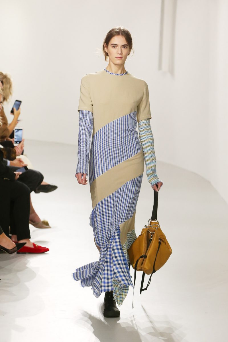 Another designer focusing on craft and folk art this season was Jonathan Anderson for Loewe. Slim body clingers came laid with patchwork quilting—traditionally in a multitude of fabrics and also in various shade of gingham. Prairie patterns came as a peplum tops paired with slit pencil skirts. Models wearing pieces like a dress that looked as though it had been cut from a table cloth or rug (fringe and all) came with a bag slung behind the shoulder like a boho hobo. T-shirts and sweatshirts with Loewe insignia came with fringed fabric and a wrap waisted blue blazer with gingham detailing paired with wide leg cropped grey pants and a sunhat were reminiscent of a modern day Huckleberry Finn. It was cross-continental cool country chic.