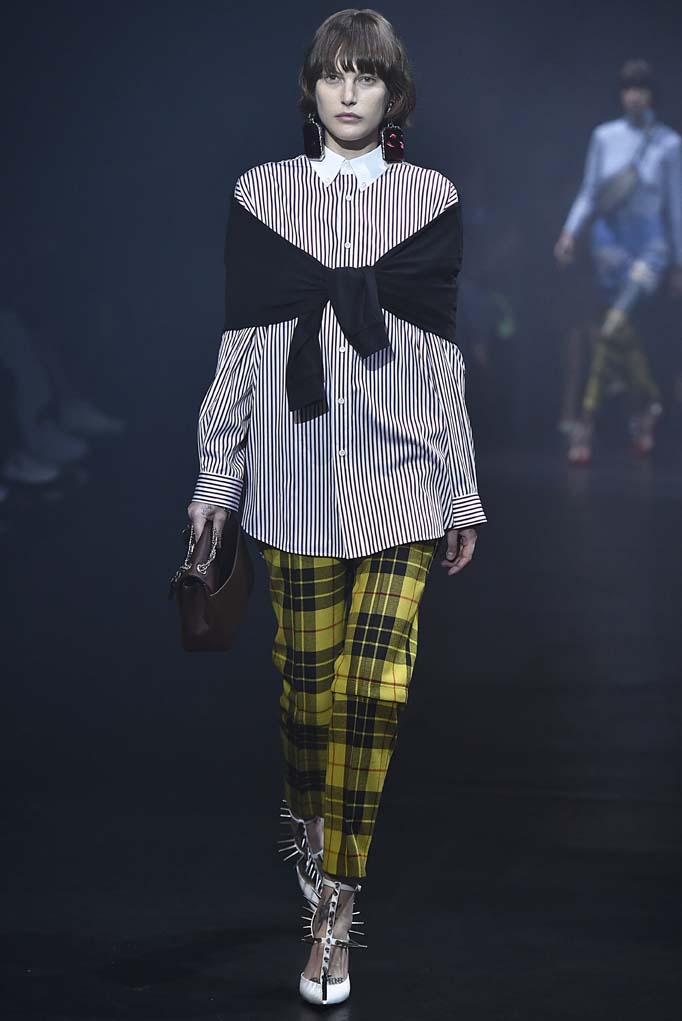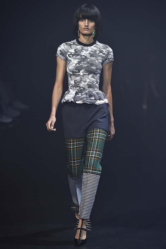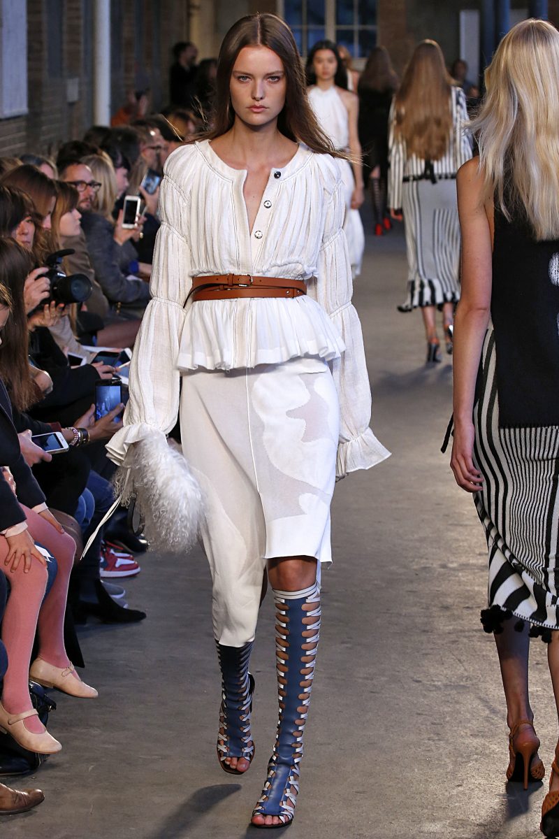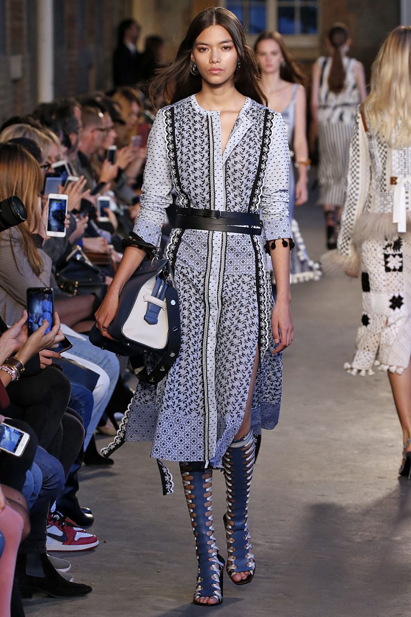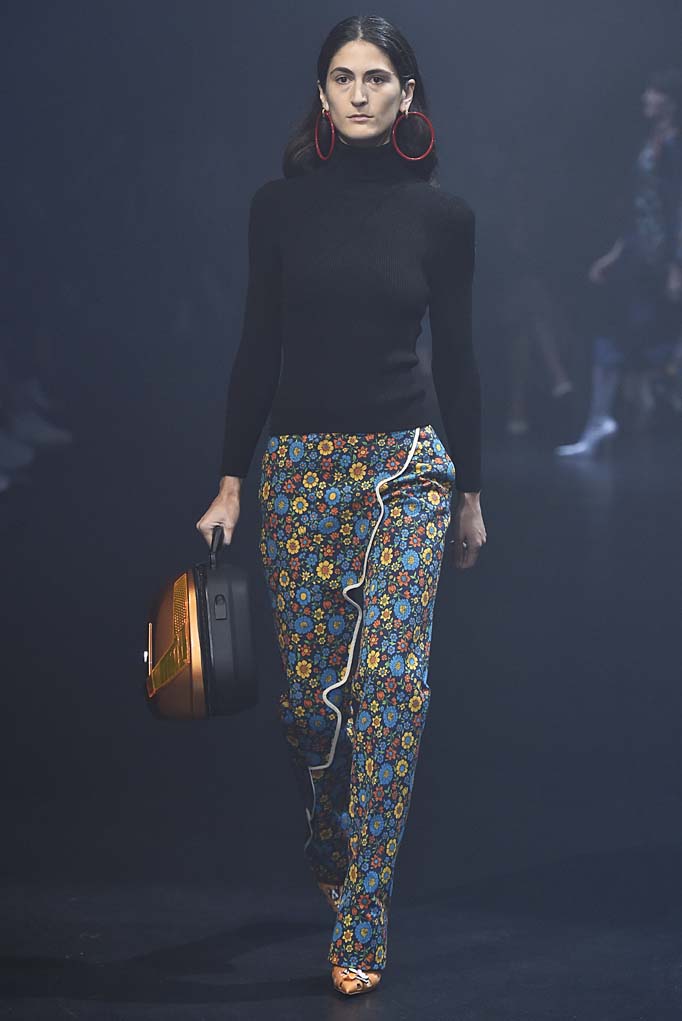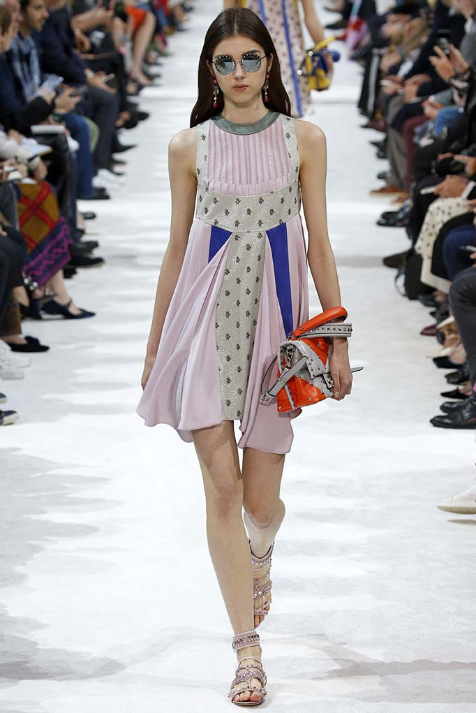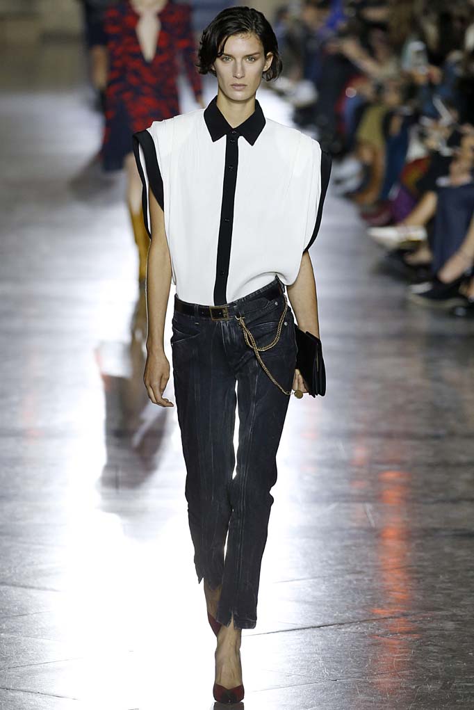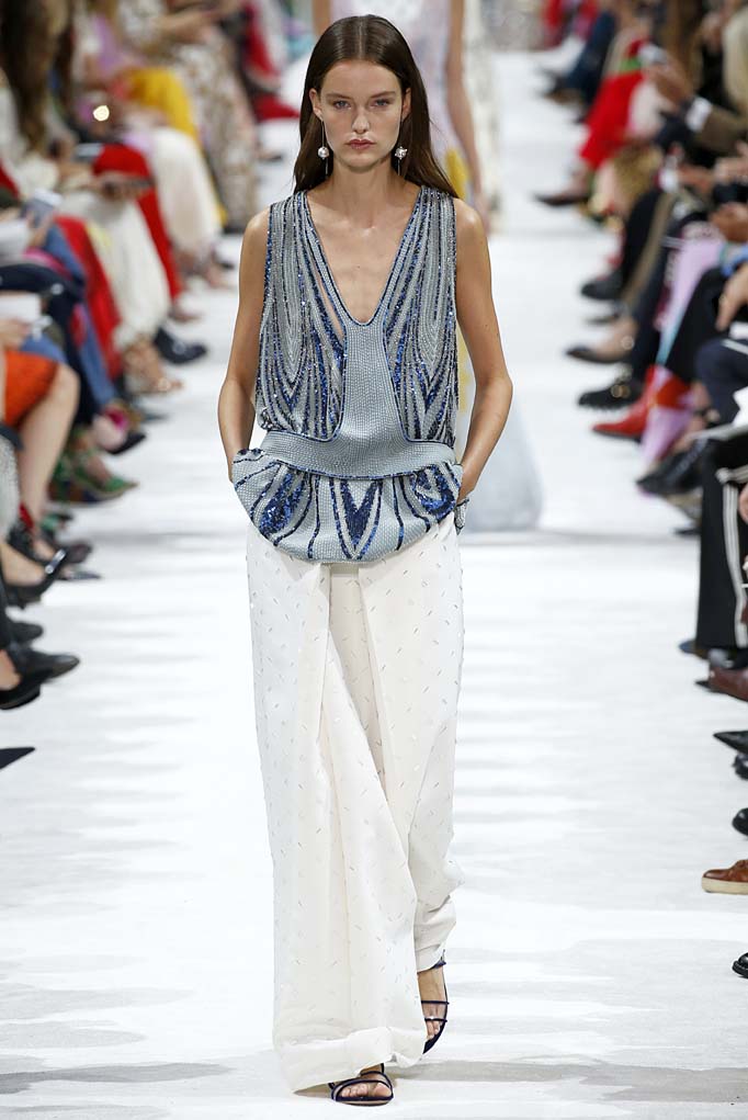 Another designer focusing on craft and folk art this season was Jonathan Anderson for Loewe. Slim body clingers came laid with patchwork quilting—traditionally in a multitude of fabrics and also in various shade of gingham. Prairie patterns came as a peplum tops paired with slit pencil skirts. Models wearing pieces like a dress that looked as though it had been cut from a table cloth or rug (fringe and all) came with a bag slung behind the shoulder like a boho hobo. T-shirts and sweatshirts with Loewe insignia came with fringed fabric and a wrap waisted blue blazer with gingham detailing paired with wide leg cropped grey pants and a sunhat were reminiscent of a modern day Huckleberry Finn. It was cross-continental cool country chic.