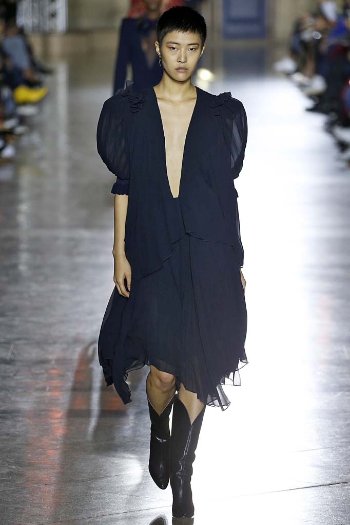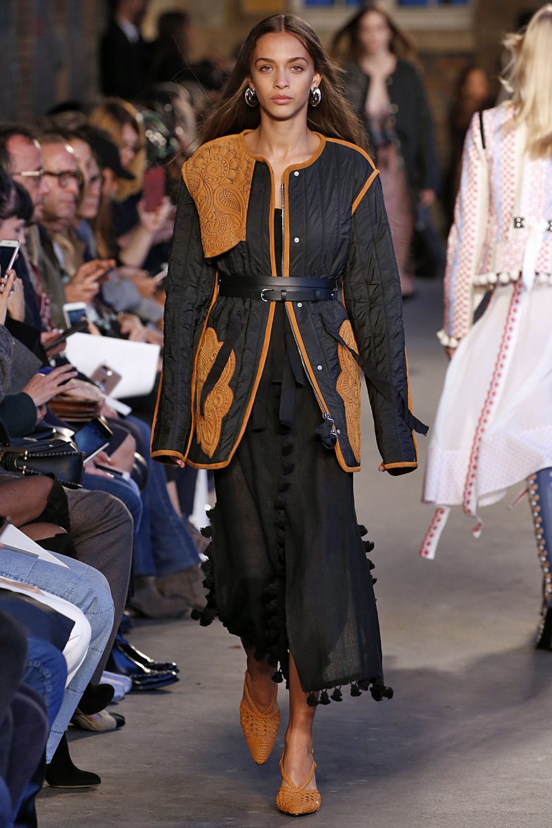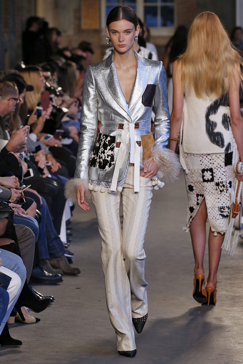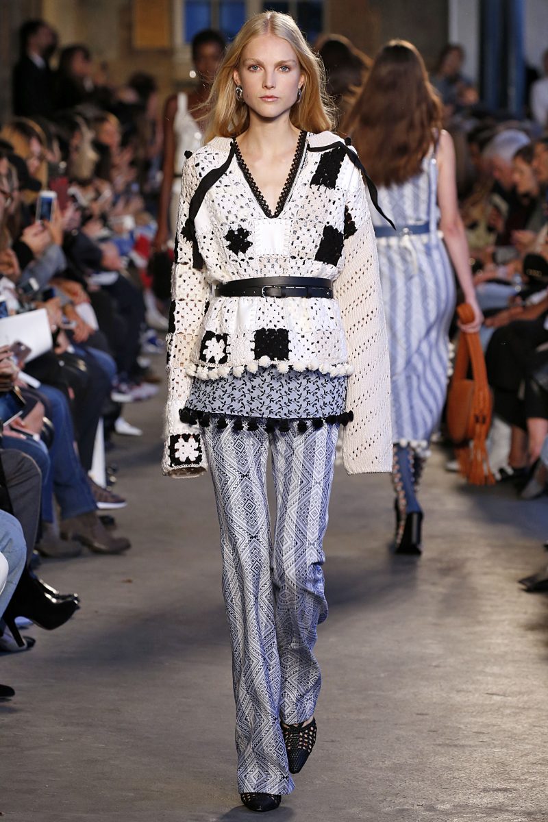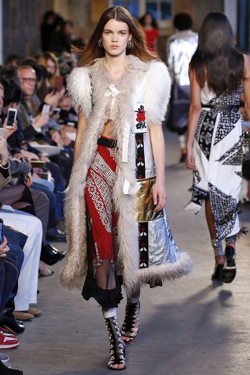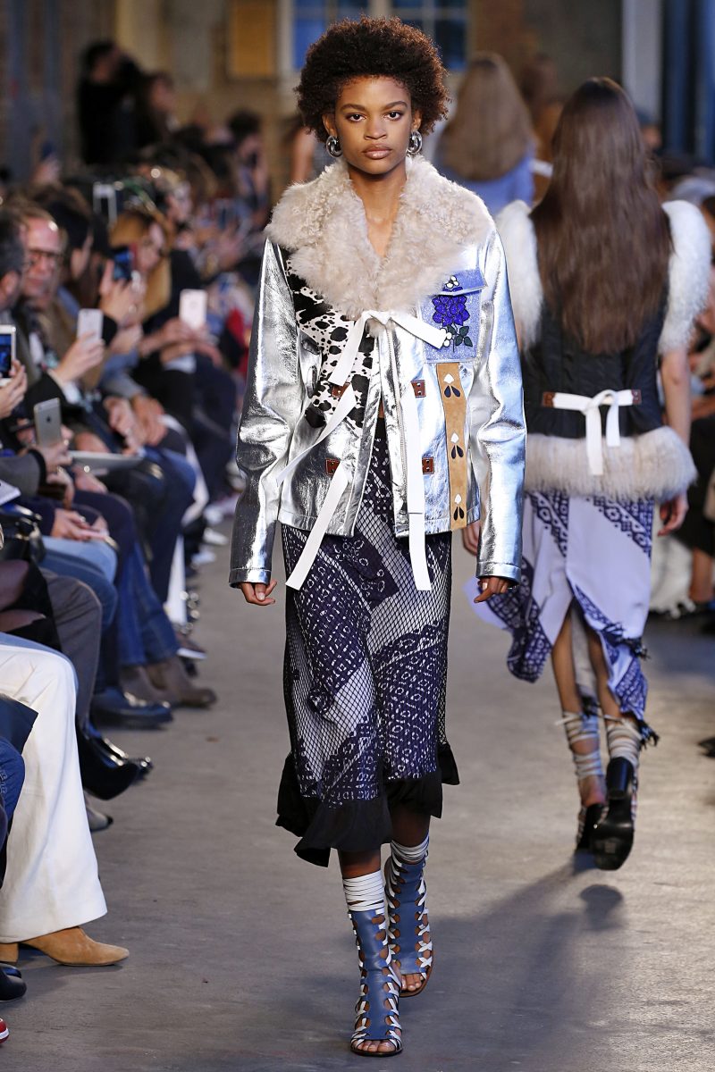 Joseph Altuzarra returned to his native Paris to show a collection inspired by Hayao Miyazaki’s Princess Mononoke, a 1997 Japanese anime film on nature versus industry. The theme is apropos of the times. Climate change has been one of the most debated topics in the last decade and the fashion industry is notoriously guilty of harming the environment. On top of those themes, there’s industry expectations on a designer versus resources and time. “At its core, this collection is about loss of innocence, growing up, and embracing fearlessness,” said Altuzarra in his show notes. He also cited pagan rituals documented by Charles Freger in his “Wilder Man” series. What ensued was an exploration on home knitting and sewing, handmade details, and the imperfect and undone. Similar themes were touched upon in Sarah Burton’s Pagan-inspired collection for Alexander McQueen’s Fall/Winter 2017 collection. There was patchwork on fur accented vests, kerchief style dresses, doily style netting on clingy sheer dresses and skirts, and beaded bodices said to be inspired by table runners at his grandmother’s French countryside home, according to VogueRunway. And while homemade, country, and grandma don’t normally sound like a mix of words that create a very sexy recipe, in Altuzarra’s hands it was sizzling.