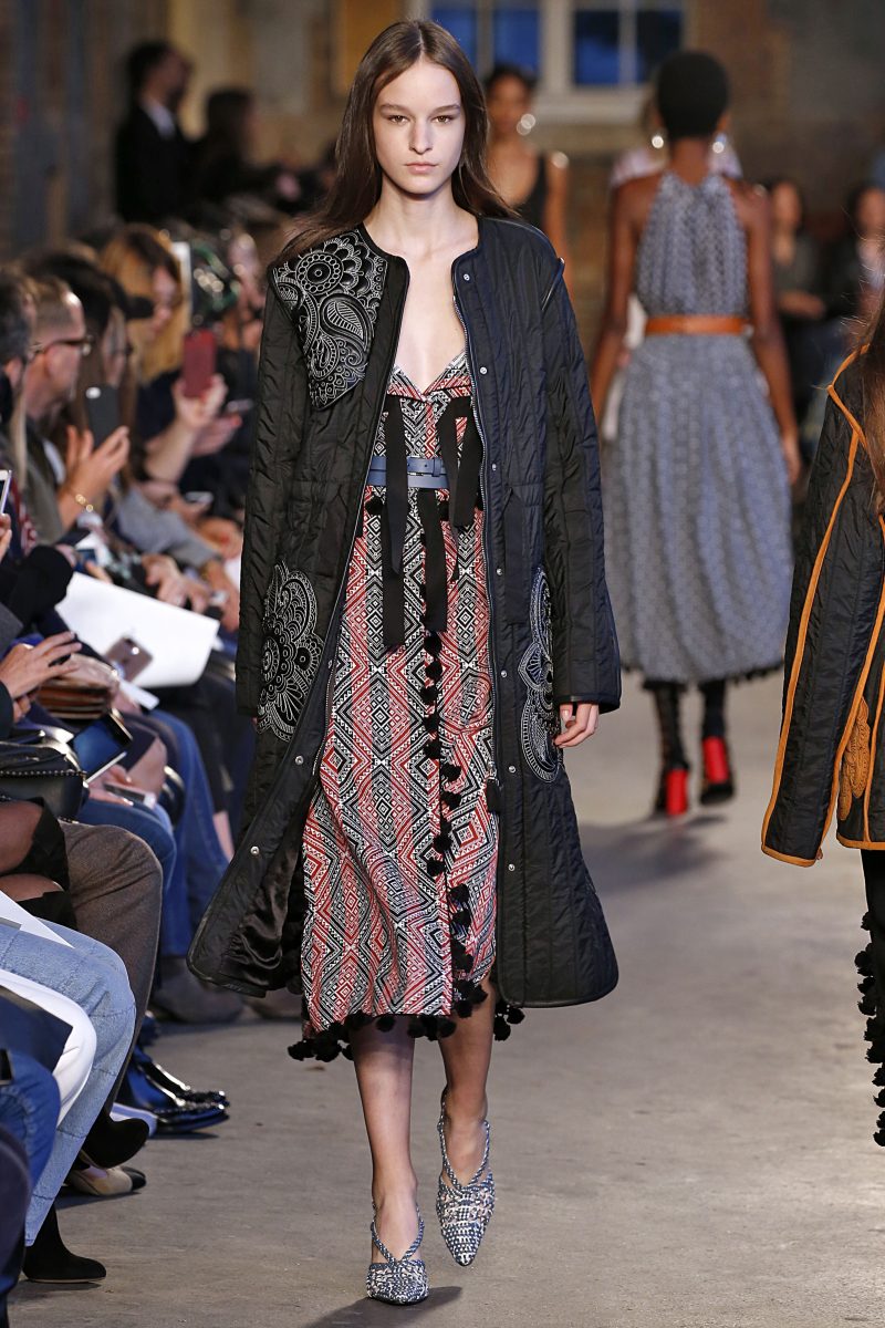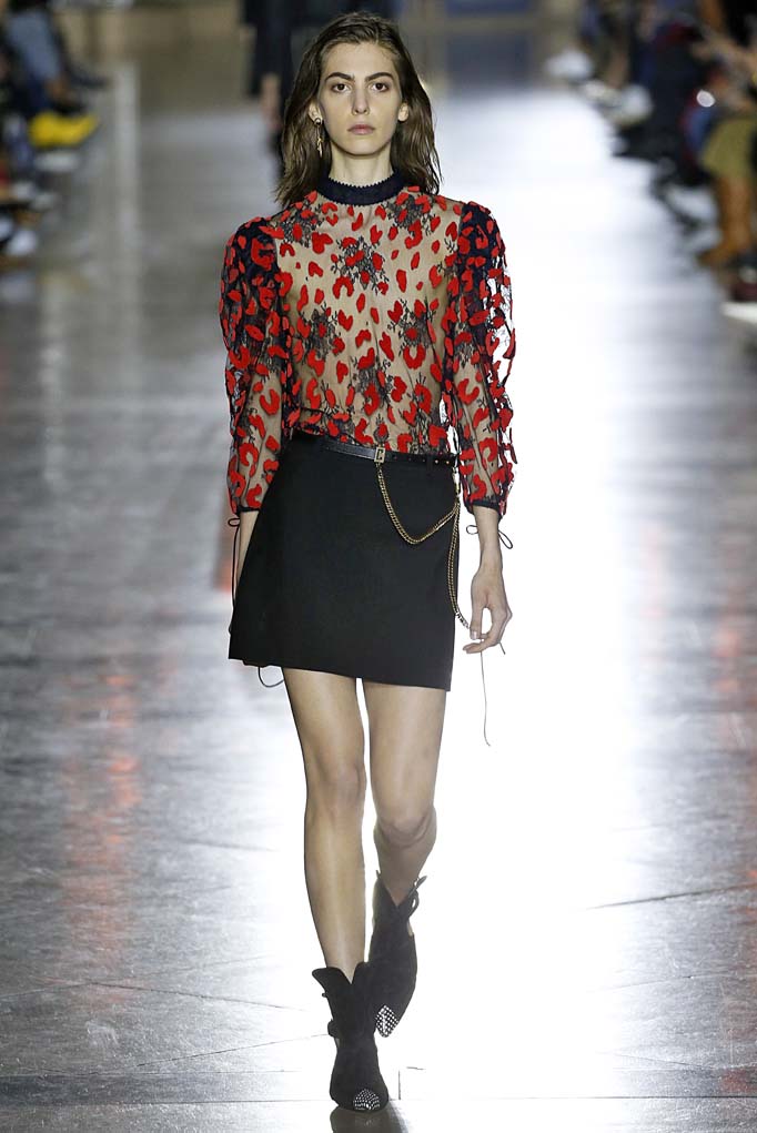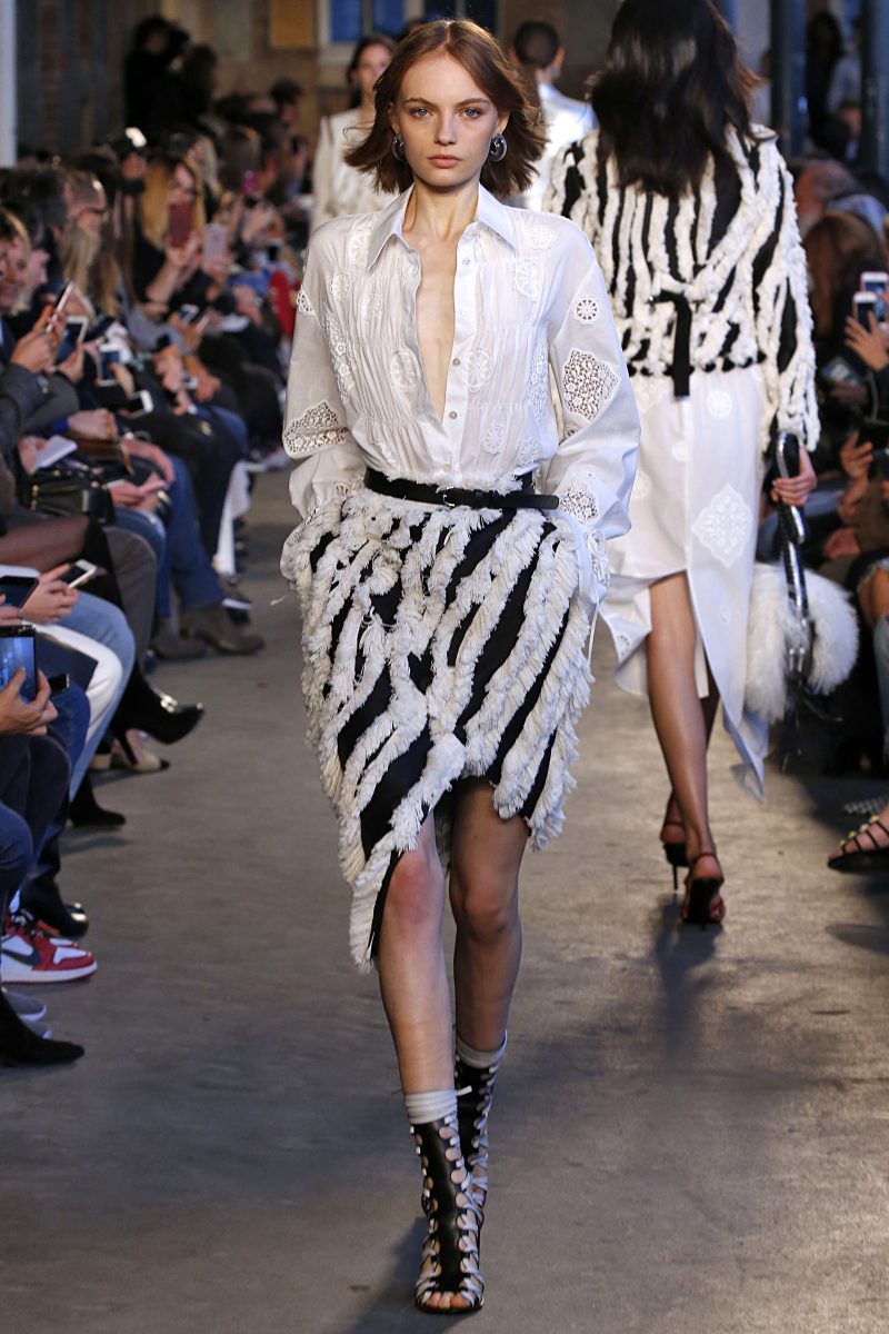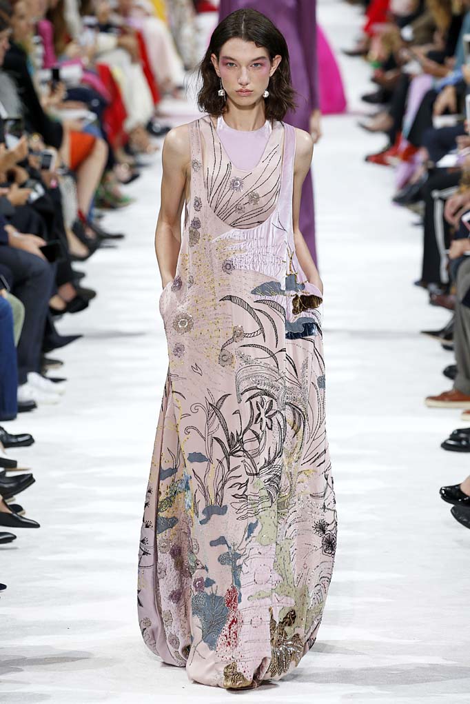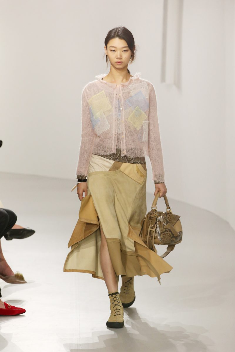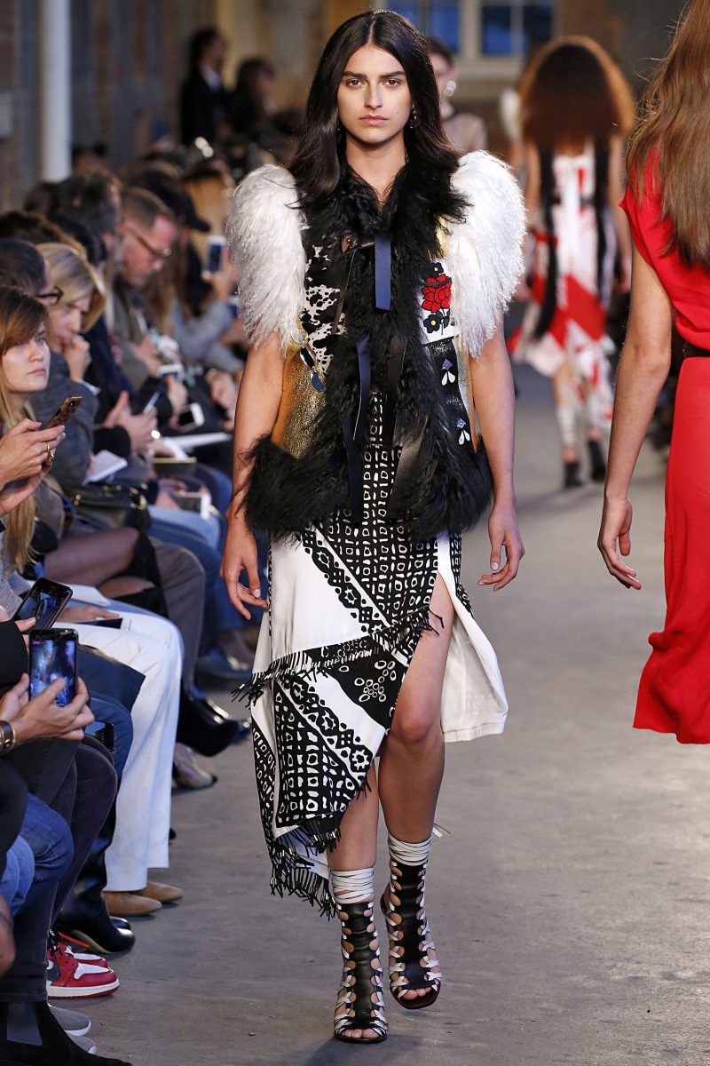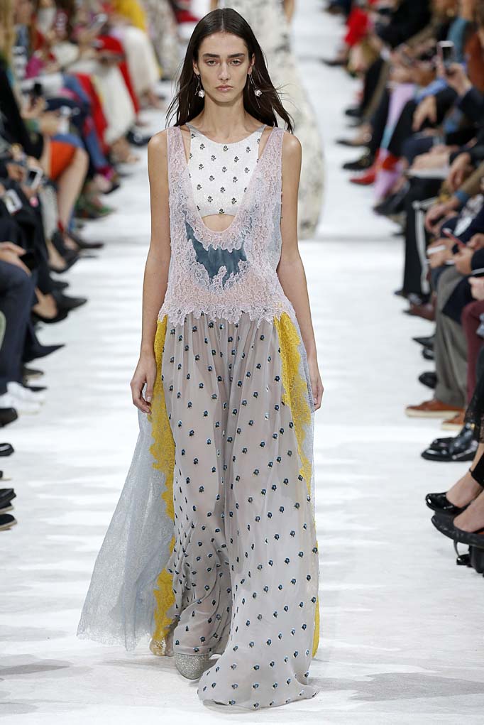 Joseph Altuzarra returned to his native Paris to show a collection inspired by Hayao Miyazaki’s Princess Mononoke, a 1997 Japanese anime film on nature versus industry. The theme is apropos of the times. Climate change has been one of the most debated topics in the last decade and the fashion industry is notoriously guilty of harming the environment. On top of those themes, there’s industry expectations on a designer versus resources and time. “At its core, this collection is about loss of innocence, growing up, and embracing fearlessness,” said Altuzarra in his show notes. He also cited pagan rituals documented by Charles Freger in his “Wilder Man” series. What ensued was an exploration on home knitting and sewing, handmade details, and the imperfect and undone. Similar themes were touched upon in Sarah Burton’s Pagan-inspired collection for Alexander McQueen’s Fall/Winter 2017 collection. There was patchwork on fur accented vests, kerchief style dresses, doily style netting on clingy sheer dresses and skirts, and beaded bodices said to be inspired by table runners at his grandmother’s French countryside home, according to VogueRunway. And while homemade, country, and grandma don’t normally sound like a mix of words that create a very sexy recipe, in Altuzarra’s hands it was sizzling.