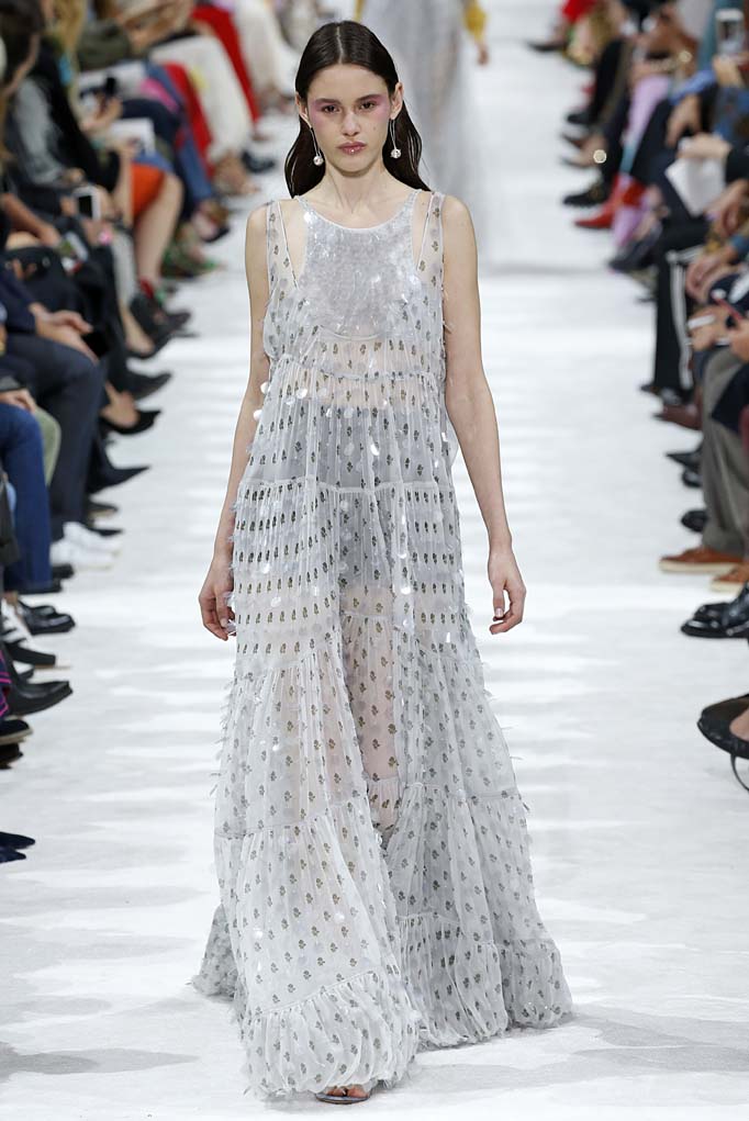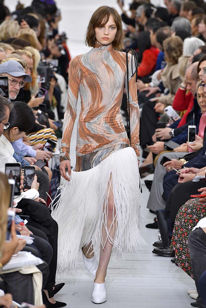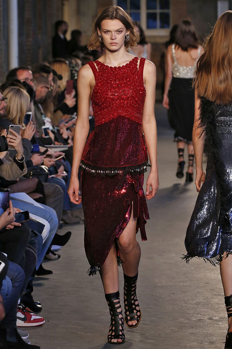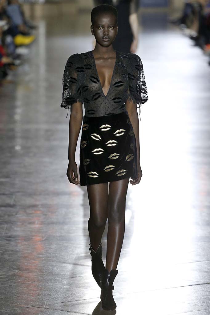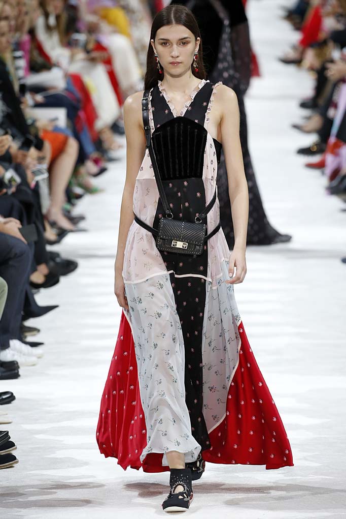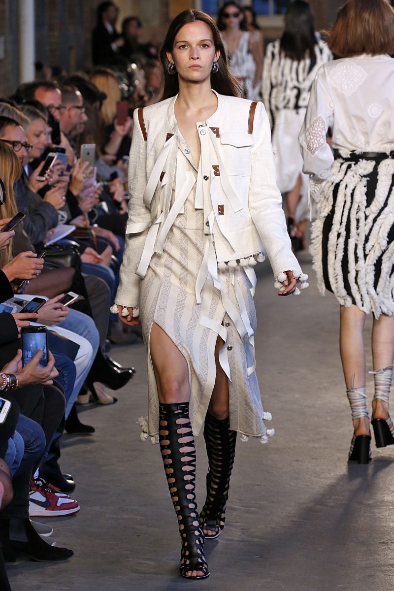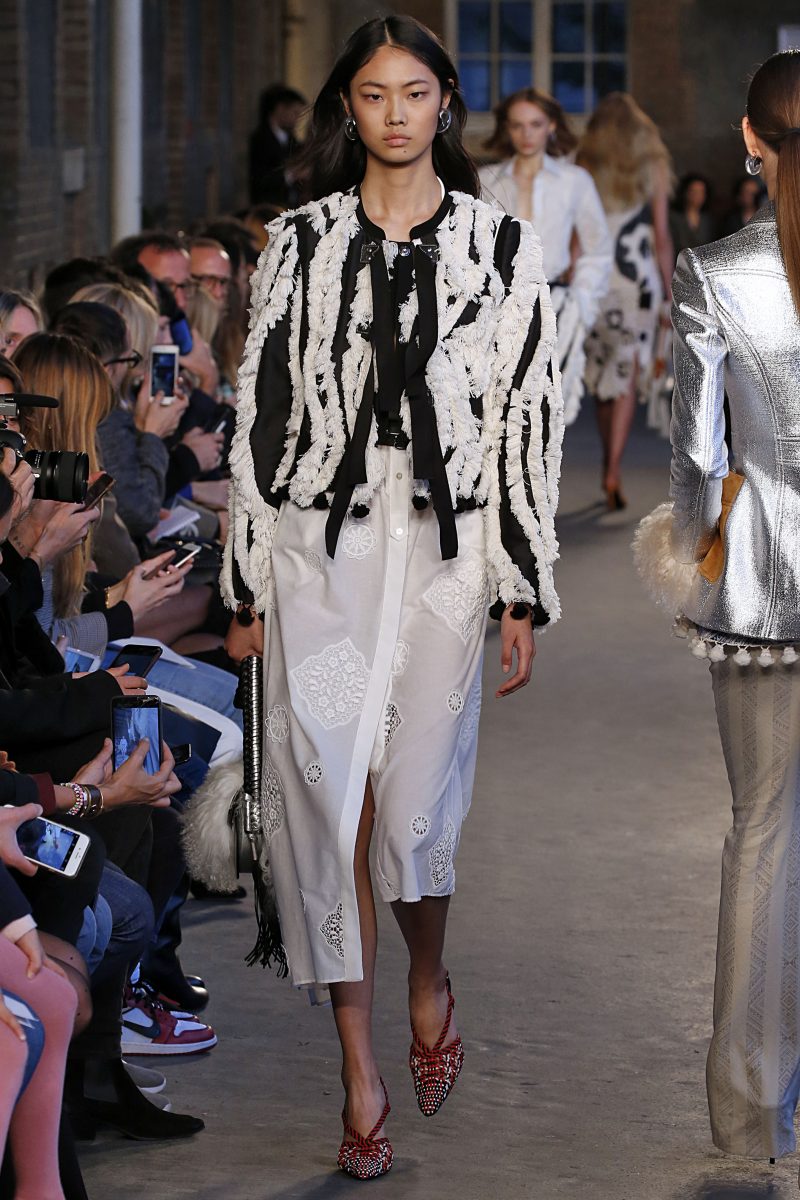 Joseph Altuzarra returned to his native Paris to show a collection inspired by Hayao Miyazaki’s Princess Mononoke, a 1997 Japanese anime film on nature versus industry. The theme is apropos of the times. Climate change has been one of the most debated topics in the last decade and the fashion industry is notoriously guilty of harming the environment. On top of those themes, there’s industry expectations on a designer versus resources and time. “At its core, this collection is about loss of innocence, growing up, and embracing fearlessness,” said Altuzarra in his show notes. He also cited pagan rituals documented by Charles Freger in his “Wilder Man” series. What ensued was an exploration on home knitting and sewing, handmade details, and the imperfect and undone. Similar themes were touched upon in Sarah Burton’s Pagan-inspired collection for Alexander McQueen’s Fall/Winter 2017 collection. There was patchwork on fur accented vests, kerchief style dresses, doily style netting on clingy sheer dresses and skirts, and beaded bodices said to be inspired by table runners at his grandmother’s French countryside home, according to VogueRunway. And while homemade, country, and grandma don’t normally sound like a mix of words that create a very sexy recipe, in Altuzarra’s hands it was sizzling.