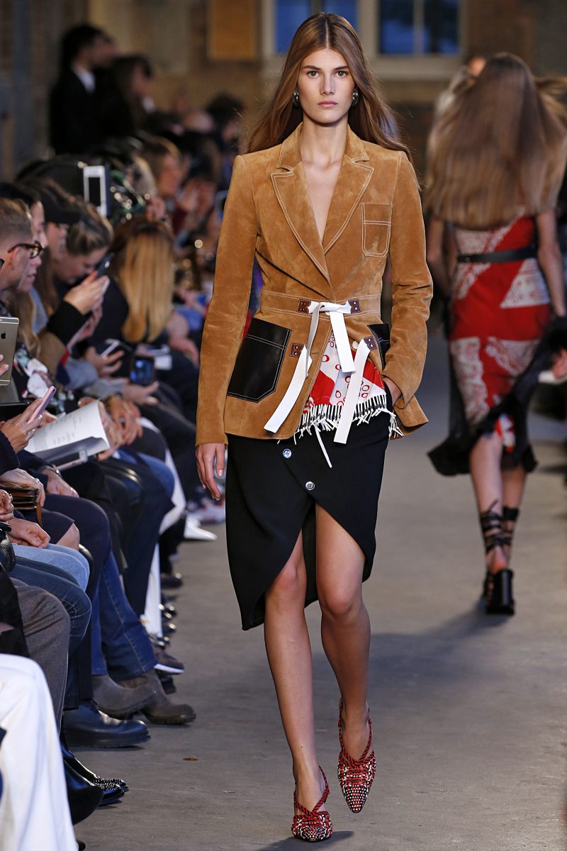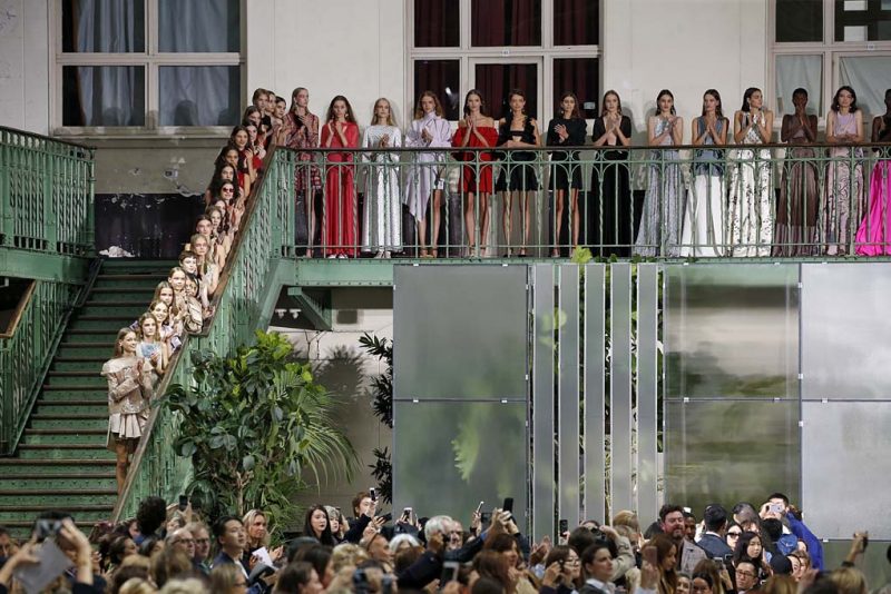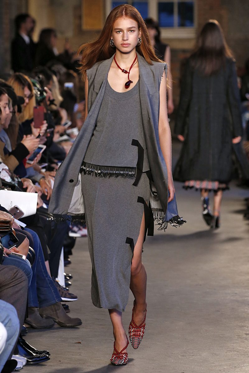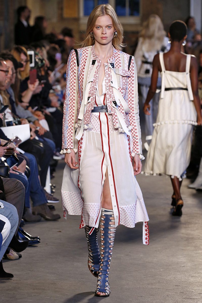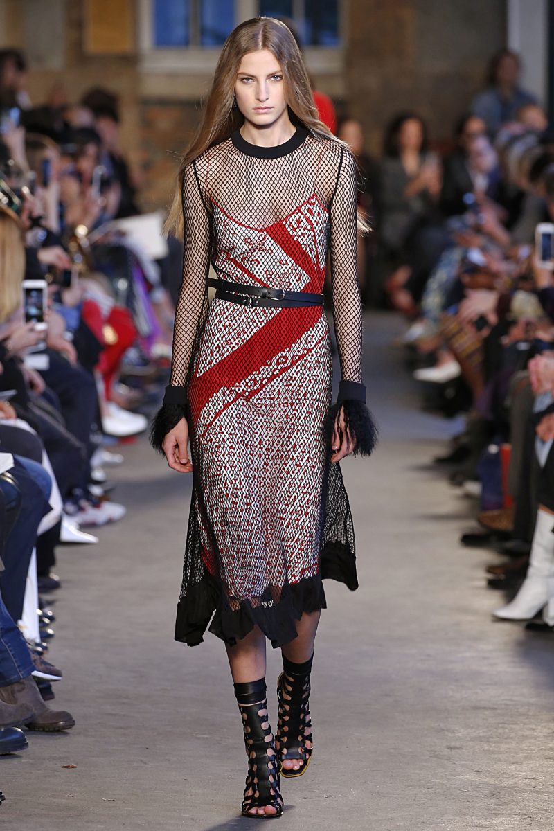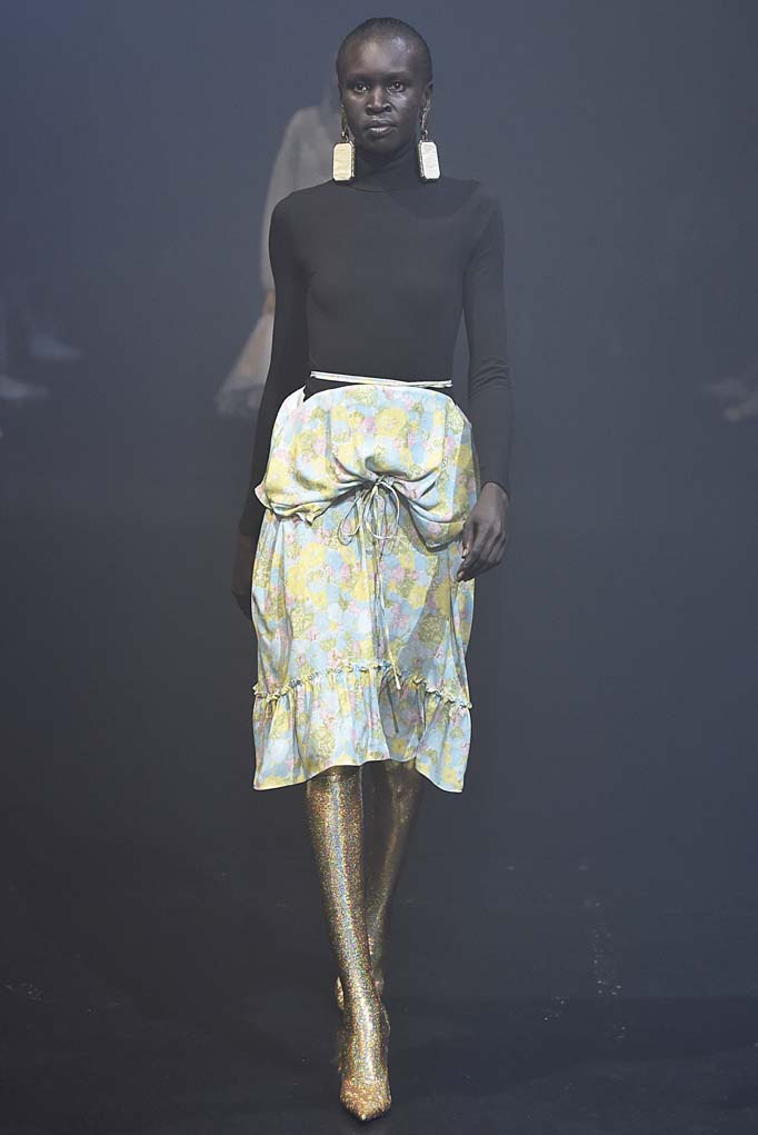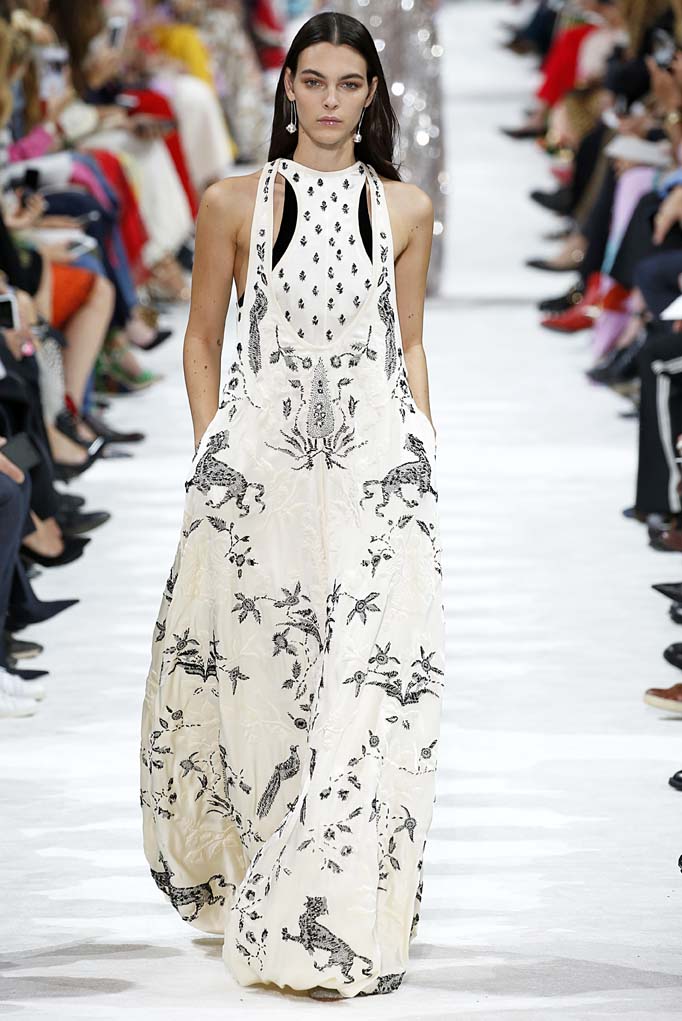 Joseph Altuzarra returned to his native Paris to show a collection inspired by Hayao Miyazaki’s Princess Mononoke, a 1997 Japanese anime film on nature versus industry. The theme is apropos of the times. Climate change has been one of the most debated topics in the last decade and the fashion industry is notoriously guilty of harming the environment. On top of those themes, there’s industry expectations on a designer versus resources and time. “At its core, this collection is about loss of innocence, growing up, and embracing fearlessness,” said Altuzarra in his show notes. He also cited pagan rituals documented by Charles Freger in his “Wilder Man” series. What ensued was an exploration on home knitting and sewing, handmade details, and the imperfect and undone. Similar themes were touched upon in Sarah Burton’s Pagan-inspired collection for Alexander McQueen’s Fall/Winter 2017 collection. There was patchwork on fur accented vests, kerchief style dresses, doily style netting on clingy sheer dresses and skirts, and beaded bodices said to be inspired by table runners at his grandmother’s French countryside home, according to VogueRunway. And while homemade, country, and grandma don’t normally sound like a mix of words that create a very sexy recipe, in Altuzarra’s hands it was sizzling.