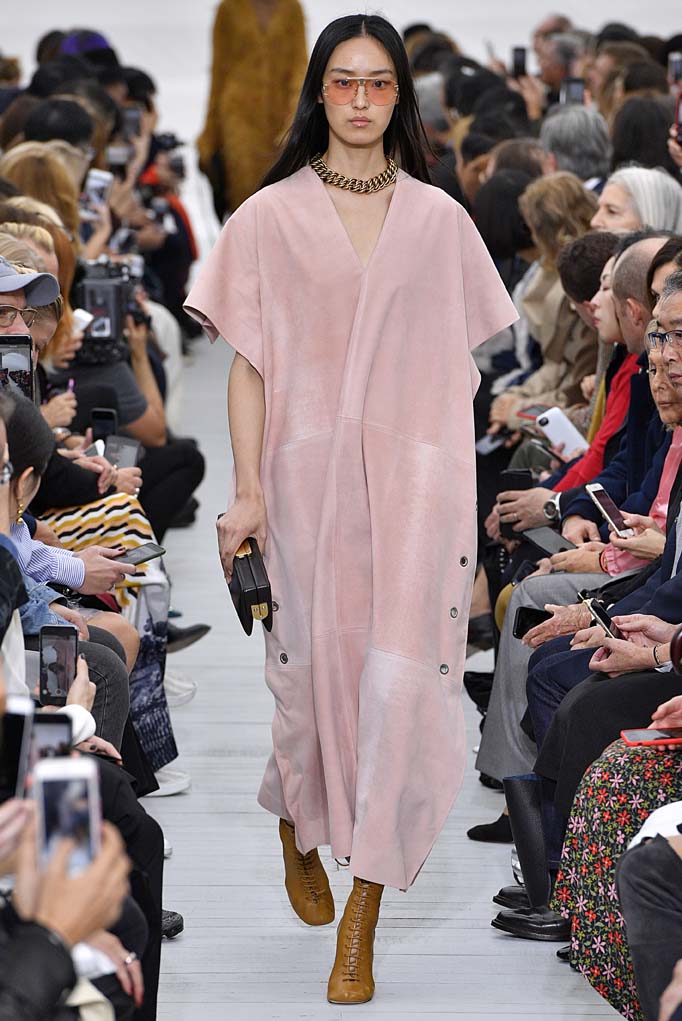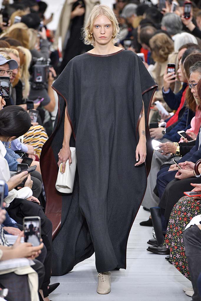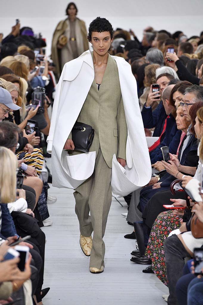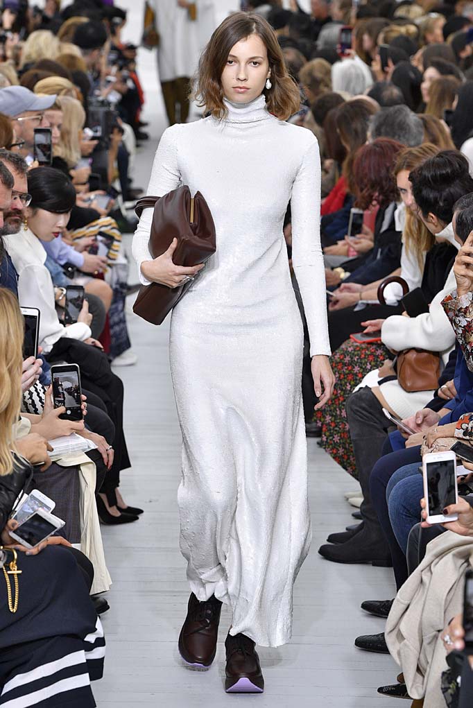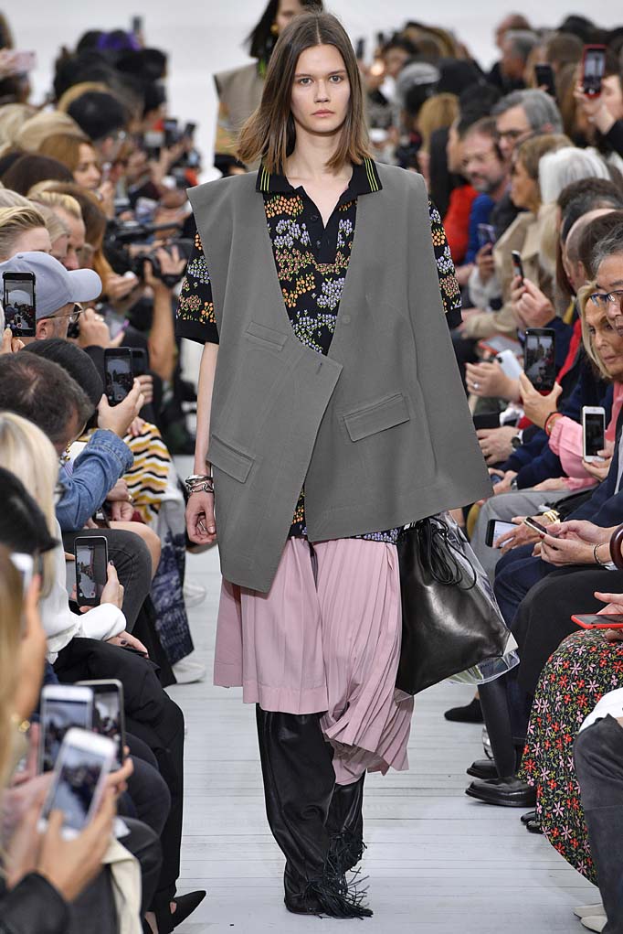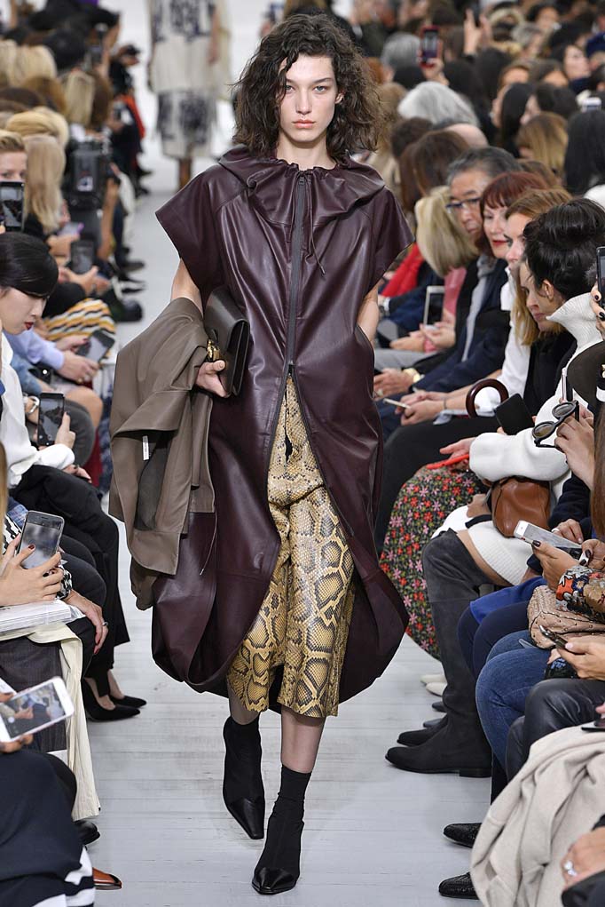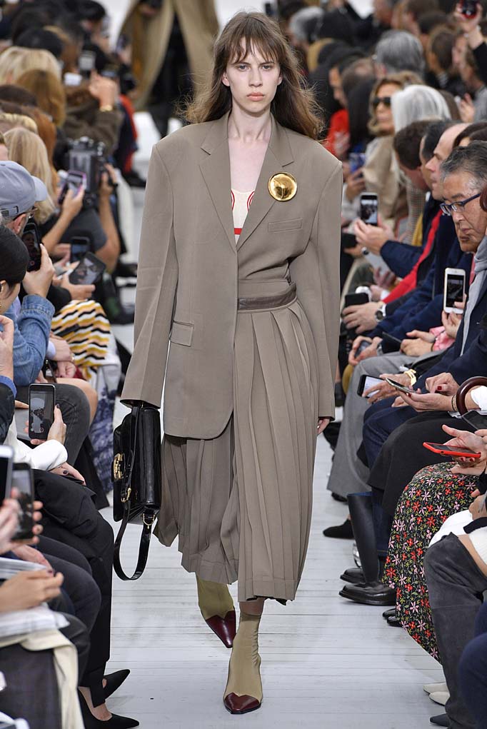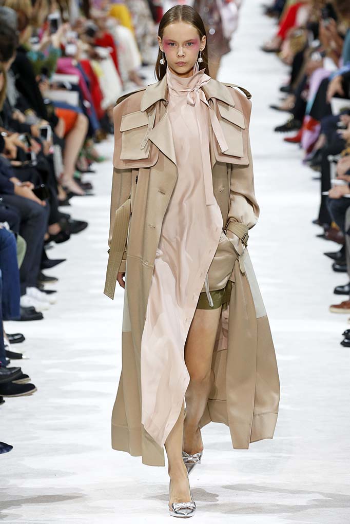 Phoebe Philo has a grand talent for packing in a lot of look into a seemingly effortless ensemble. Her woman gets plenty of design for pieces that won’t fade by next season. For Spring, it was an innovative meditation on tailoring and outerwear. Trenches came double layered in what looked like two coats, but were actually one piece sewn together and looped. In a season when you thought the trench couldn’t be rethought anymore, Philo has succeeded in whipping up one of the most thoughtful versions yet. Suits were also topped off with trenches, some of which connected only on one shoulder and just a portion of the hems. Other suit jackets melded into pleated skirts or came as oversized men’s versions cut off as vests. But for the Céline clientele that errs a bit more conservative there was a beautiful classic ivory version in leather worn on Anna Ewers. And a cut-out white bubble dress with lace details on Vittoria Ceretti will satisfy a more feminine mood. The whole collection highlighted high-impact, but understated fashion with ease. Take a sequined evening gown with an easy silhouette and rolled-up sleeves paired with khaki boots and a trench or an ultra luxe Kaftan-style pink suede dress that looked as easy to throw on as a robe. And Philo was certainly thinking of life as a woman in 2018 when she paired white and platform sneakers with lavender soles with a knit dress or a pair of leggings that looked every bit as sophisticated as the rest.