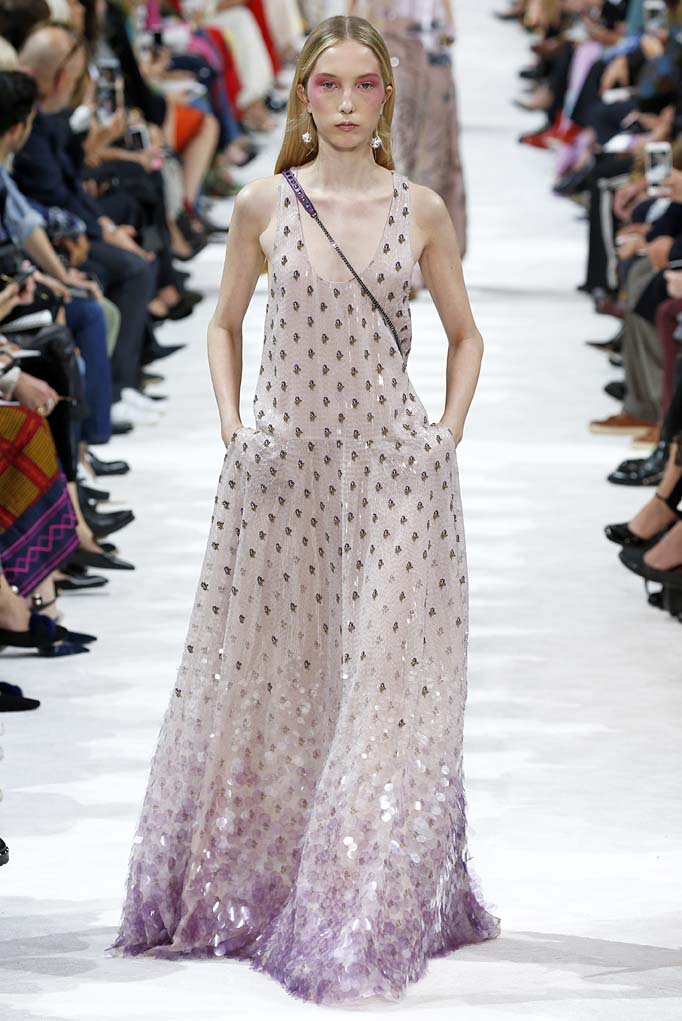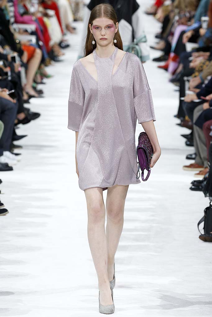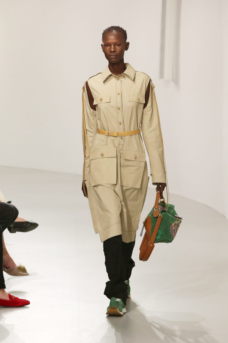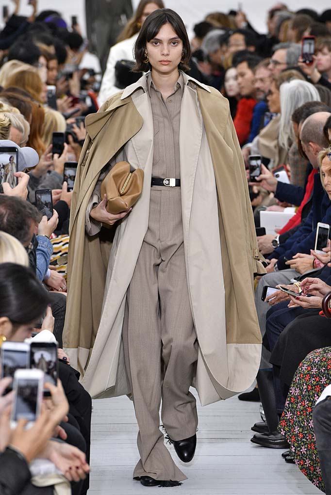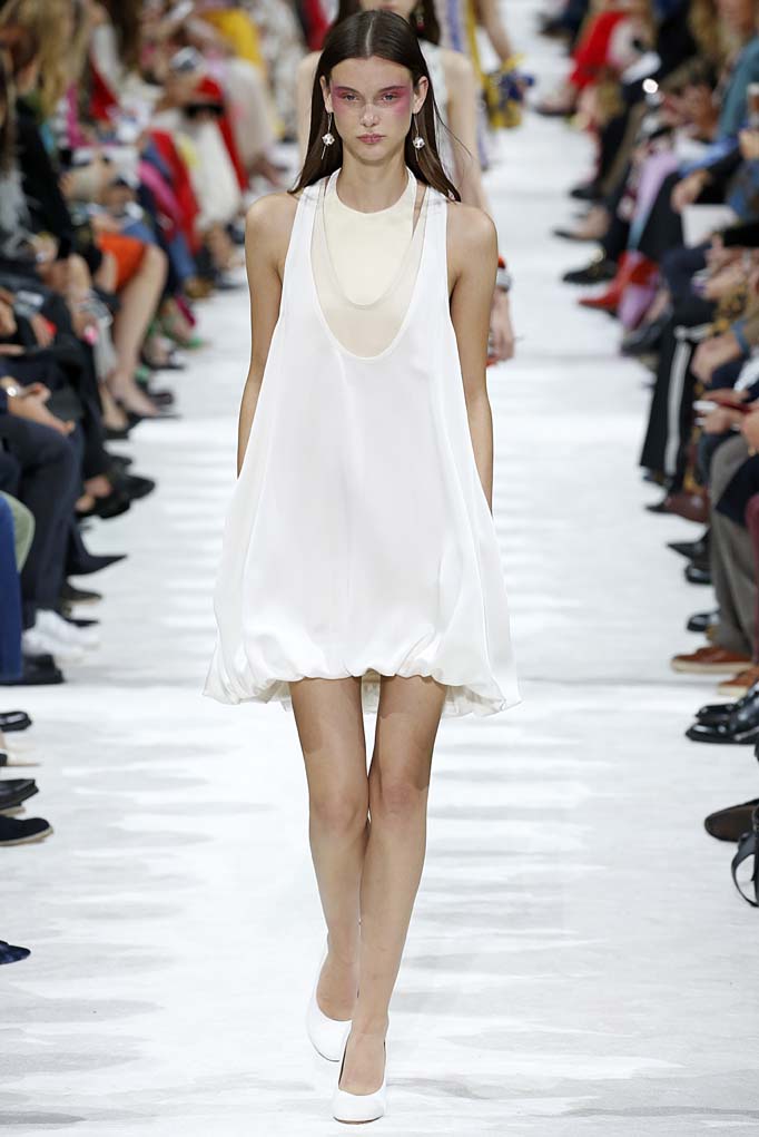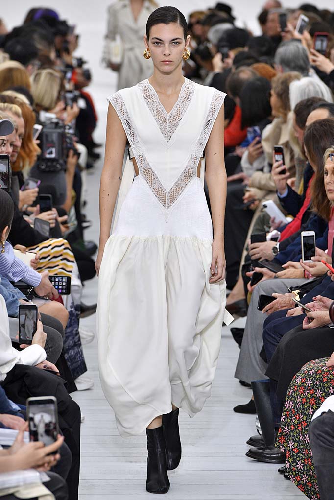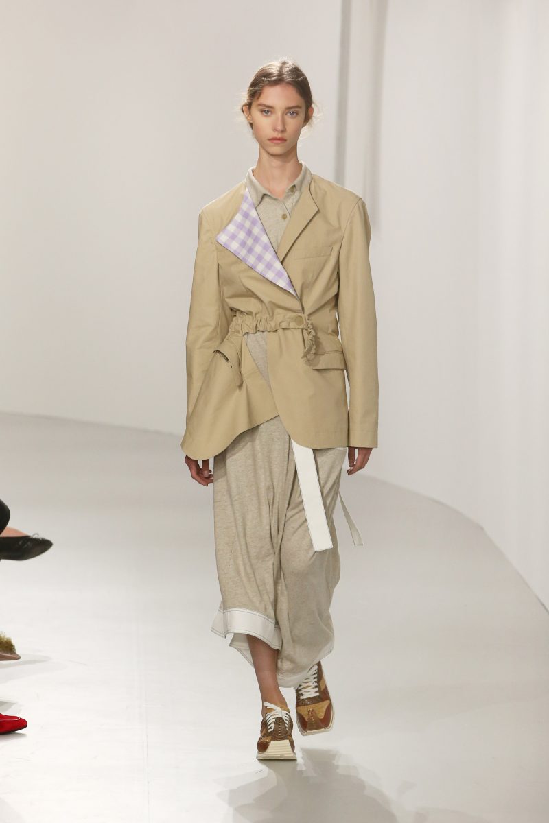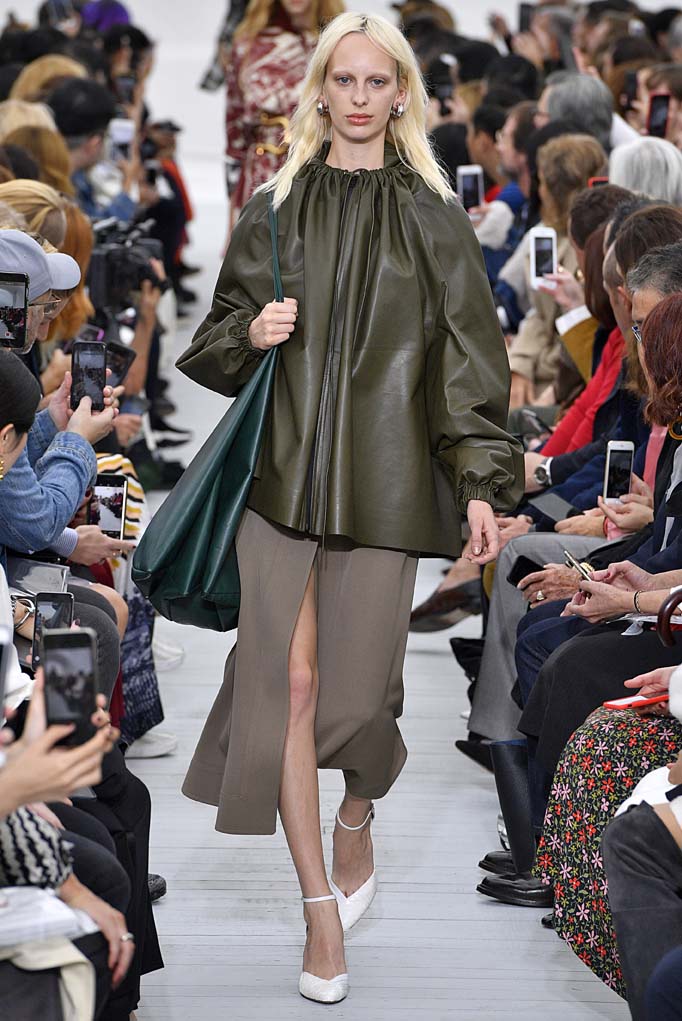 Phoebe Philo has a grand talent for packing in a lot of look into a seemingly effortless ensemble. Her woman gets plenty of design for pieces that won’t fade by next season. For Spring, it was an innovative meditation on tailoring and outerwear. Trenches came double layered in what looked like two coats, but were actually one piece sewn together and looped. In a season when you thought the trench couldn’t be rethought anymore, Philo has succeeded in whipping up one of the most thoughtful versions yet. Suits were also topped off with trenches, some of which connected only on one shoulder and just a portion of the hems. Other suit jackets melded into pleated skirts or came as oversized men’s versions cut off as vests. But for the Céline clientele that errs a bit more conservative there was a beautiful classic ivory version in leather worn on Anna Ewers. And a cut-out white bubble dress with lace details on Vittoria Ceretti will satisfy a more feminine mood. The whole collection highlighted high-impact, but understated fashion with ease. Take a sequined evening gown with an easy silhouette and rolled-up sleeves paired with khaki boots and a trench or an ultra luxe Kaftan-style pink suede dress that looked as easy to throw on as a robe. And Philo was certainly thinking of life as a woman in 2018 when she paired white and platform sneakers with lavender soles with a knit dress or a pair of leggings that looked every bit as sophisticated as the rest.