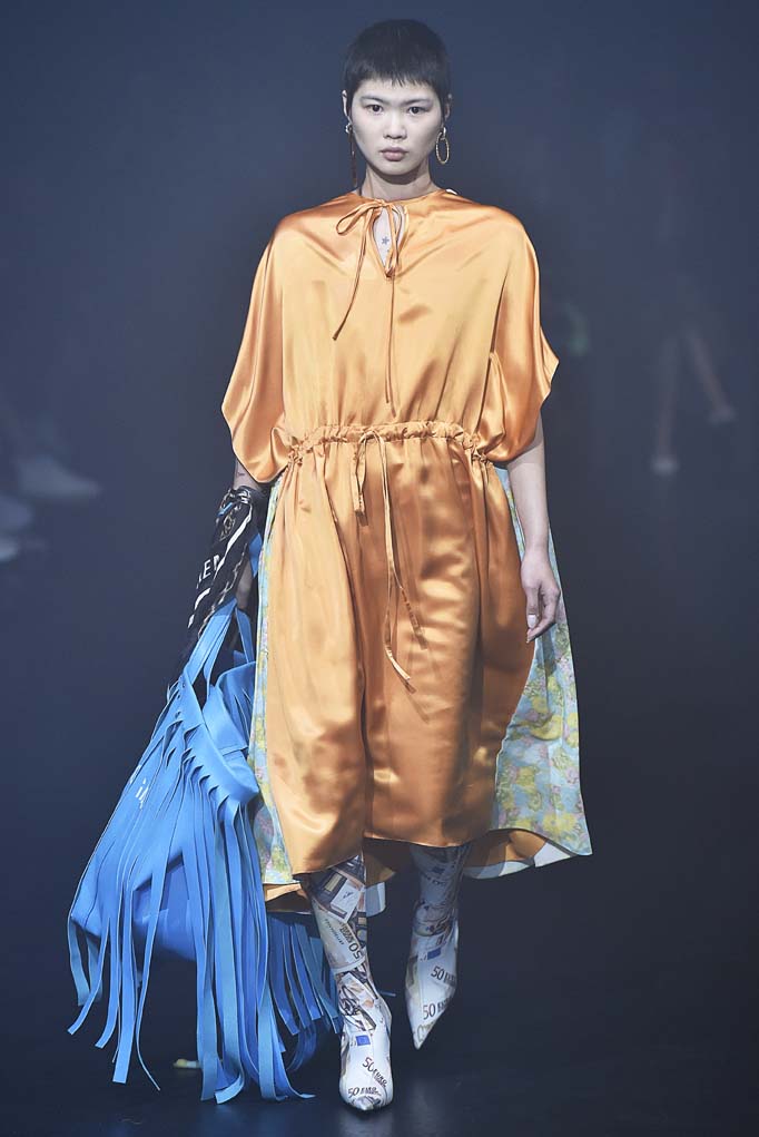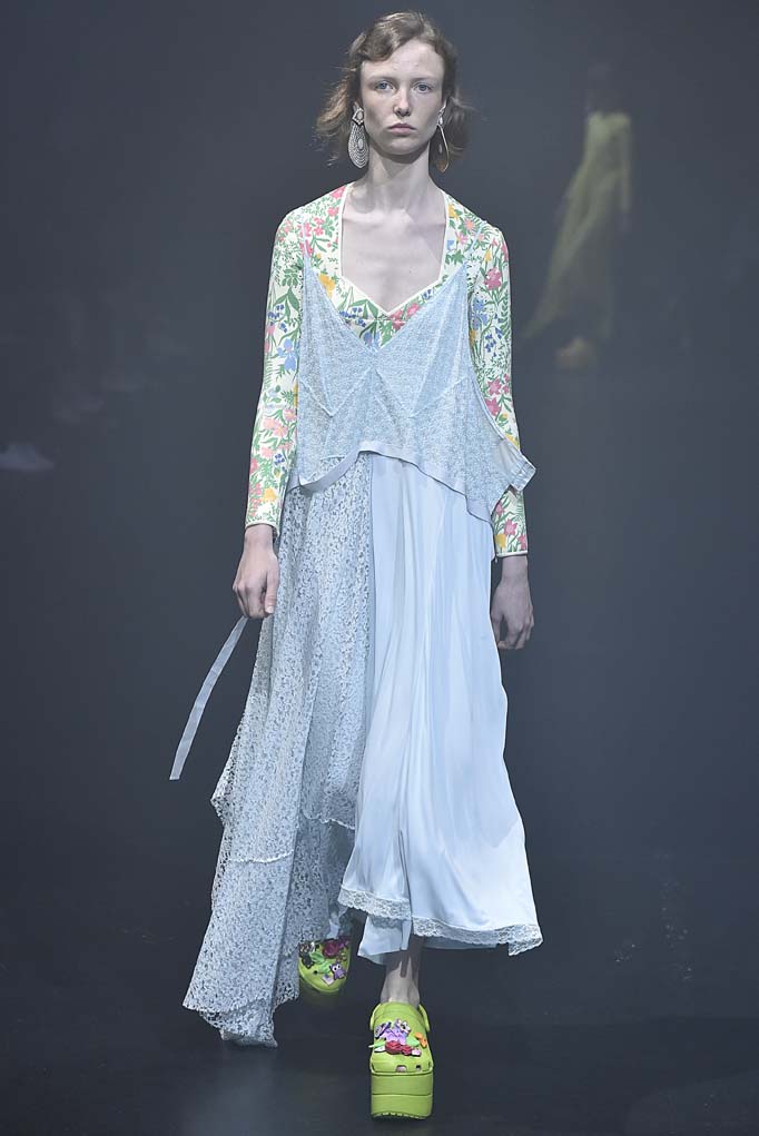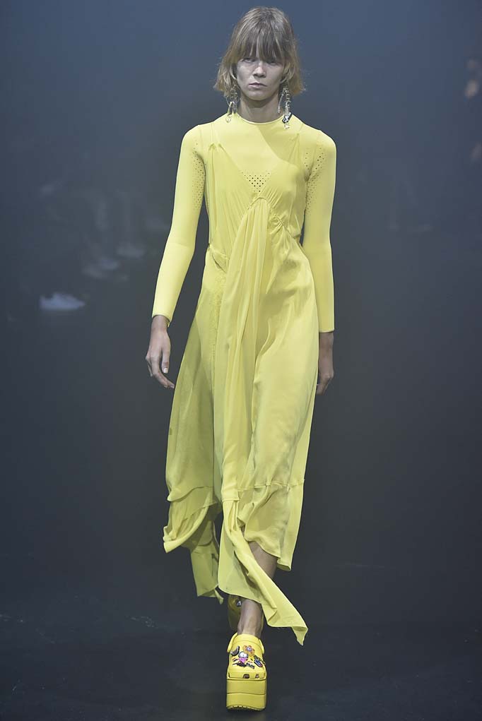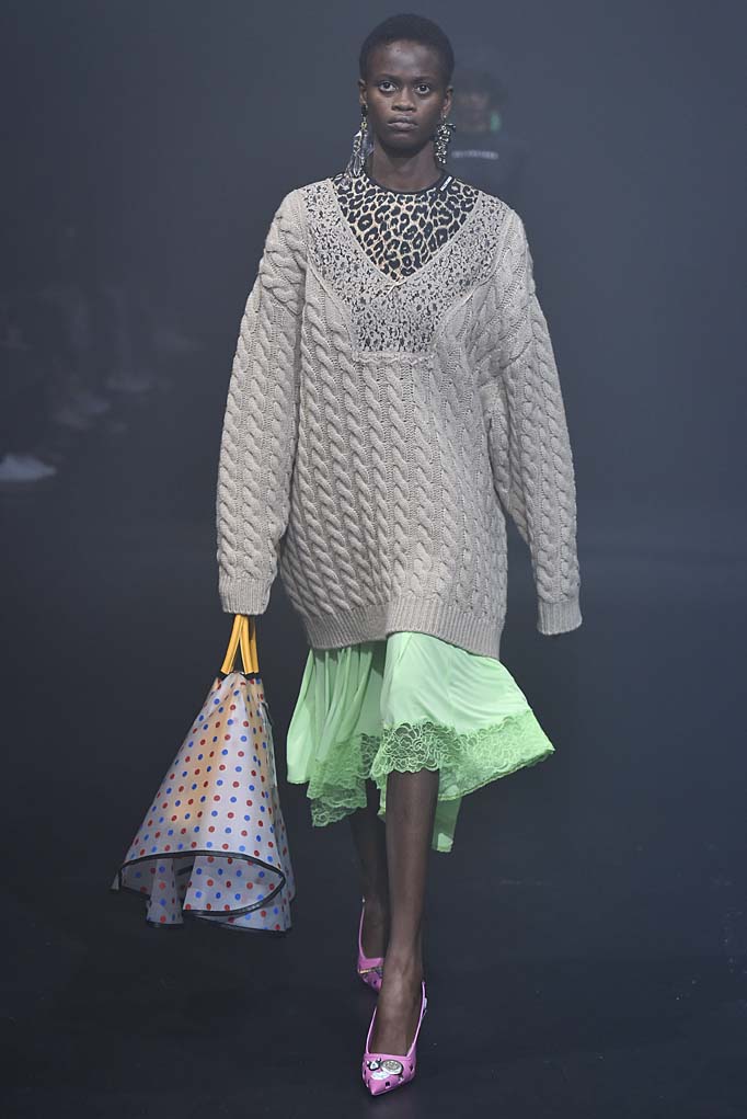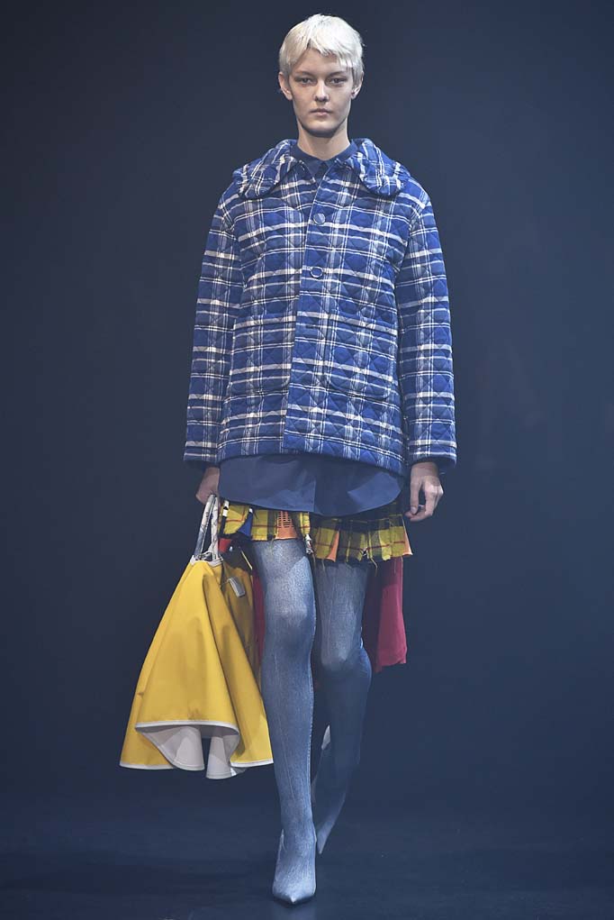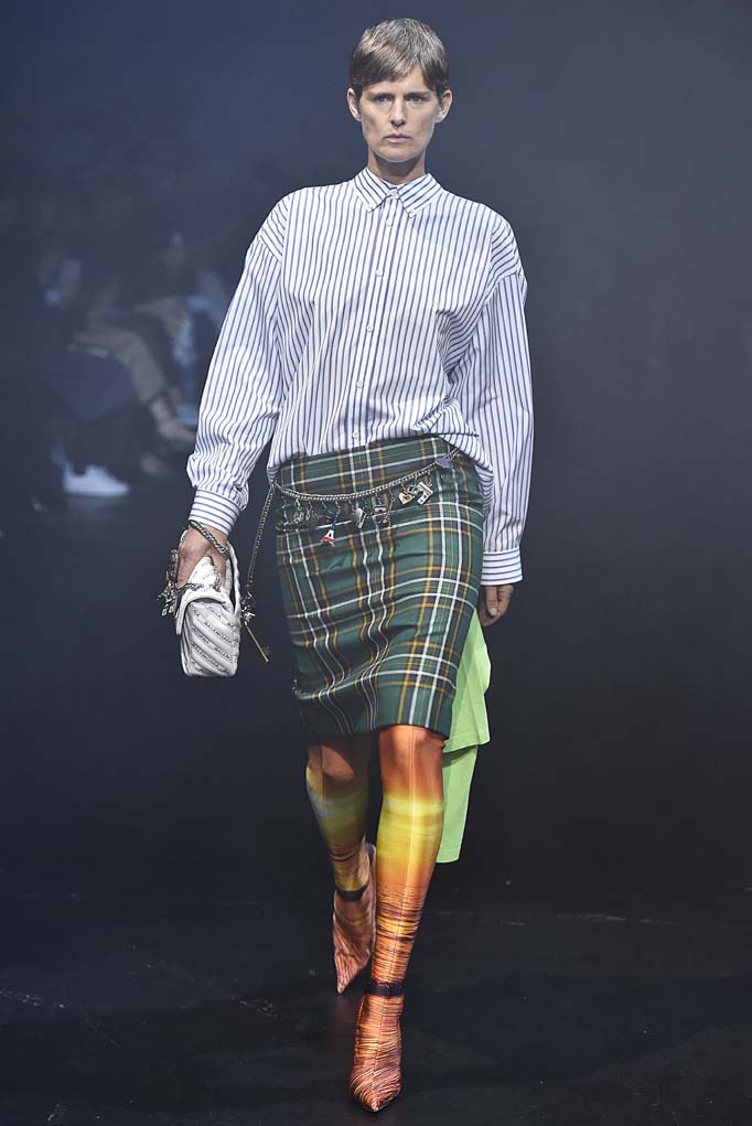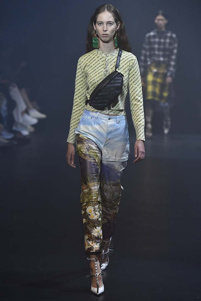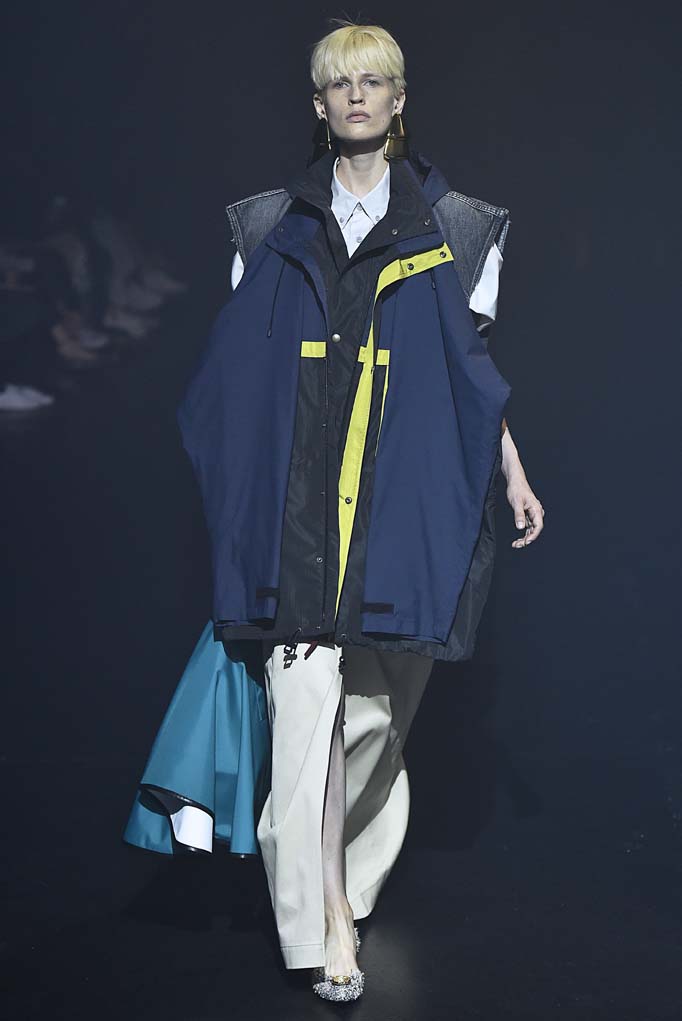 What tricks did Demna Gvasalia have up his sleeves this season? What trend previously thought of as terribly passé did he reinvent? Bugle boy jeans, first of all. A trend—like Juicy Couture tracksuits—we thought would never be revisited. But everything that up until recently has been thought of as gauche is fair game in Gvasalia’s hands. Expect this jarring denim revival to be revived many times over as quickly as the copy cats can reproduce. And then, Gvasalia one-upped Christopher Kane’s croc revival by introducing the platform croc for those that dare. For those that don’t, the spiky stilettos will woo and wow. Raincoats for handbags—the kind of thing you can pick up at The Container Store—were given a high-fashion update. There was a reworking of the punk pant marrying various plaids with houndstooth and pinstripe suiting. The biggest takeaway however was another reworking of the jacket. Here they hung from the necks of the models to be worn as vests and came layered like a melding between a parka and a denim vest. Dresses were worn rolled down to reveal lingerie beneath. This layered dressing was about undressing, but also about versatility in that many of these could be transformed to be a vest or a coat—a trick and a treat. It had everything that die-hard Gvasalia fans will be rushing to be the first to wear.