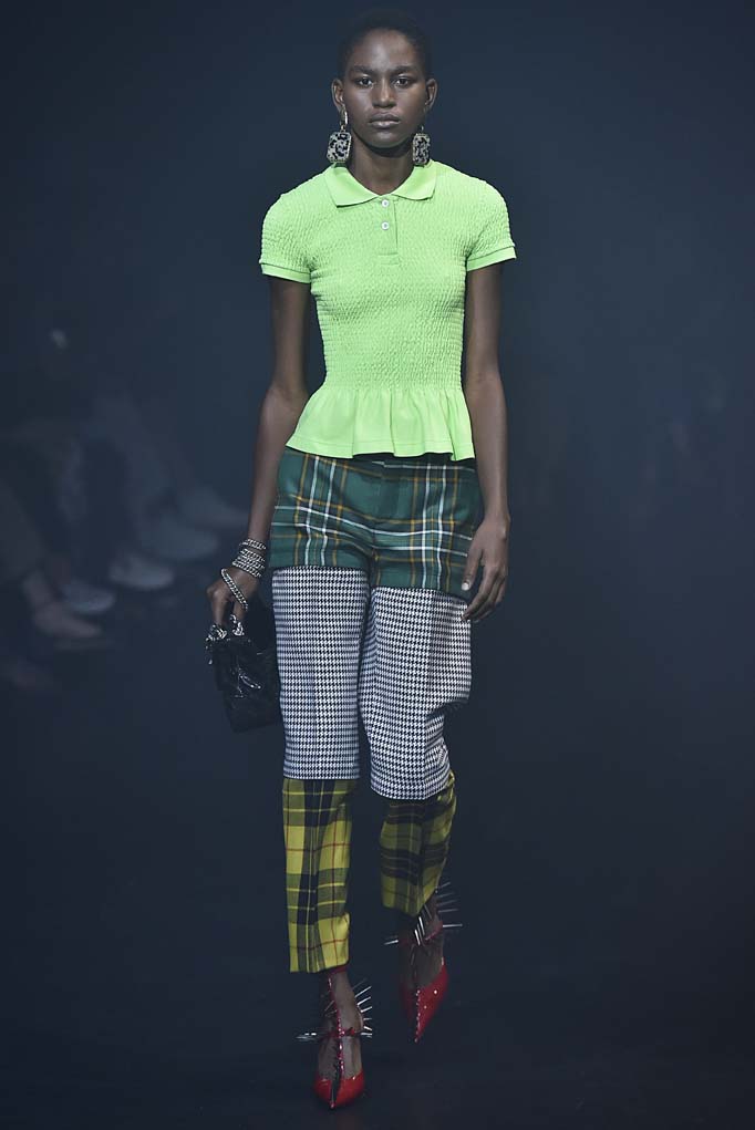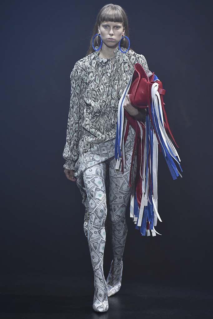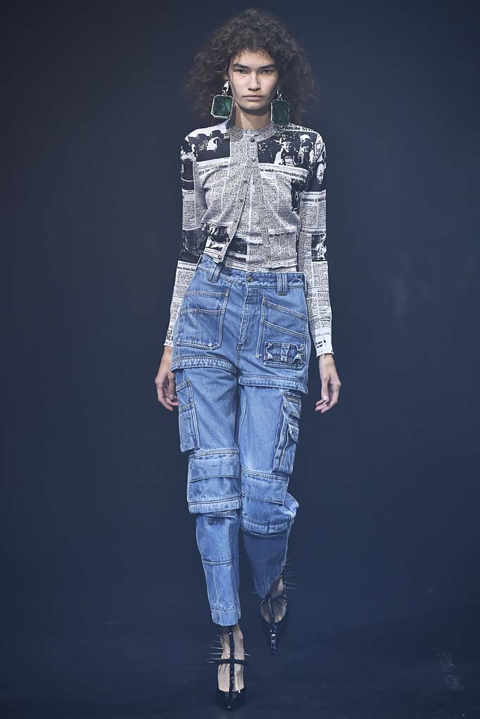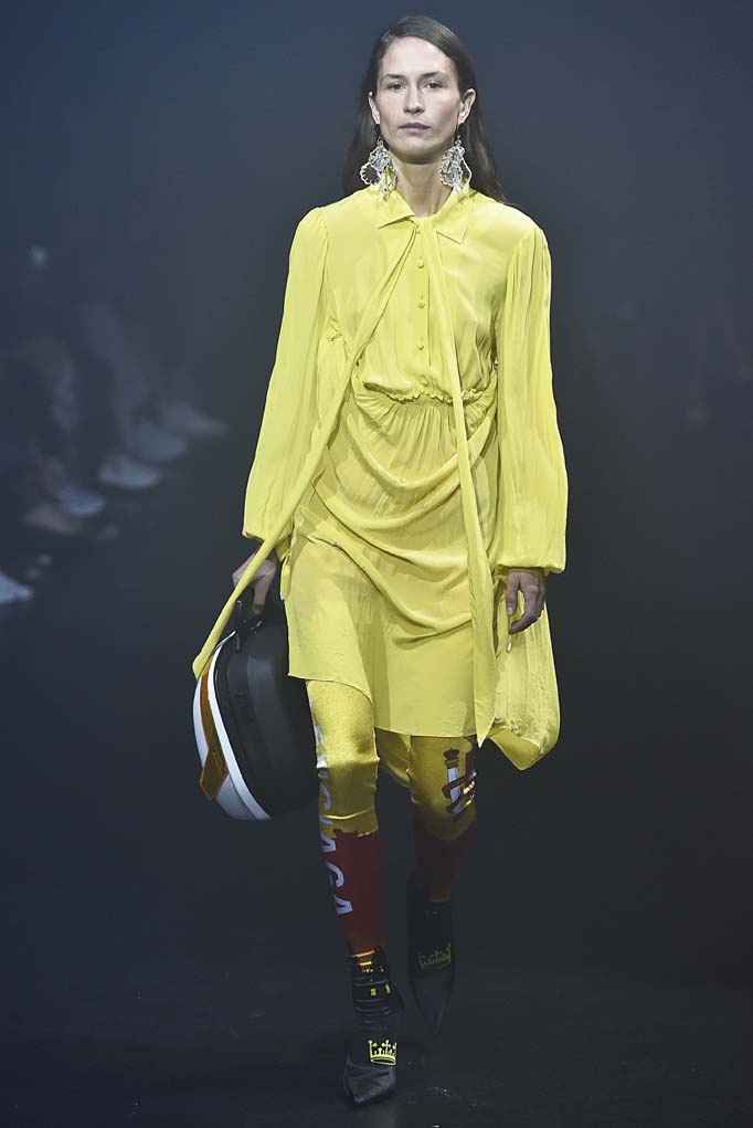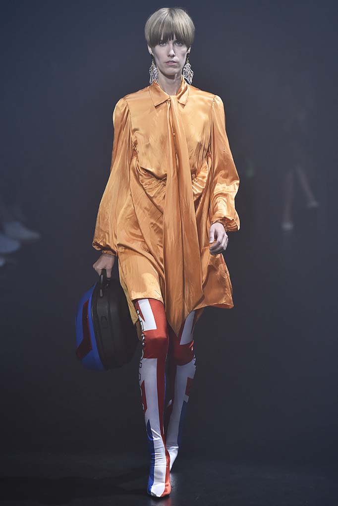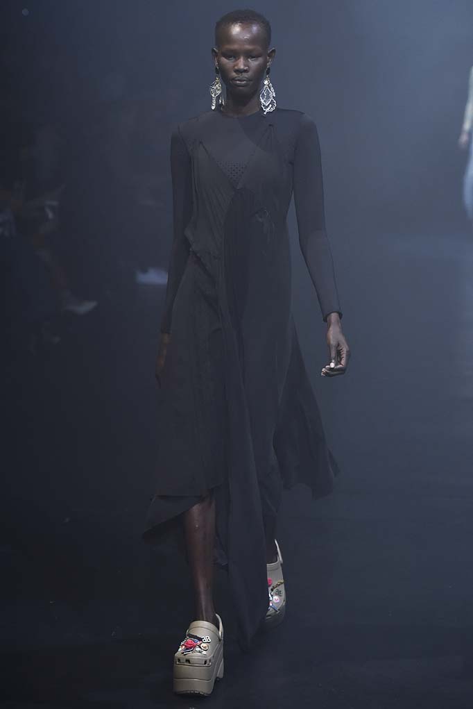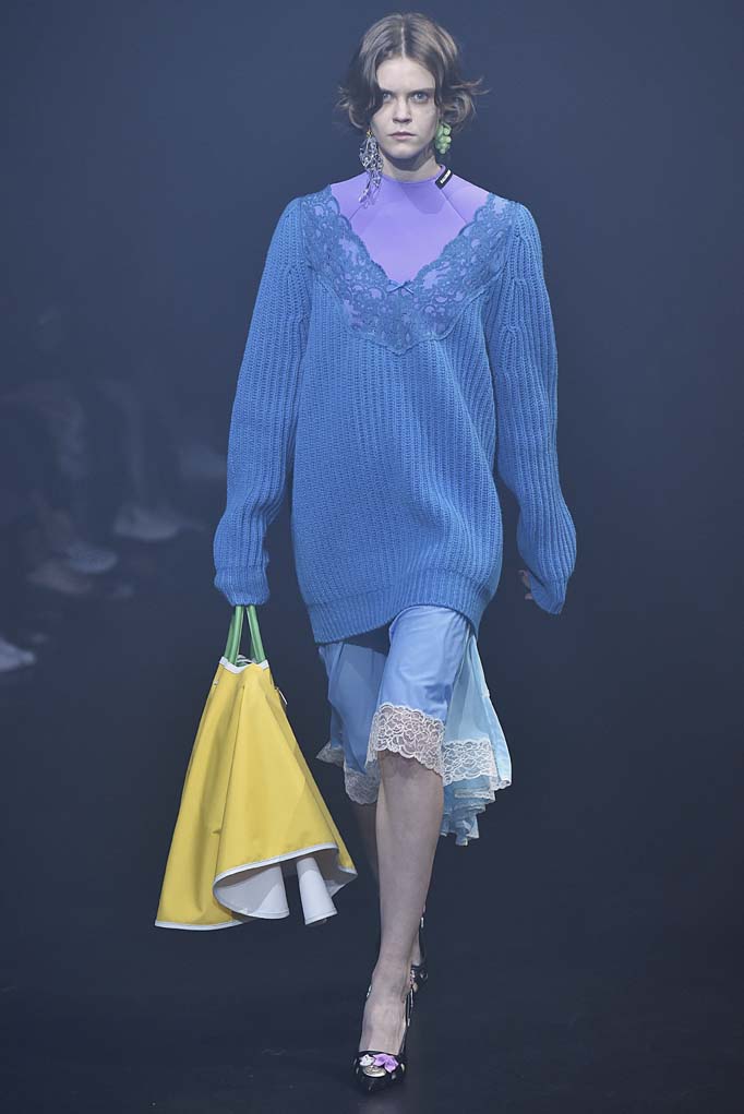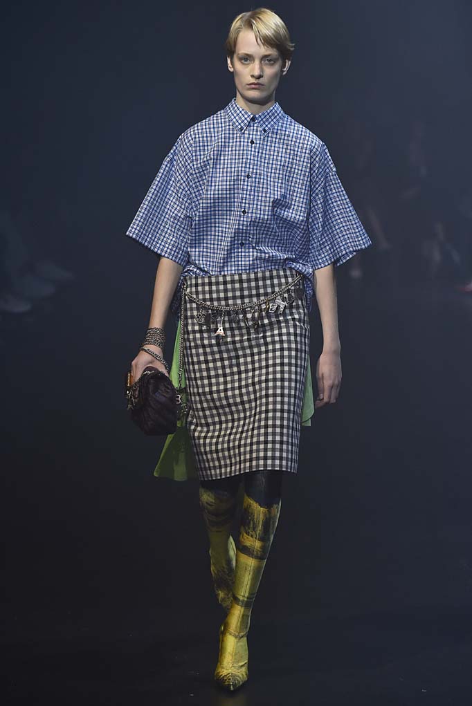 What tricks did Demna Gvasalia have up his sleeves this season? What trend previously thought of as terribly passé did he reinvent? Bugle boy jeans, first of all. A trend—like Juicy Couture tracksuits—we thought would never be revisited. But everything that up until recently has been thought of as gauche is fair game in Gvasalia’s hands. Expect this jarring denim revival to be revived many times over as quickly as the copy cats can reproduce. And then, Gvasalia one-upped Christopher Kane’s croc revival by introducing the platform croc for those that dare. For those that don’t, the spiky stilettos will woo and wow. Raincoats for handbags—the kind of thing you can pick up at The Container Store—were given a high-fashion update. There was a reworking of the punk pant marrying various plaids with houndstooth and pinstripe suiting. The biggest takeaway however was another reworking of the jacket. Here they hung from the necks of the models to be worn as vests and came layered like a melding between a parka and a denim vest. Dresses were worn rolled down to reveal lingerie beneath. This layered dressing was about undressing, but also about versatility in that many of these could be transformed to be a vest or a coat—a trick and a treat. It had everything that die-hard Gvasalia fans will be rushing to be the first to wear.