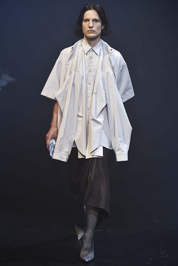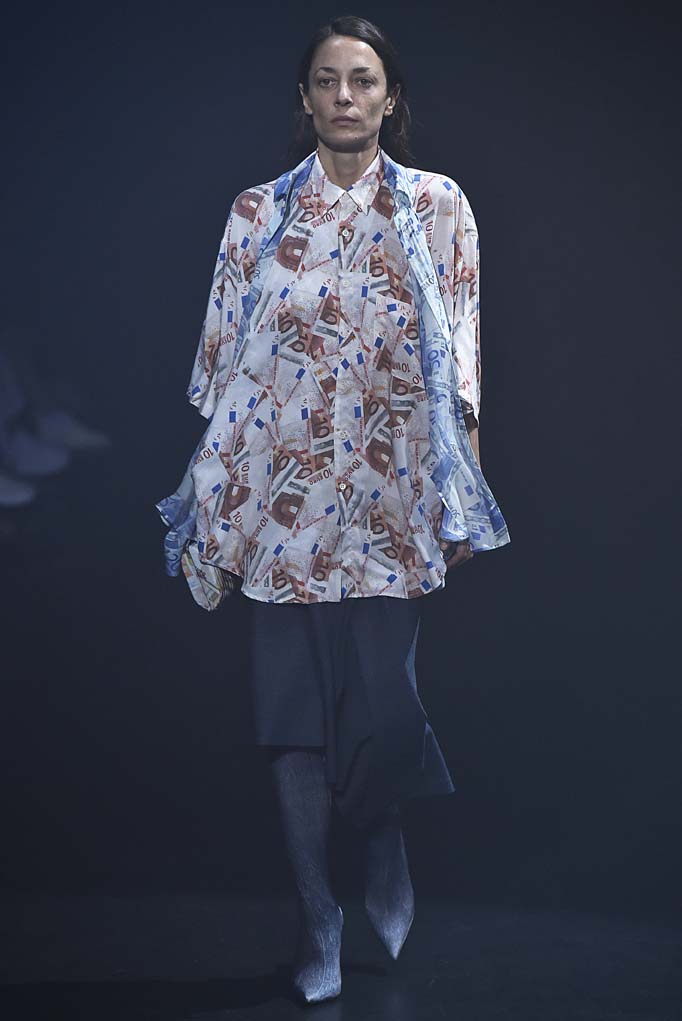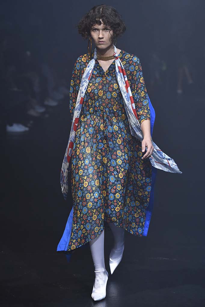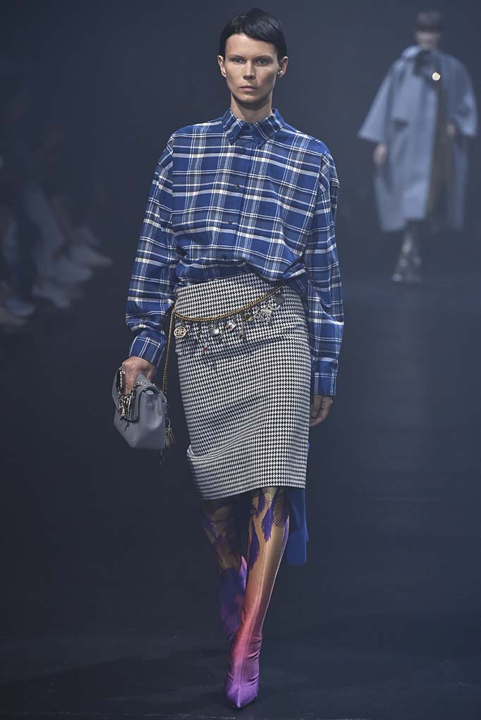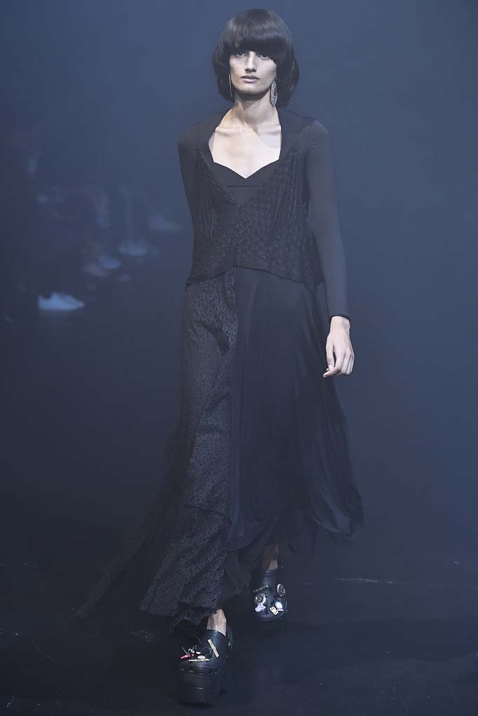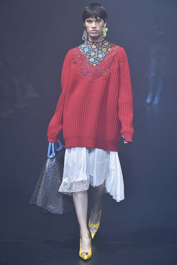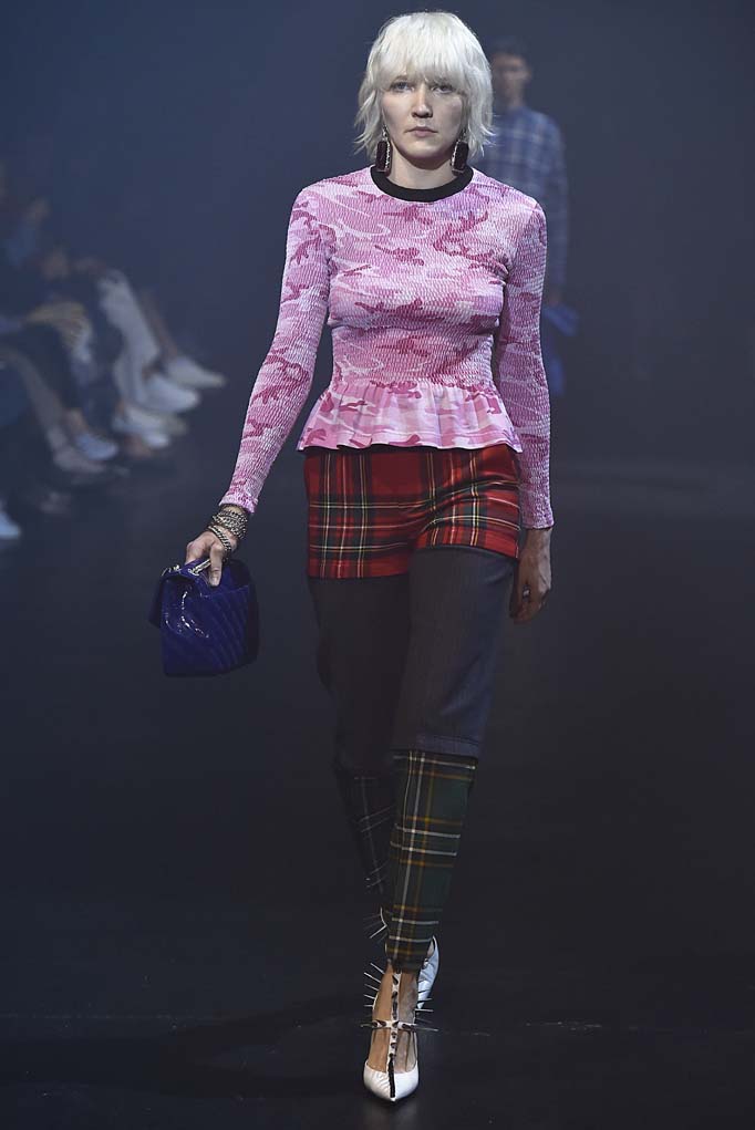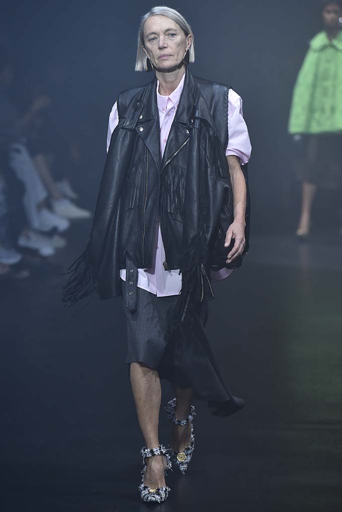 What tricks did Demna Gvasalia have up his sleeves this season? What trend previously thought of as terribly passé did he reinvent? Bugle boy jeans, first of all. A trend—like Juicy Couture tracksuits—we thought would never be revisited. But everything that up until recently has been thought of as gauche is fair game in Gvasalia’s hands. Expect this jarring denim revival to be revived many times over as quickly as the copy cats can reproduce. And then, Gvasalia one-upped Christopher Kane’s croc revival by introducing the platform croc for those that dare. For those that don’t, the spiky stilettos will woo and wow. Raincoats for handbags—the kind of thing you can pick up at The Container Store—were given a high-fashion update. There was a reworking of the punk pant marrying various plaids with houndstooth and pinstripe suiting. The biggest takeaway however was another reworking of the jacket. Here they hung from the necks of the models to be worn as vests and came layered like a melding between a parka and a denim vest. Dresses were worn rolled down to reveal lingerie beneath. This layered dressing was about undressing, but also about versatility in that many of these could be transformed to be a vest or a coat—a trick and a treat. It had everything that die-hard Gvasalia fans will be rushing to be the first to wear.