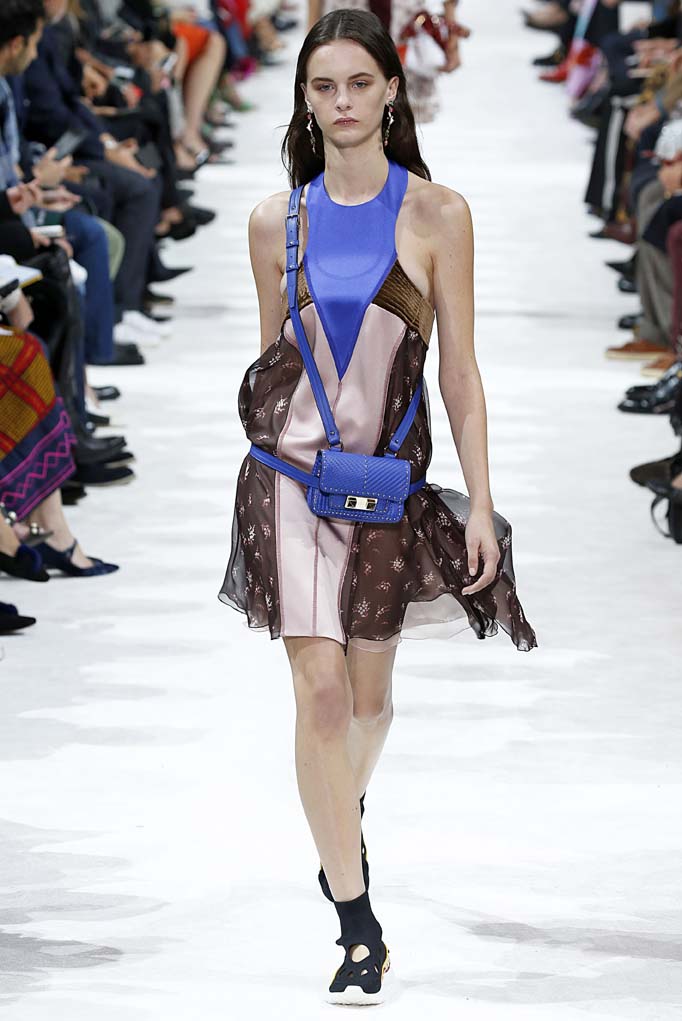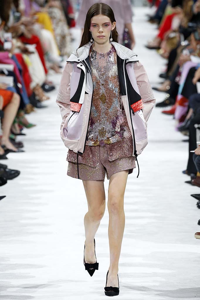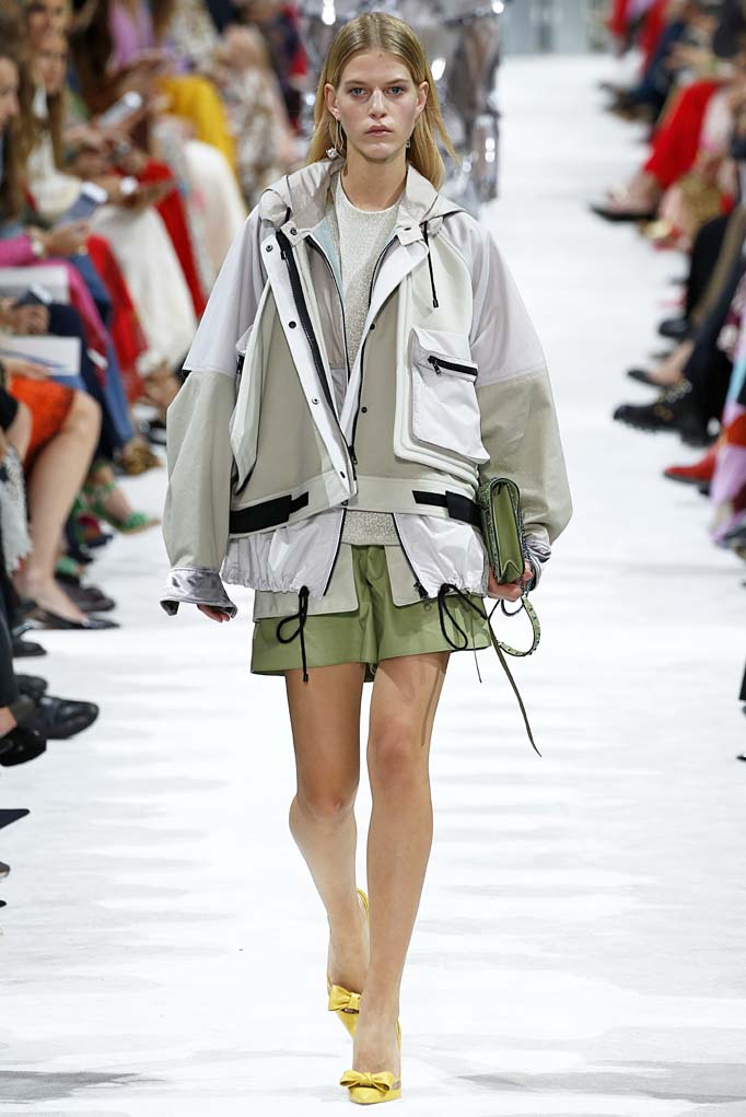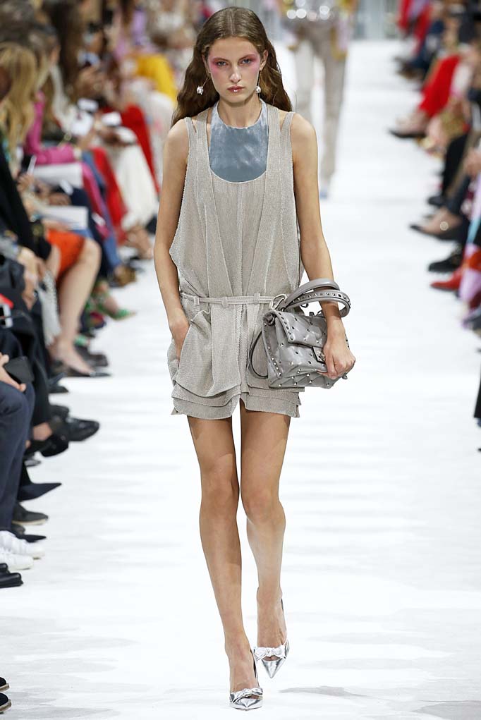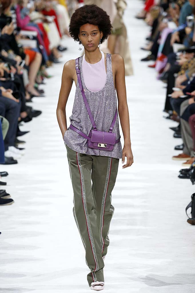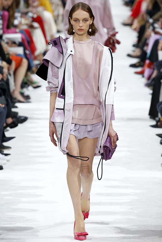 While one does miss the incredible opulence of Valentino’s Renaissance gowns, Pierpaolo Piccioli is clearly aware that while the modern woman still loves to dream and get dressed up that even the most elite women must have practical high-design in their wardrobes too. The Apollo moon landing served up some seriously cool moto-style plastic jackets adorned in sequins. Sportswear was a major theme with Piccioli reworking the anorak in multiple versions, pairing them with shorts, miniskirts, and heels. Even a pair of pants that looked like they might zip off at the knee to become shorts looked like the kind of thing that would normally be Patagonia territory. However, you won’t find these pricey pieces climbing any mountain ranges unless it’s by helicopter, darlings. There was even an ultra-chic Safari trench for the Sahara inclined. But this headlong dive into sportiness did not forsake the Valentino gown or cocktail number. There was a luscious Valentino red velvet evening gown and a silk eggplant number both resplendent in their simplicity, a sexy little blush bubbled cocktail dress, and an immaculate, one-shouldered pale pink ruffled gown à la ’80s Valentino that closed the show. Everything, sporty or otherwise, was thoroughly rich. And to further drive home versatility, Piccioli paired bags with straps around the shoulders and waist (arms free!) with evening gowns—for Safaris and galas alike!