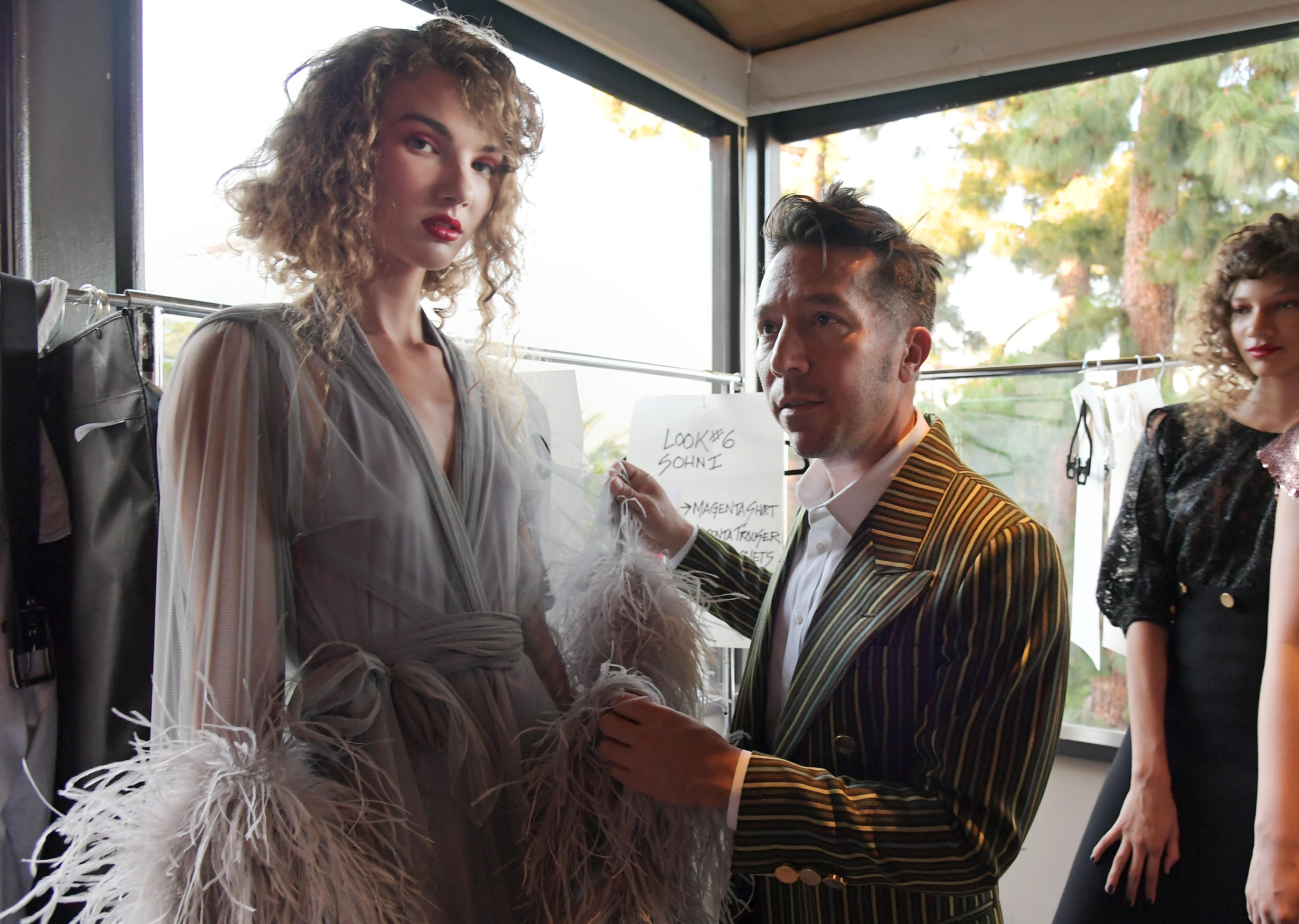 West Coast designers (and former New Yorkers) Brian Wolk and Claude Morais showed their 5th collection at famed venue Yamashiro in Hollywood last night. This time they turned to names like Dietrich and Travolta and Hollywood’s portrayal of gender archetypes and antitypes as the aesthetic foundation. “For our feather looks we were honored to work with Catherine D’lish, an incredible burlesque performer known for her unique ability to craft magnificent feather creations. For the color palette of the collection we did a deep dive into the photography of Sheila Metzner, it all started with a picture she took of Molly Ringwald in a floral suit,” Wolk told The Daily. “This image led on us on a super exciting journey through her extraordinary work. There was also a nod to street culture of Melrose Avenue where we often spend our Saturdays taking in its distinct youth culture, and it’s rock/punk jewelry sensibility, which inspired our gold link suspenders and chains, which we made specially made for the collection.”