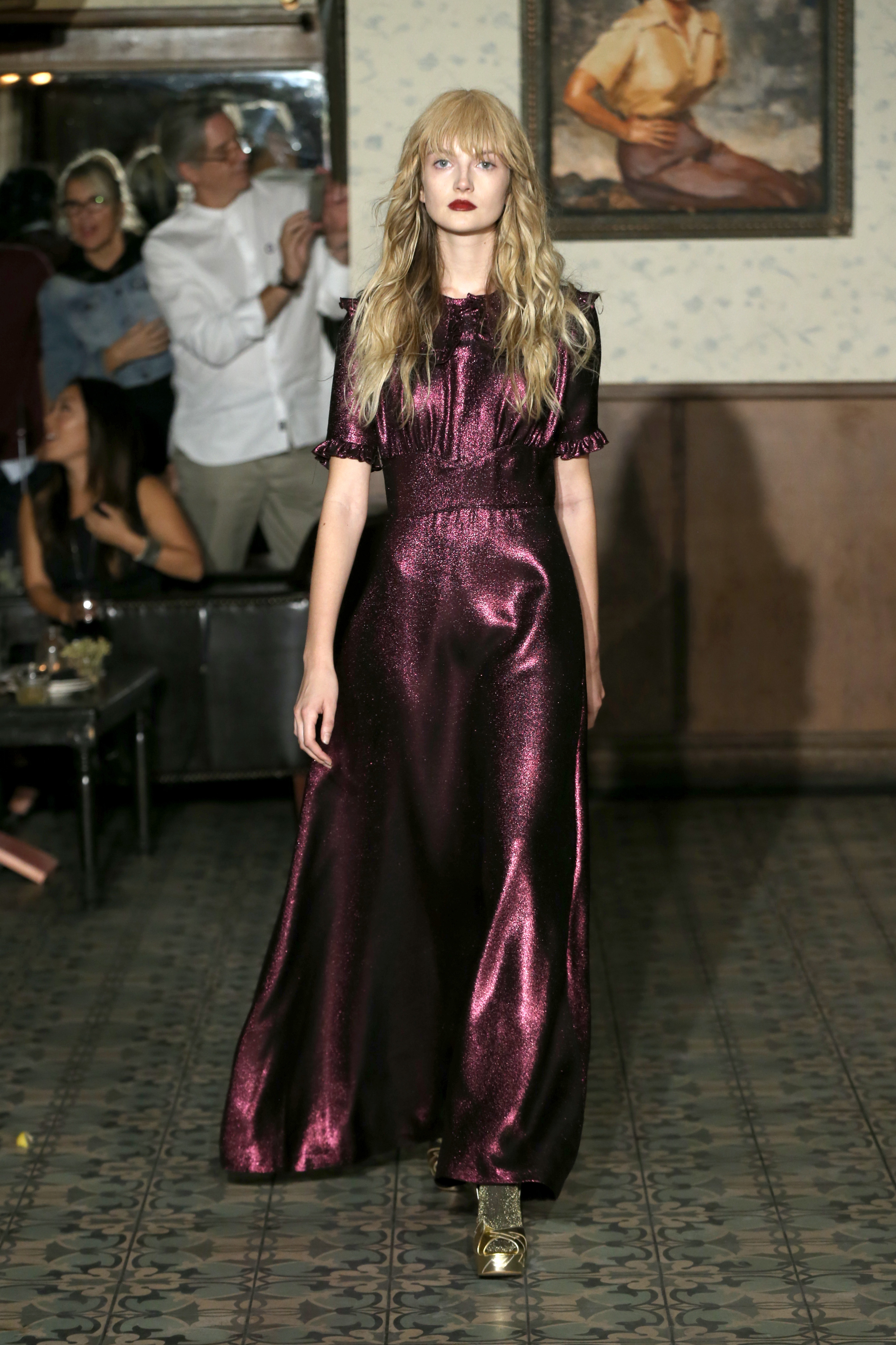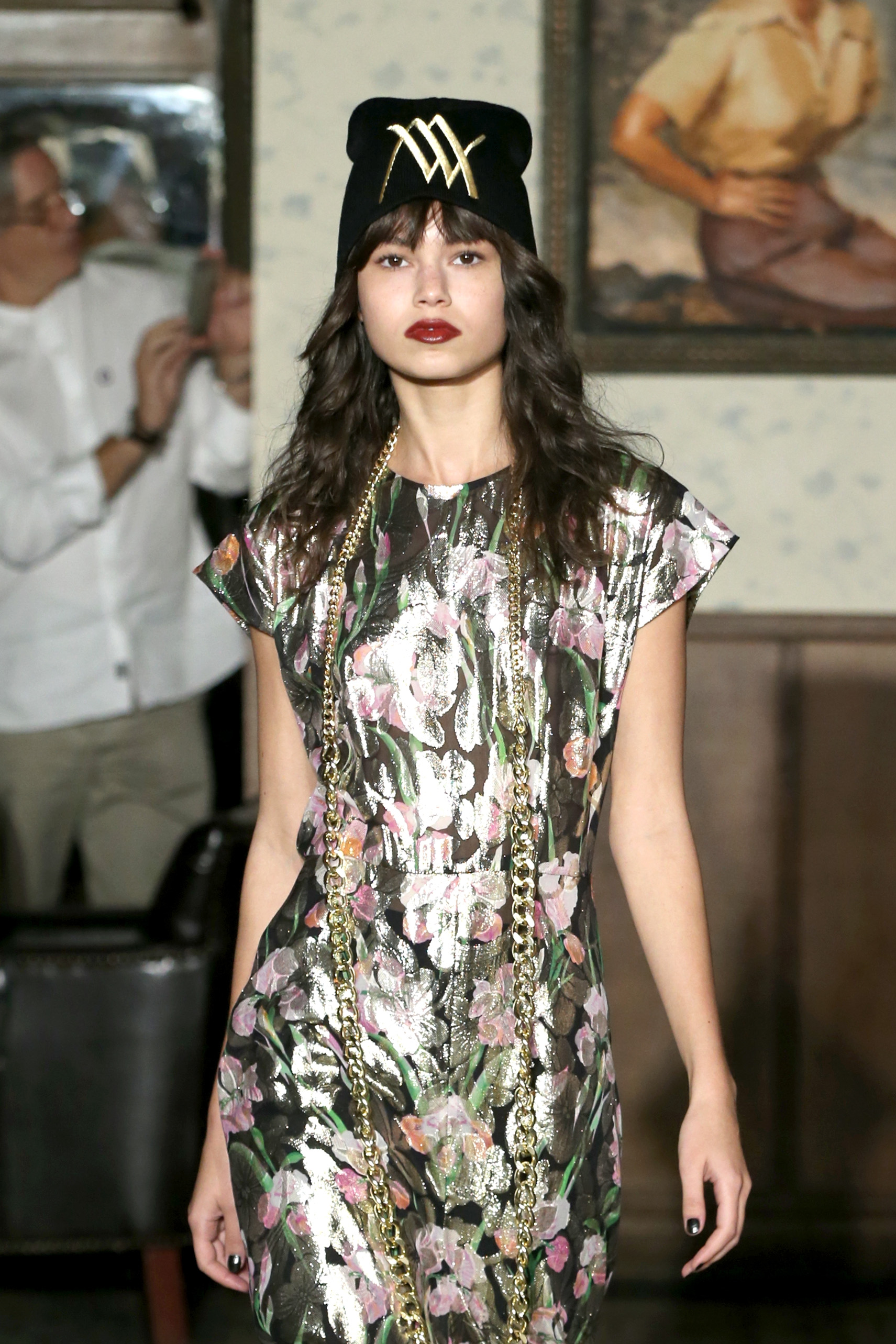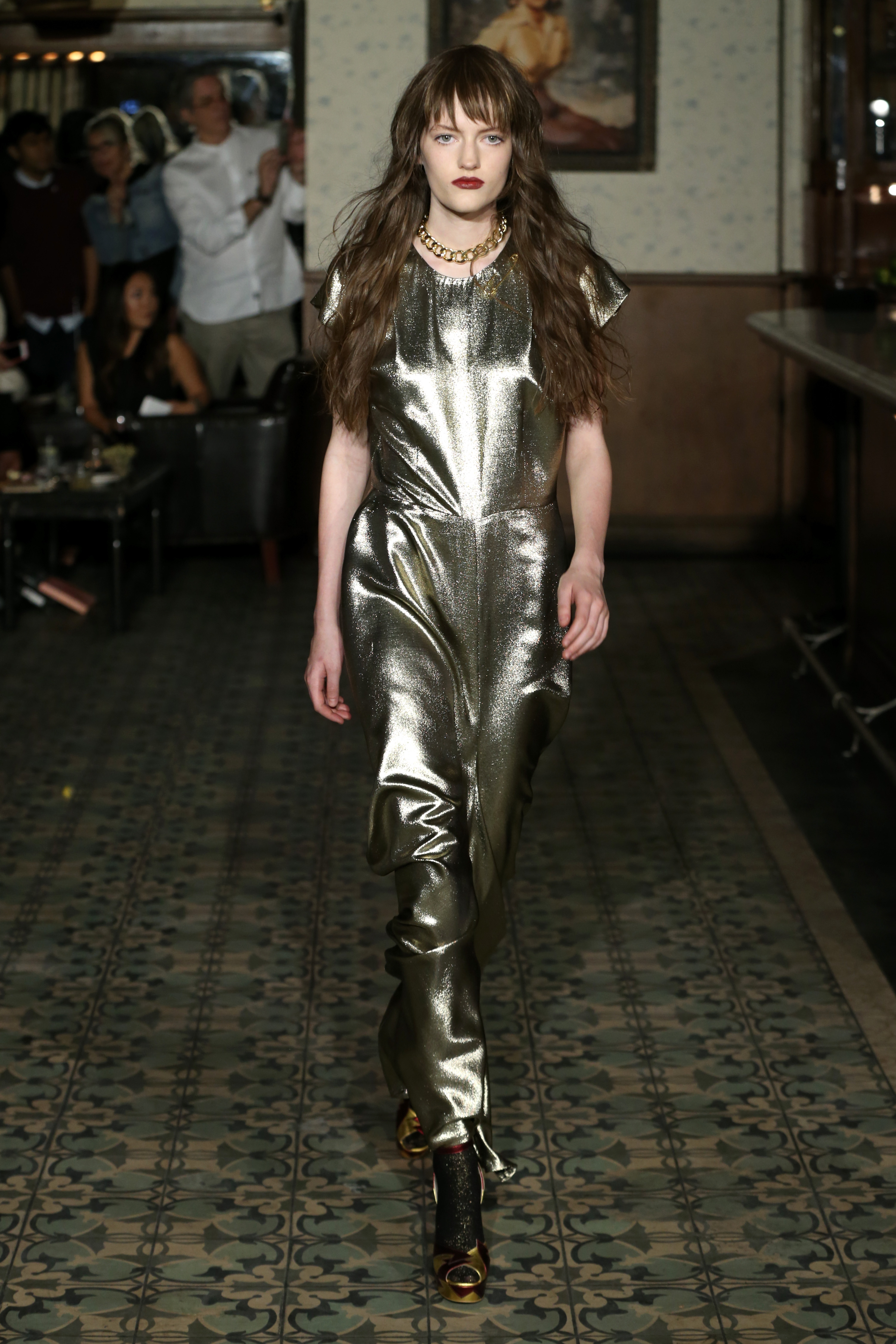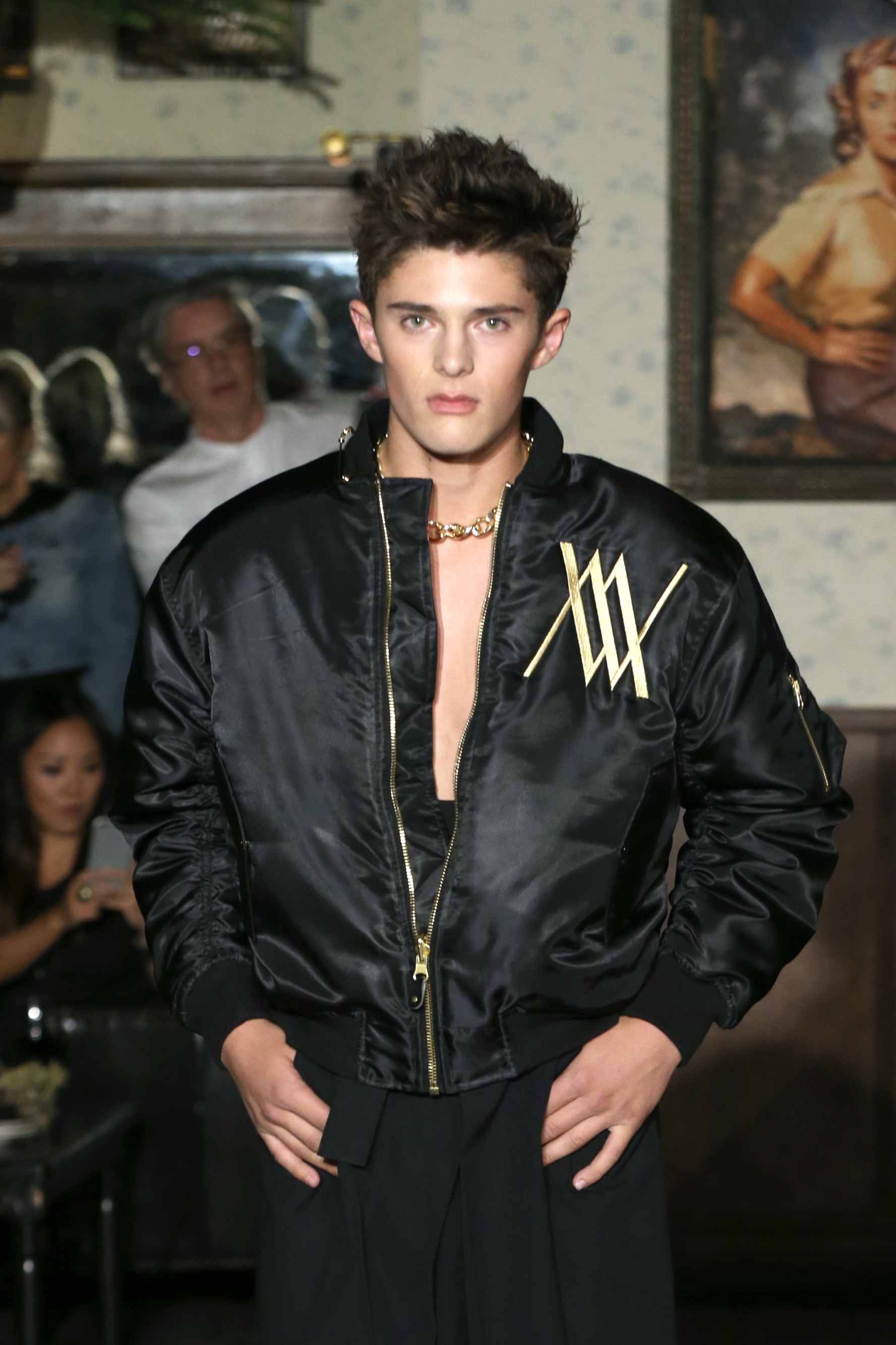 The boys once again turned to stylist Elizabeth Stewart, who gave models bangs and long gold necklaces on the runway. The election was addressed, and mods wore large safety pins, which have become an anti-Trump symbol. Wolk Morais also debuted its first logo, which united the letters W and M in gold. An enthusiastic crowd of next generation ingenues sitting front row included Marta Pozzan, Harley Quinn Smith, Chandler Kinney, and Claudia Lee. Partners for the show included Visit Weho, cocktails by Drambuie, hair by Paul Mitchell, makeup by Bite Beauty, and shoes by Terry de Havilland. The show was also the brand’s second alliance with TEEN CANCER AMERICA. The designers created a cloisonné pin especially for the occassion.