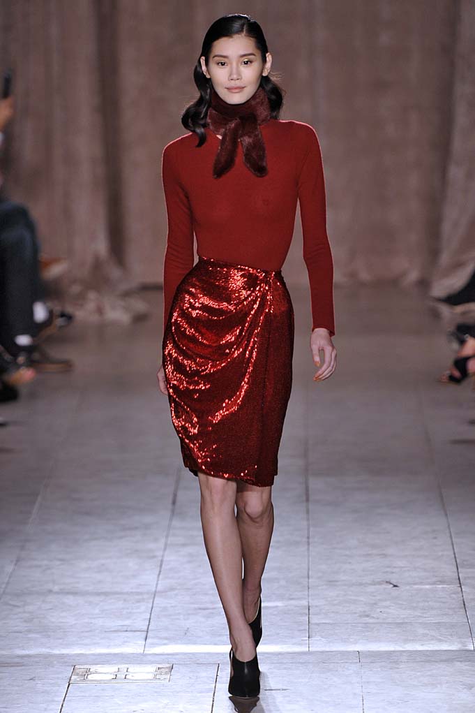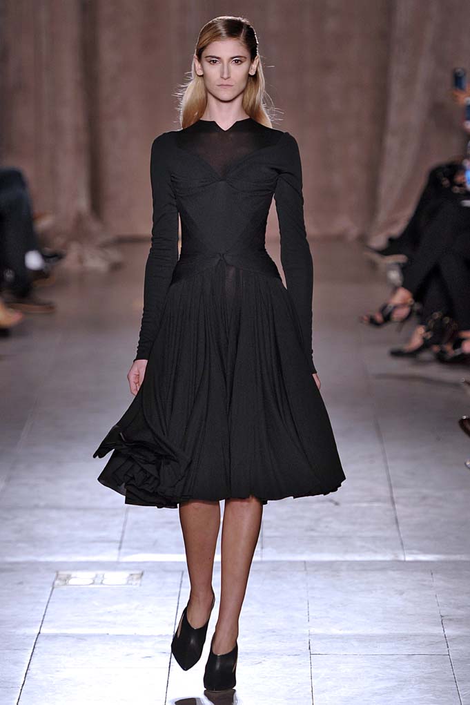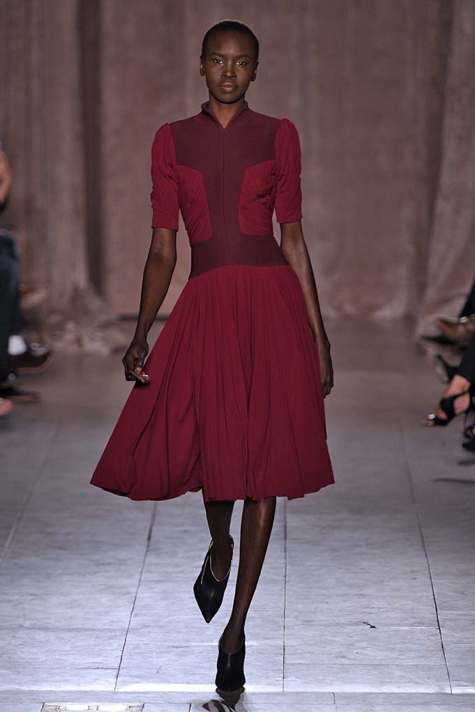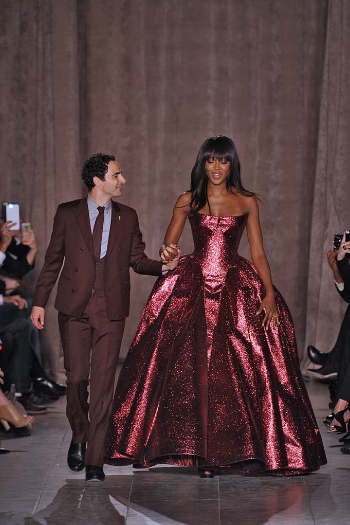 When Naomi Campbell closes a show in a Cinderella-esque sparkly pink ball gown, that’s a real fashion moment. Cheers and a standing ovation ensued at Zac Posen. Plus! Pleated flowing silks were stunning on a golden skirt, and on a forest green dress with cut-outs worn by muse Anna Cleveland (fittingly, she twirled down the runway in the fluid frock). Posen knows how to create the kind of glamour that little girls and grown women alike dream of.