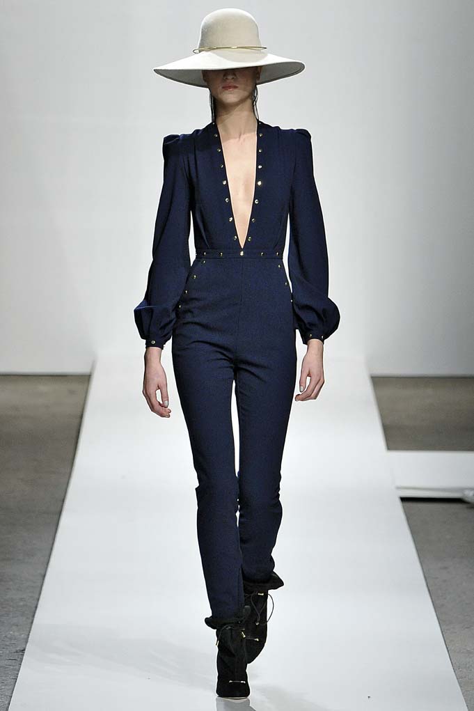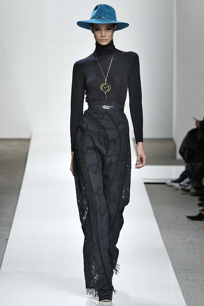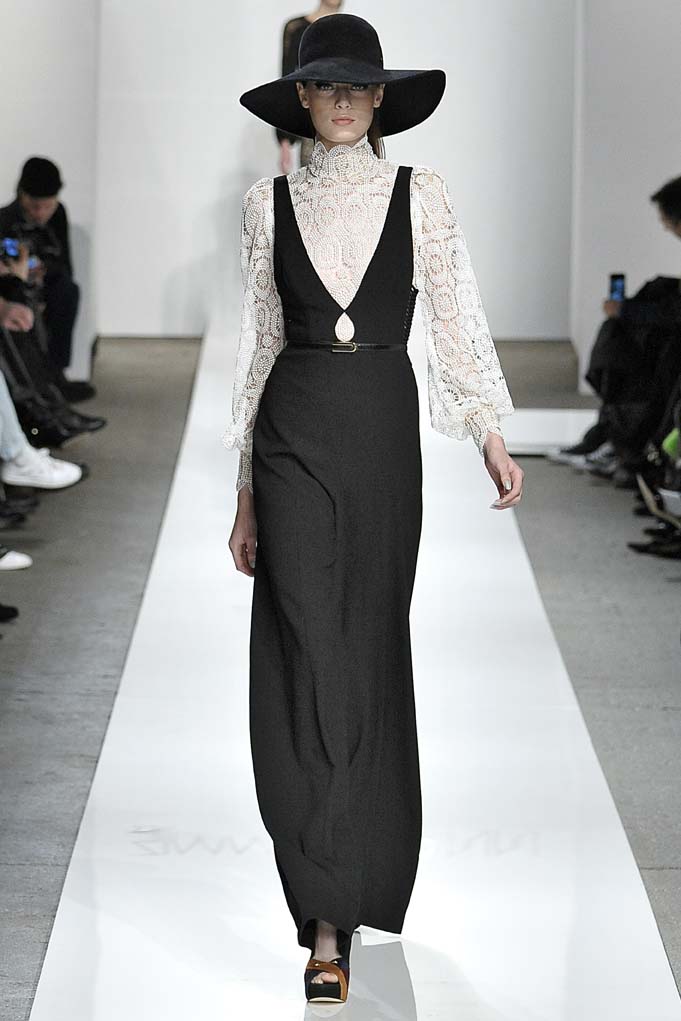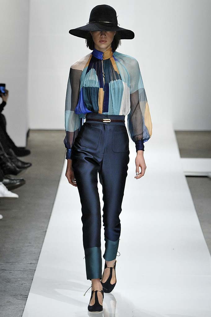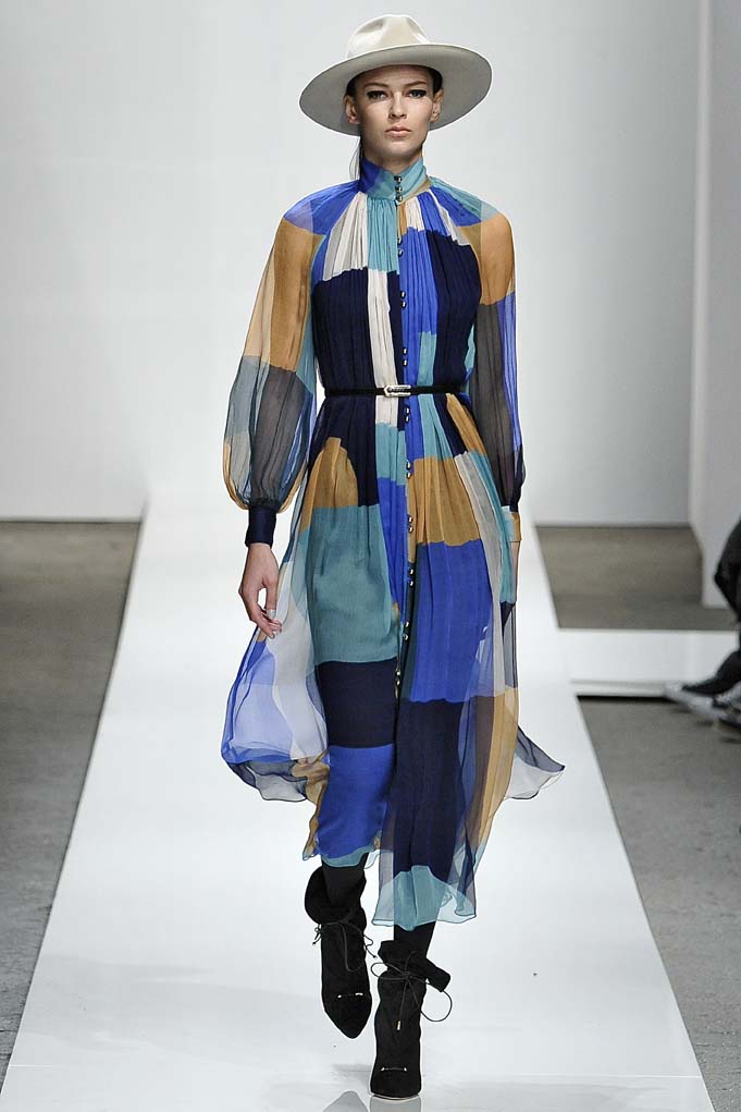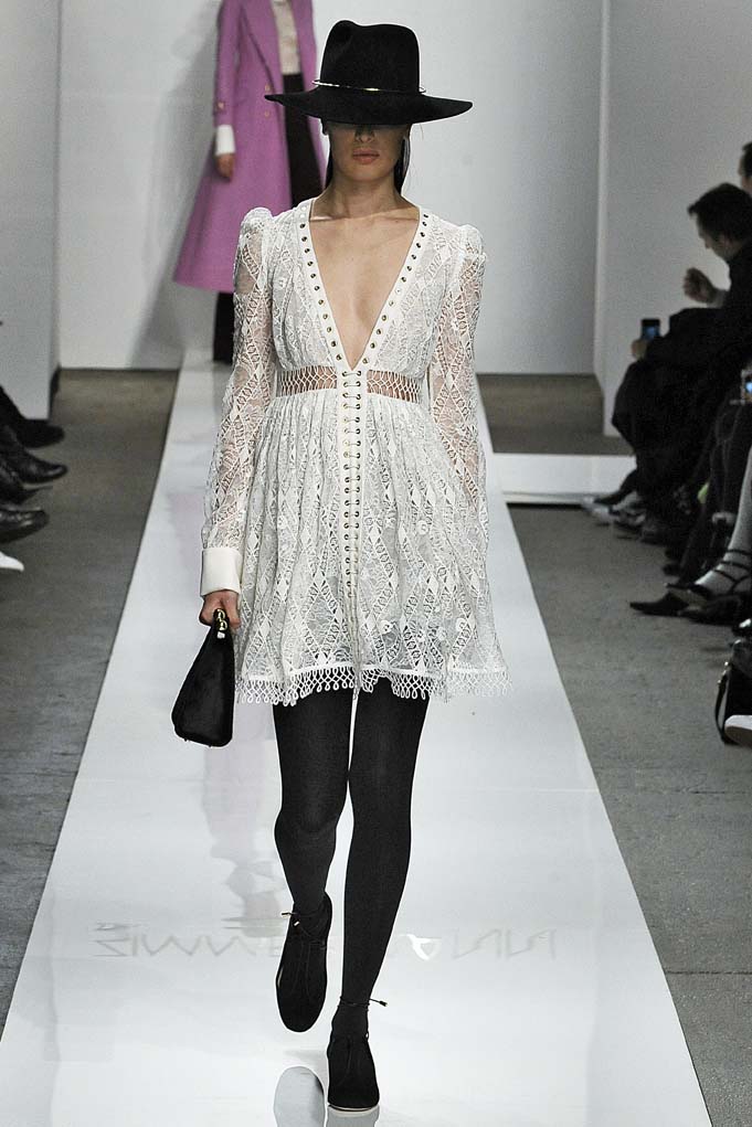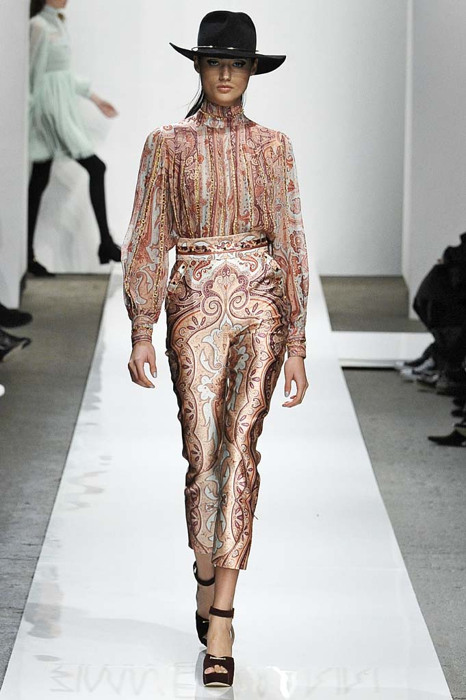 Zimmermann’s palette of rich hues certainly warmed up a very frigid second day of NYFW. Drawing inspiration from interior designs of the ‘60s, and incorporating silhouettes that nodded at the ‘70s, designers Nicky and Simone Zimmermann showcased their fall/winter collection, which felt effortlessly cool. “It was really pretty crazy back here, and you have no idea what’s going on out there,” Nicky Zimmermann told us post-show. “I just remember being on my knees, tying things up.” The effort paid off! On offer this season: tailored trousers and wool coats, high-waisted bell-bottoms, lace details, and plenty of paisley printed dresses that ring in old-school-meets-bohemian vibes. And let’s not forget those oversized hats that topped many of the looks, catching the eyes of front row folks like Jessica Szohr, Olivia Palermo, Jessica Hart, and Rachel Roy, who observed from the front row.